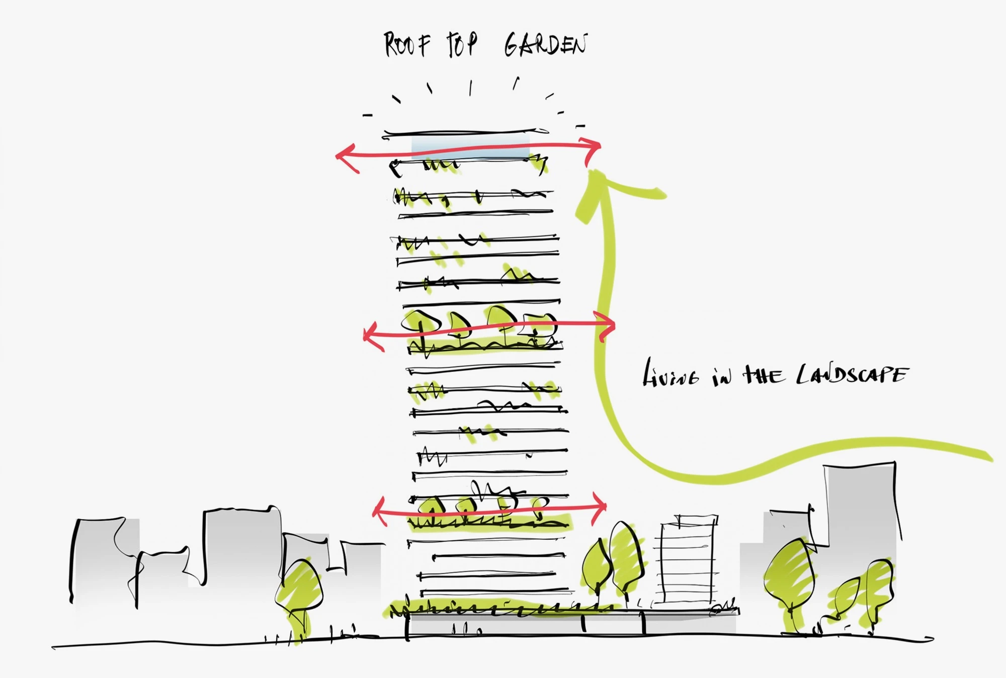 The concept integrates the 30-meter heritage hotel with a 120-meter modern tower to the rear, connecting the two with a unifying platform that frames a suspended garden. This “line” separates the ground floor from the two structures, breathing life into both buildings, each of which possesses its own distinctive character while sharing a single, welcoming foyer. Shaped to respect plot boundaries and to minimize any overshadowing of the existing hotel, the tower’s terraces create a dynamic movement along the façade, and the two MEP floors introduce greenery, adding rhythm and enhancing the vertical flow.