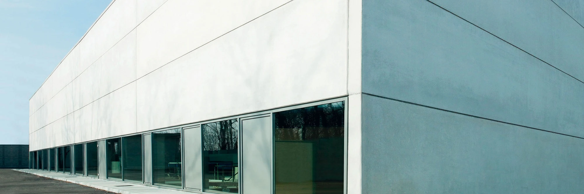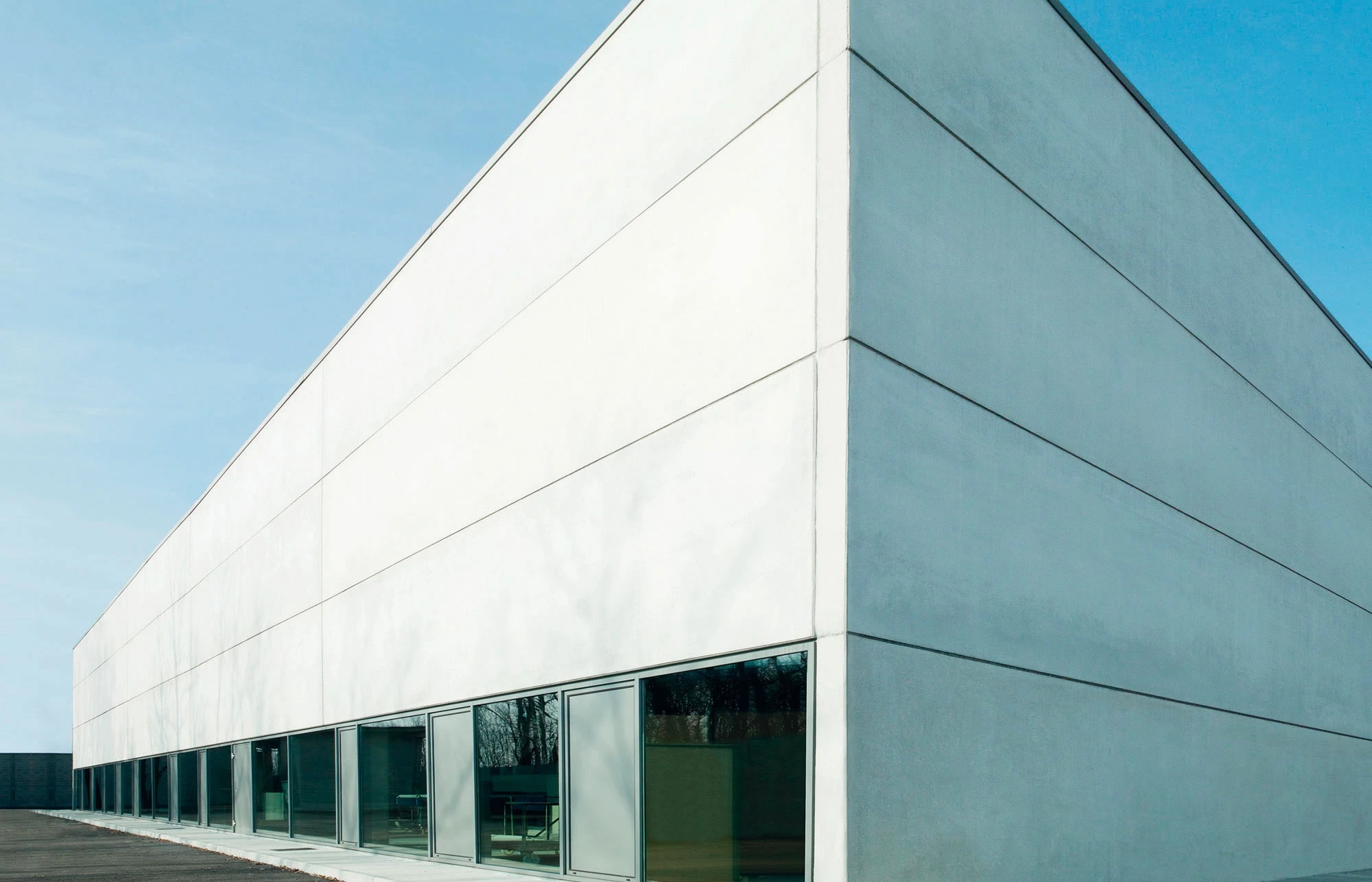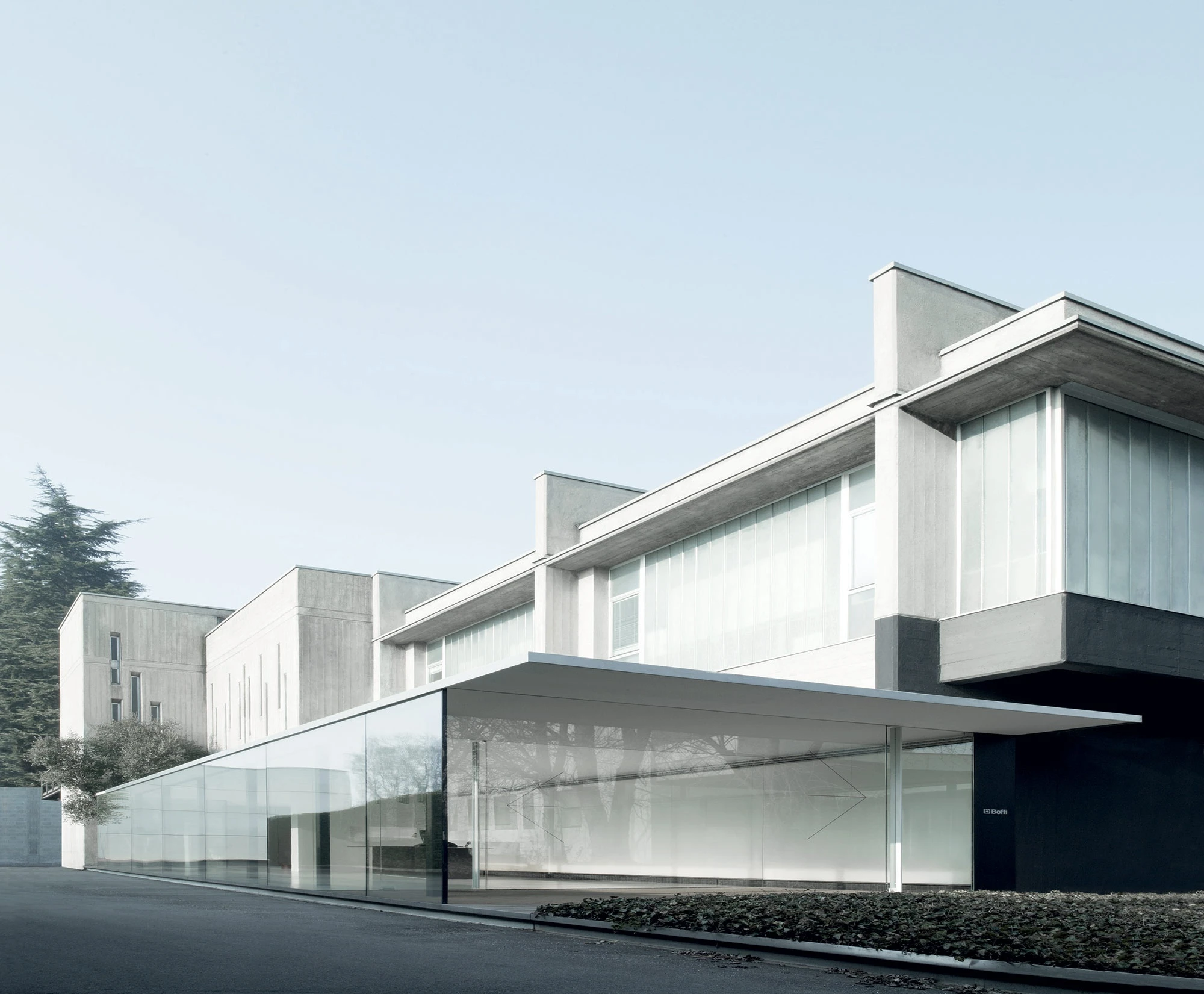 In 1999, Lissoni began working on plans to expand the existing Boffi's headquarters and plant located in the northern Italian city of Lentate sul Seveso. The main aim was to establish a paint shop, security area, warehouse and reception area. The first building phase produced the reception area, which was finished in April 2008. The glass-encased, puristic steel construction was added directly onto the old building. The roof and narrow base are flush with the large glass windows on the sides, and these two components extend past the windows on the right and thus form a sheltered entrance area that is also marked by a large red arrow. Visitors are welcomed at a massive and heavy table made of six welded metal plates which is placed in front of a glass wall within this indirectly lit entry area.