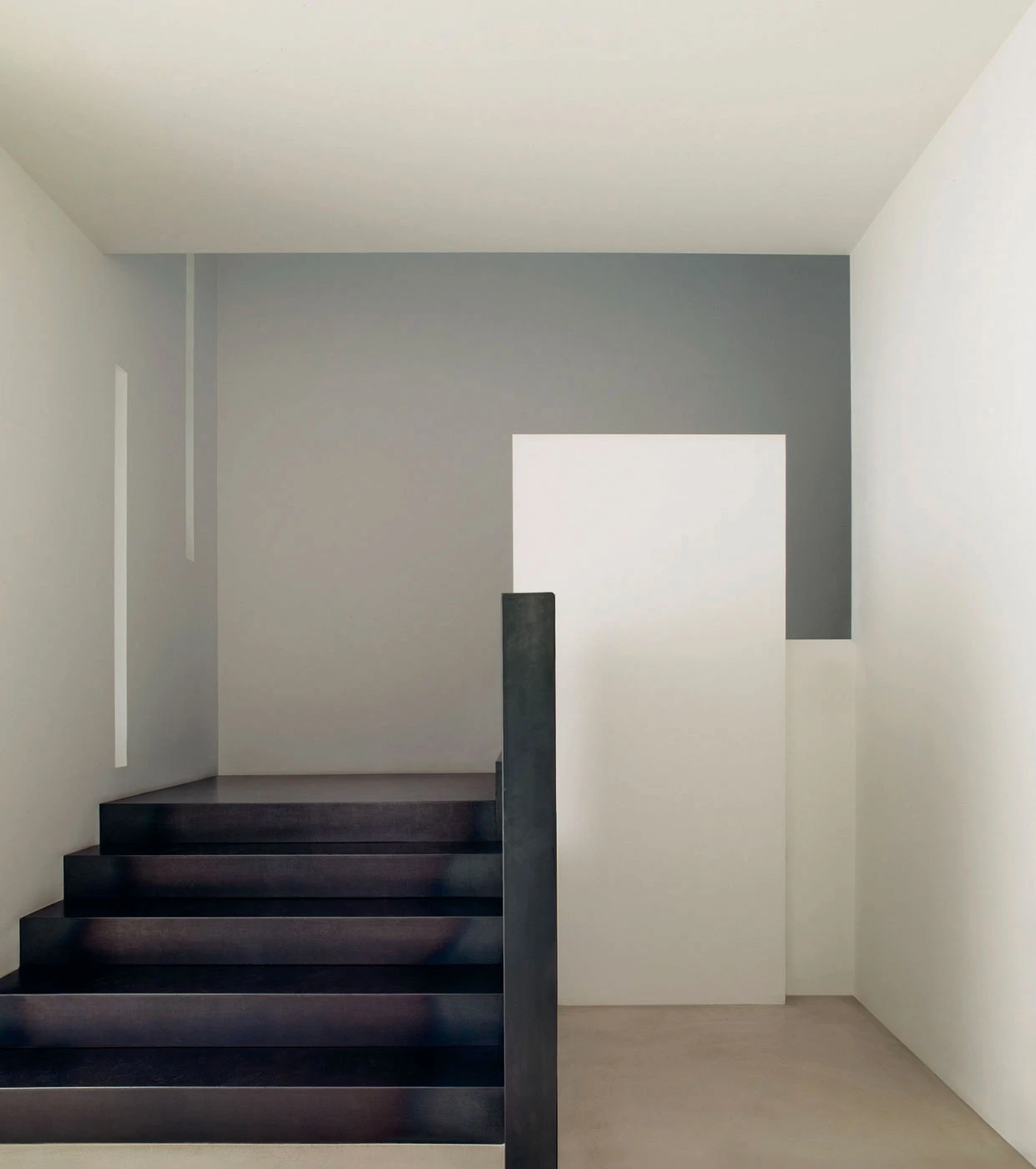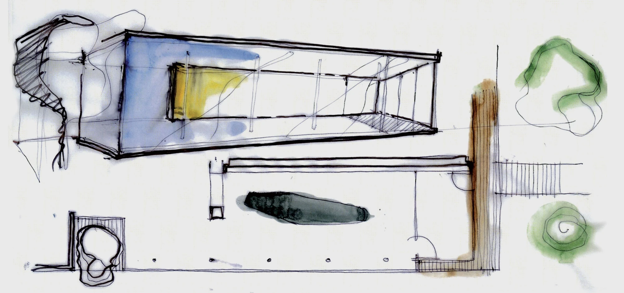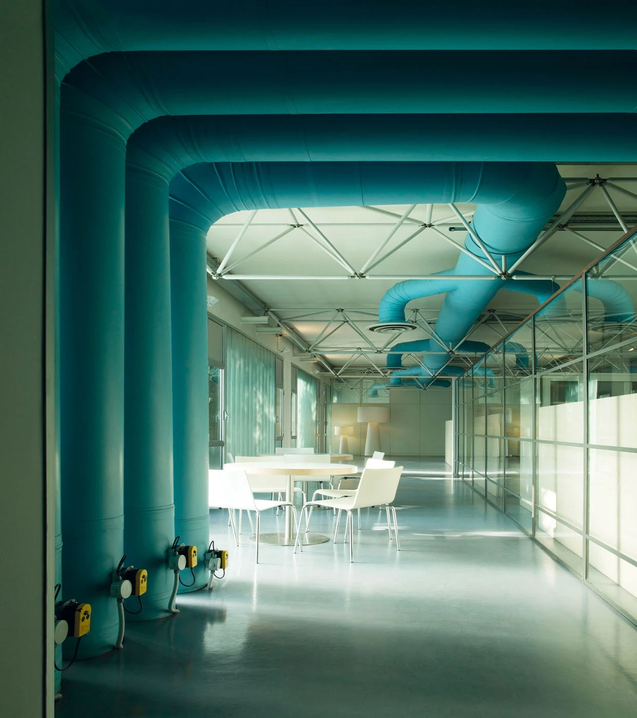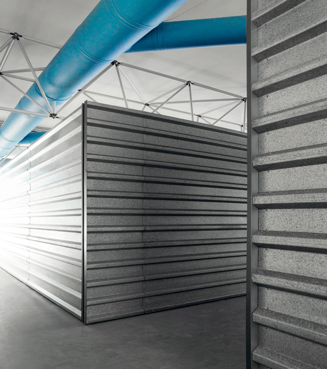 In 1999, Lissoni began working on plans to expand the existing Boffi's headquarters and plant located in the northern Italian city of Lentate sul Seveso. The main aim was to establish a paint shop, security area, warehouse and reception area. The first building phase produced the reception area, which was finished in April 2008. The glass-encased, puristic steel construction was added directly onto the old building. The roof and narrow base are flush with the large glass windows on the sides, and these two components extend past the windows on the right and thus form a sheltered entrance area that is also marked by a large red arrow. Visitors are welcomed at a massive and heavy table made of six welded metal plates which is placed in front of a glass wall within this indirectly lit entry area.