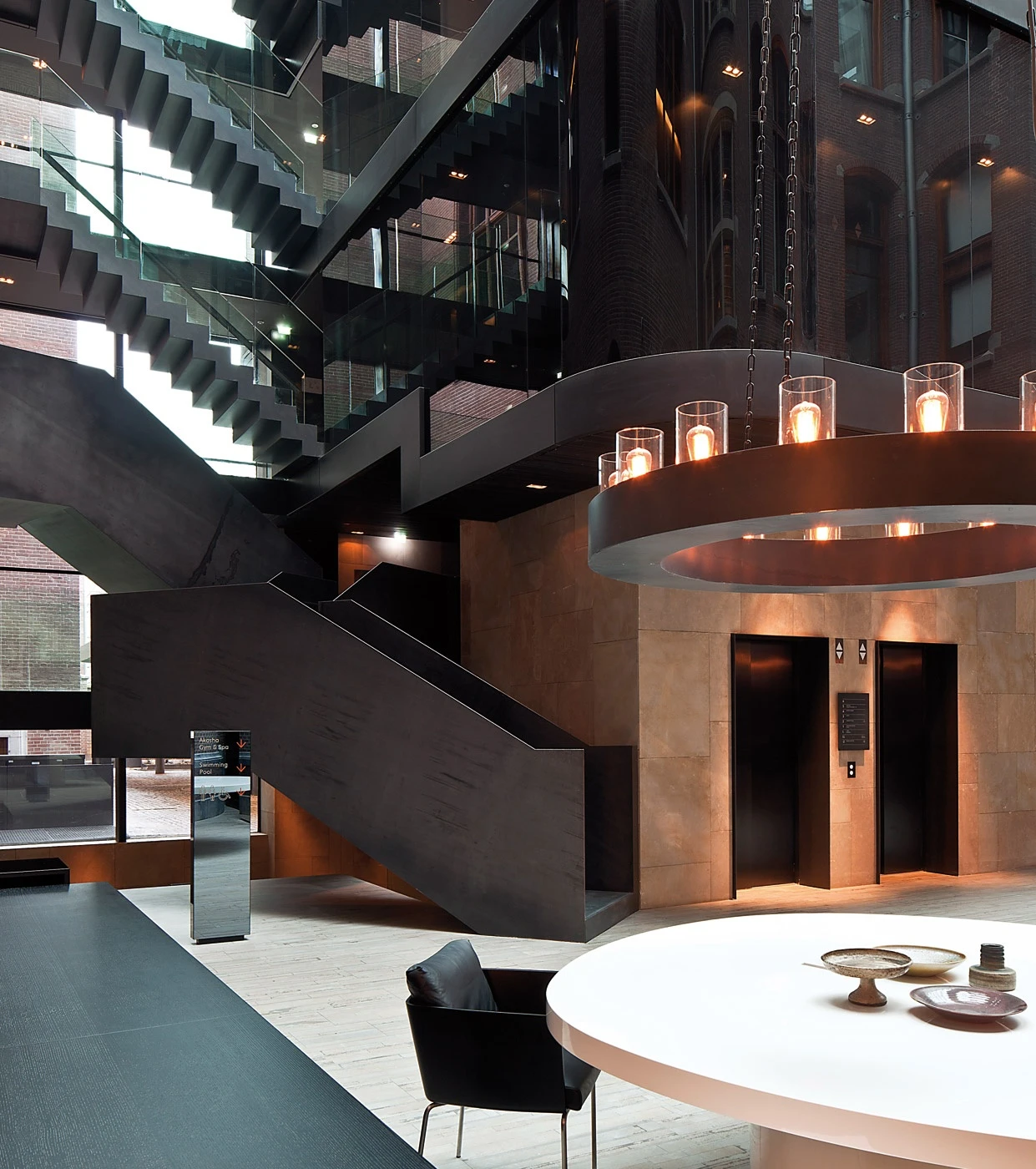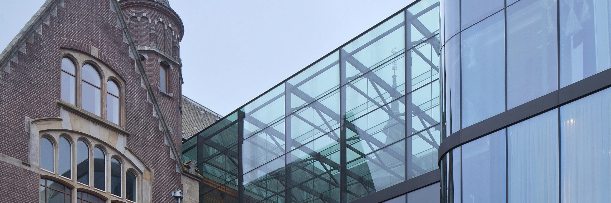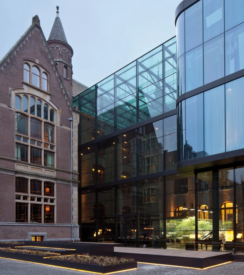 The Conservatorium Hotel occupies the site of Amsterdam’s former music conservatorium, built in the 19th century. The original gothic feeling of the building was left unchanged while new elements, such as the covered glass courtyard, were inserted to create a contrast between antique and modern.