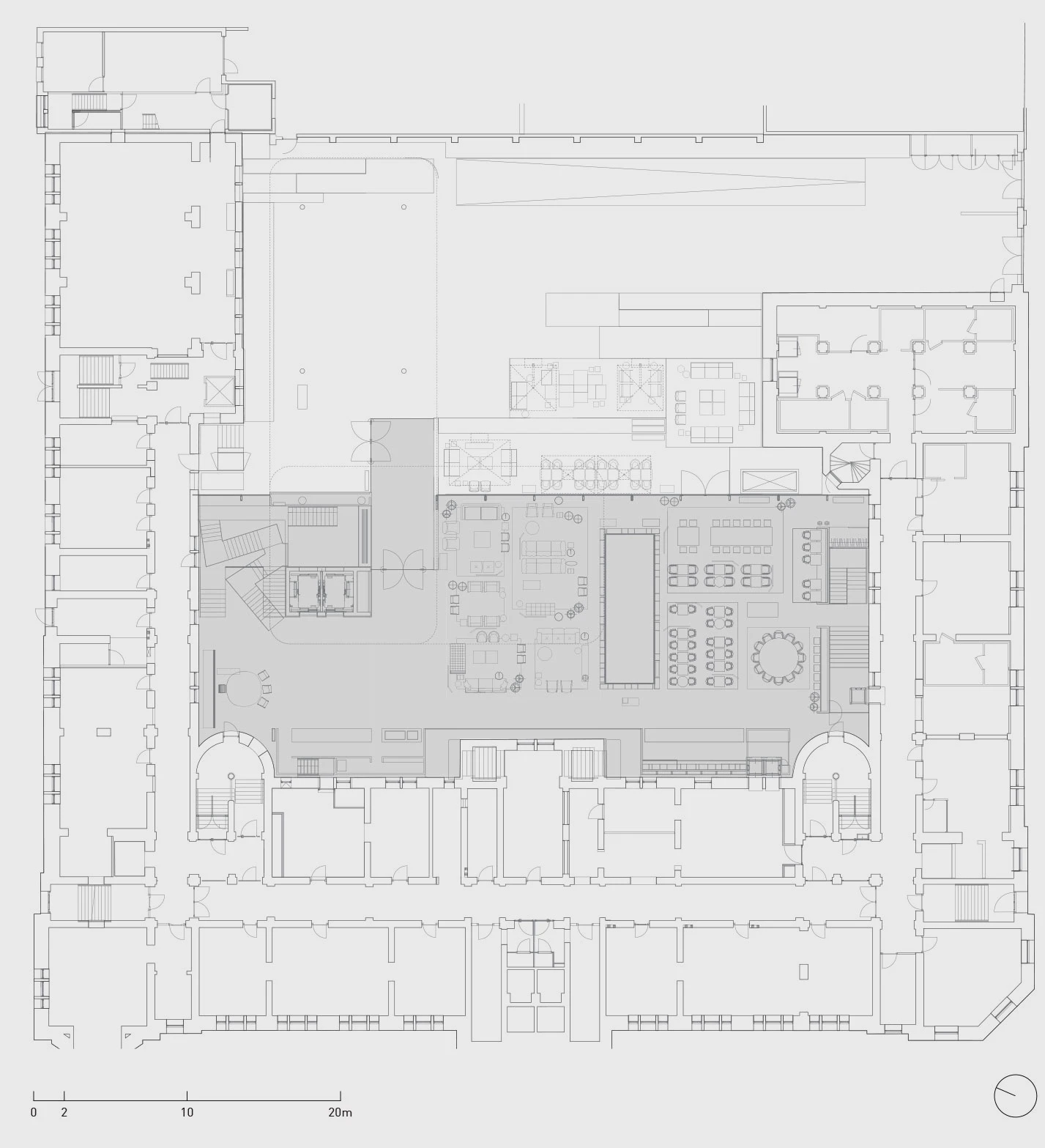 The concept emphasizes a combination of styles and a clear, unmistakable sense of design where existing and new elements are brought together in a discriminating dialogue. The covered interior courtyard is without a doubt the most striking new component. Constructed completely of glass, it underscores the contrast between old and new, while doing full justice to the original structure of the historic building.