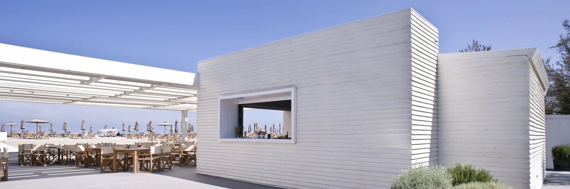 The first phase of the works was concluded in 2011 and involved the reorganization of the vast private beach to provide 400 sunbeds and canopied beds, beach cabanas and gazebos. In addition, the bar, restaurant and lounge area of the beach were entirely redesigned and are now characterized by a capacious white pergola. In 2012, all the public areas on the ground floor of the old building were completed: the new lobby, the cocktail bar, pastry shop, business and conversation lounges. The reception was also enlarged with a new pavilion in glass and metal enclosing an internal patio that becomes a link with the old building. 2014 saw the completion of a new three-floor edifice to supplement the main building.