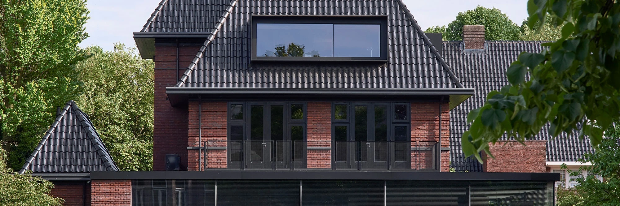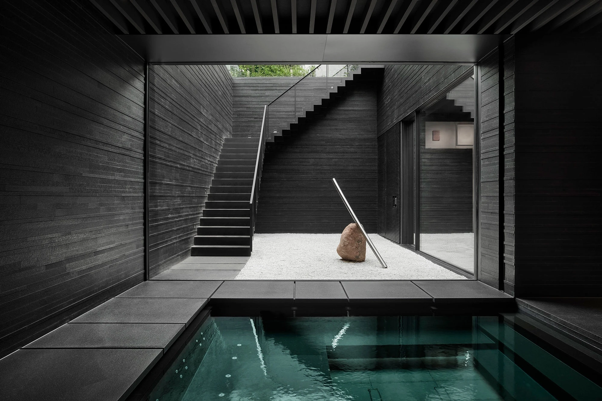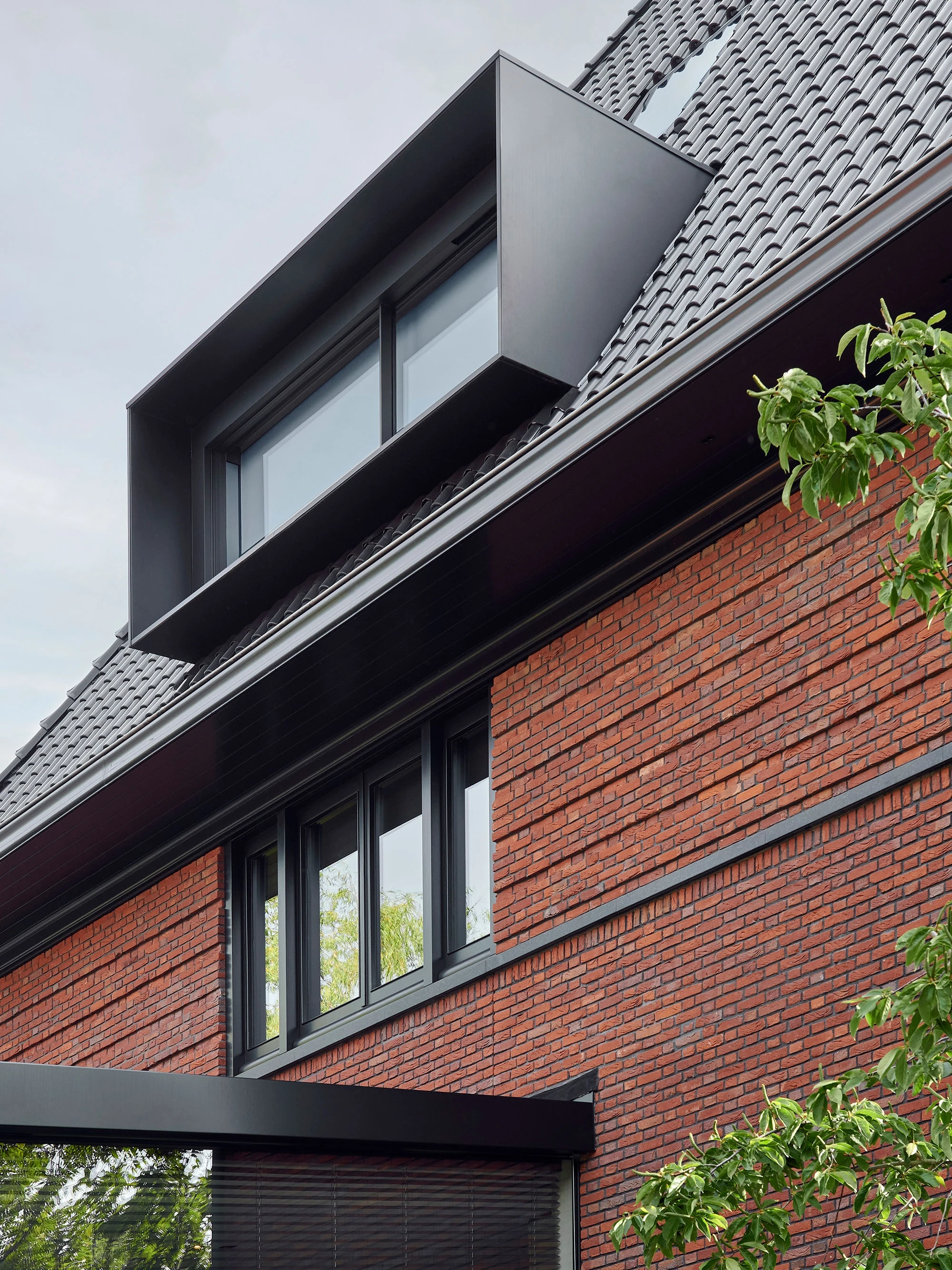 The contemporary style of the architecture can also be seen in the pitched roof with the introduction of box elements in black sheet metal that contrast with the geometry of the steep incline, typical of Nordic roofs.