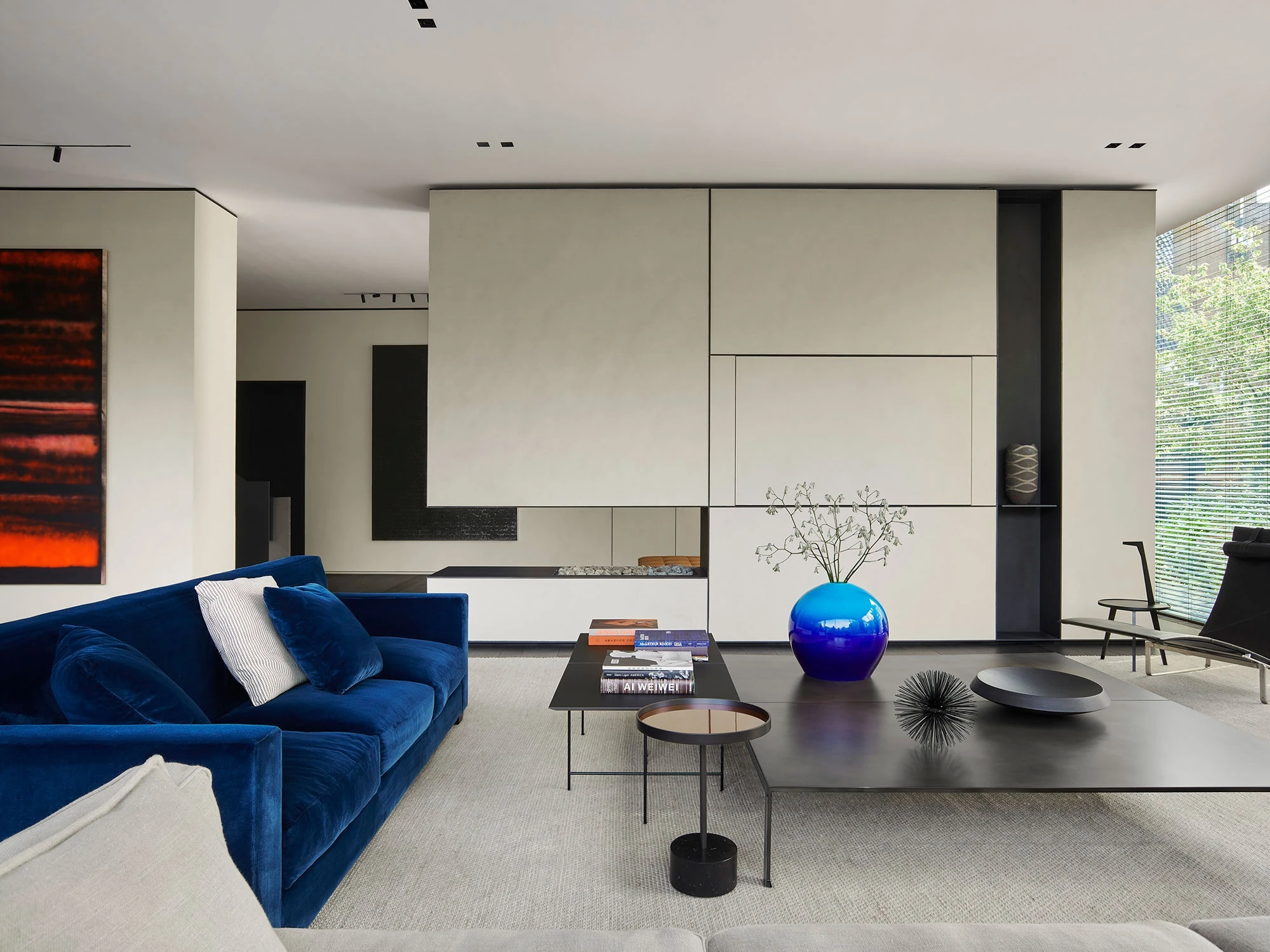 Inside, the pavilion on the ground floor is conceived as an open-plan space into which solid volumes have been introduced, such as the fireplace and the staircase that winds upwards through the five levels of the house.