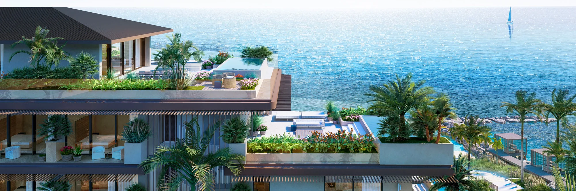The architecture draws inspiration from the surrounding archipelago and the natural elements historically used in Turks and Caicos architecture. Arc’s cascading, stepped design creates large overhangs that offer shaded outside spaces and a seamless transition from indoor to outdoor living, maximizing the functionality of the gardens, pools and al fresco living areas.