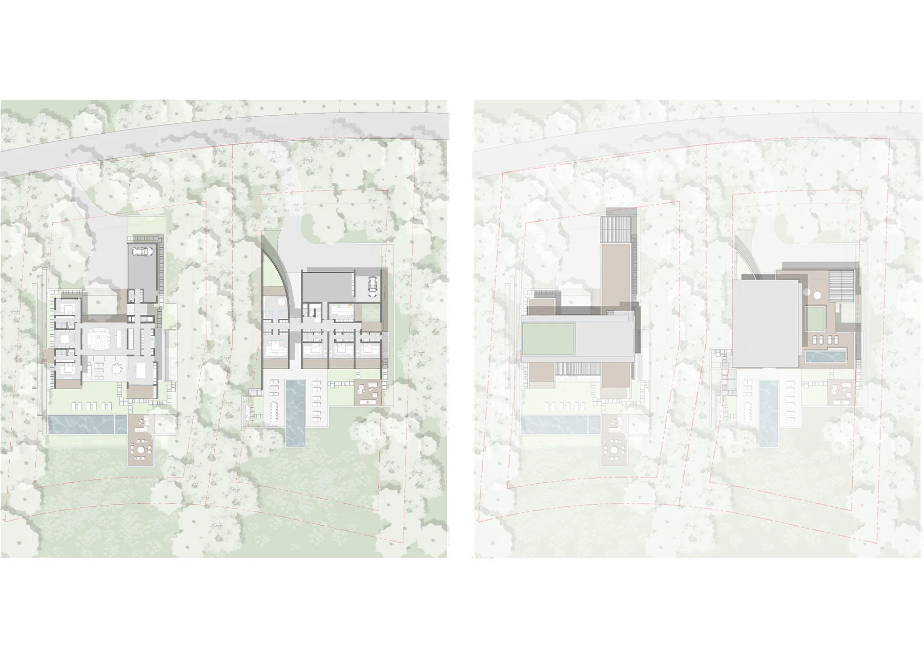 The two villas differ in their programmatic strategies, each maximizing visual engagement with the bay: one places the living areas on the garden level and the sleeping quarters above, while the other inverts this arrangement, situating the main living spaces on the upper floor with a large terrace overlooking the landscape.