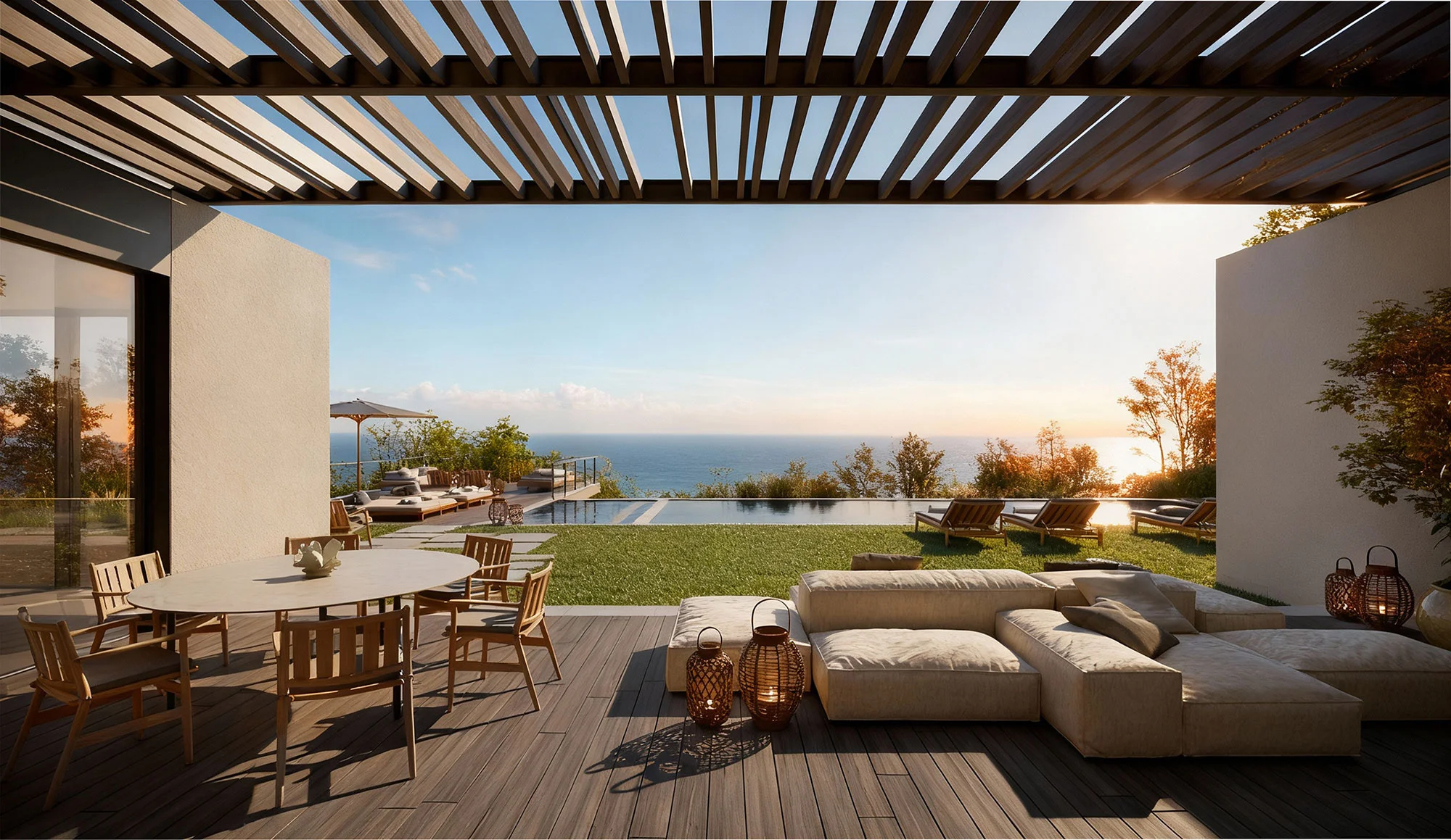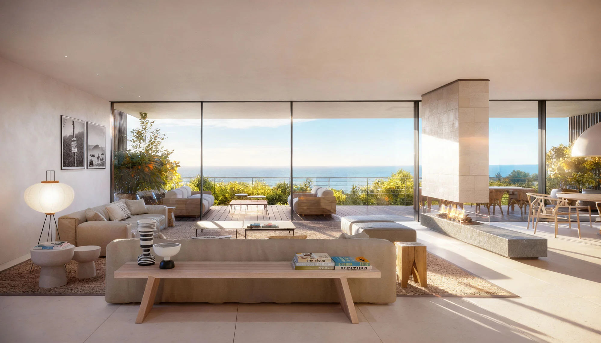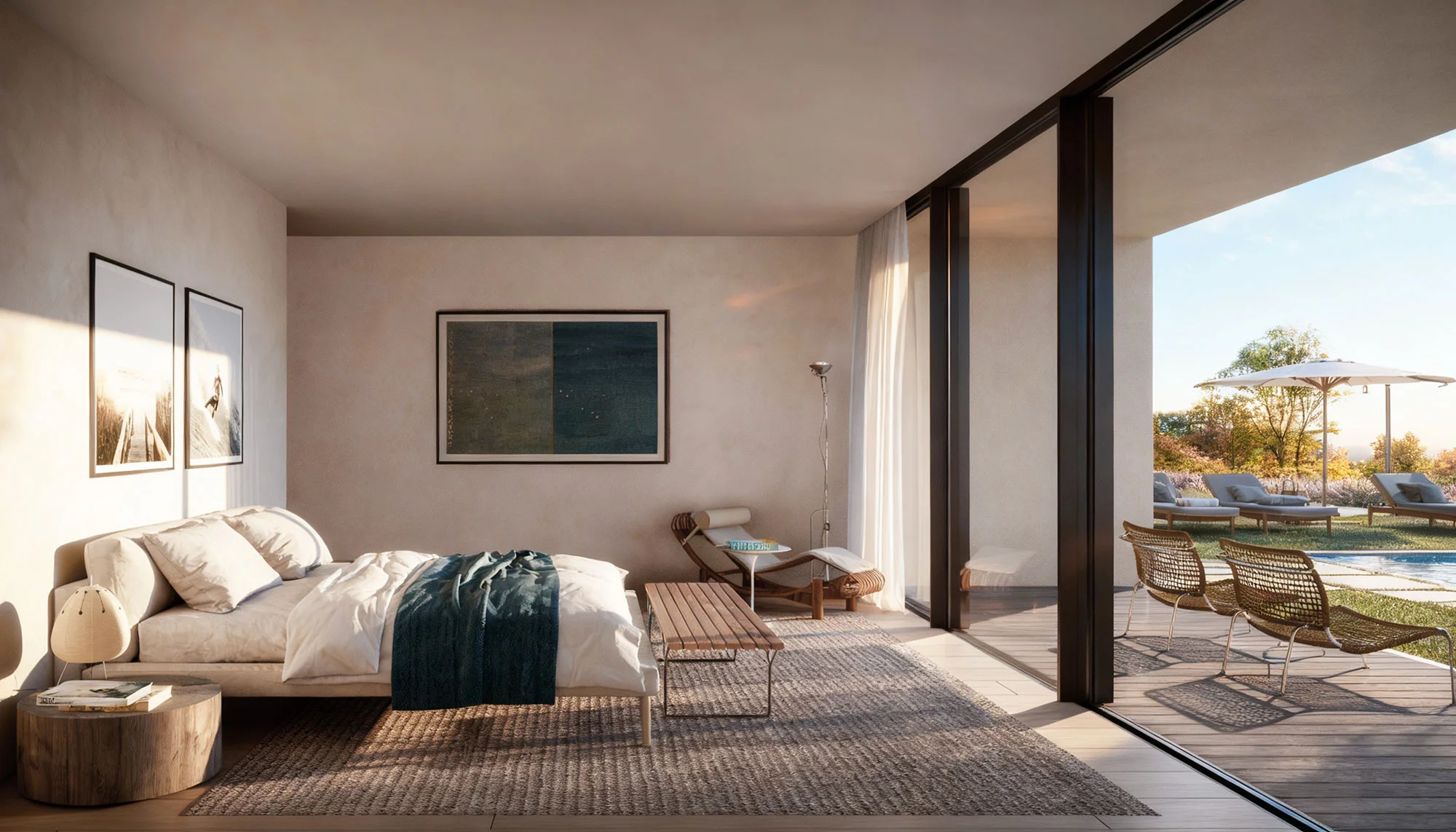 The continuity of materials and finishes, extending seamlessly from indoor to outdoor surfaces, produces a unified architectural expression that blurs the threshold between the built environment and nature. Natural tones, tactile textures, and expansive glazing emphasize transparency and connection, framing the landscape as an essential component of the architectural experience.