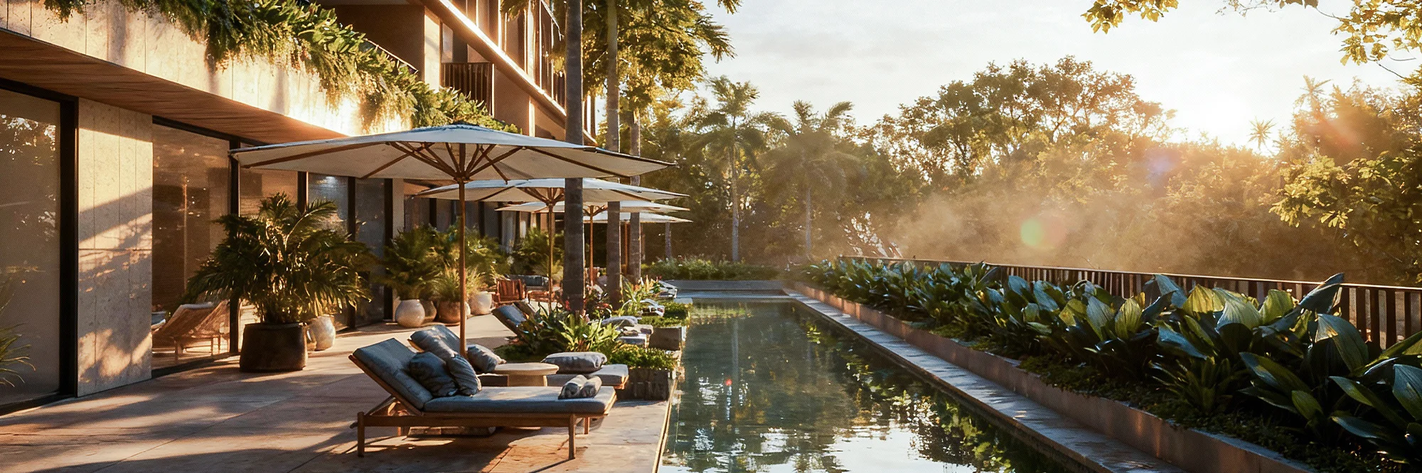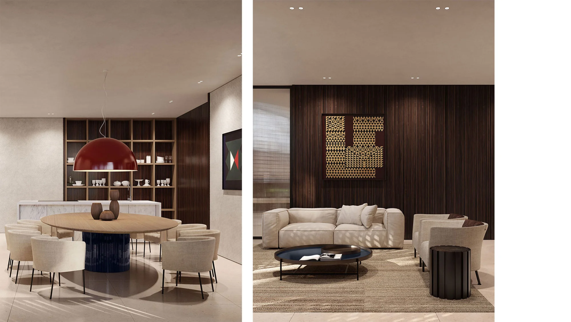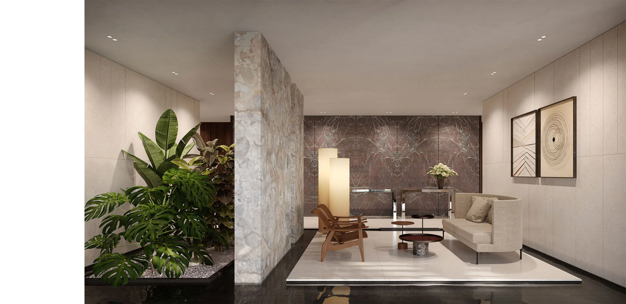 At ground level, a carefully structured arrival sequence introduces the shared amenities and outdoor spaces, conceived to encourage community while preserving a strong sense of exclusivity. The podium becomes the social heart of the development, hosting a wide range of leisure and wellbeing areas, including extensive gardens, lounge settings, as well as extensive water features that connect the different spaces by cultivating a calming and restful ambiance.
