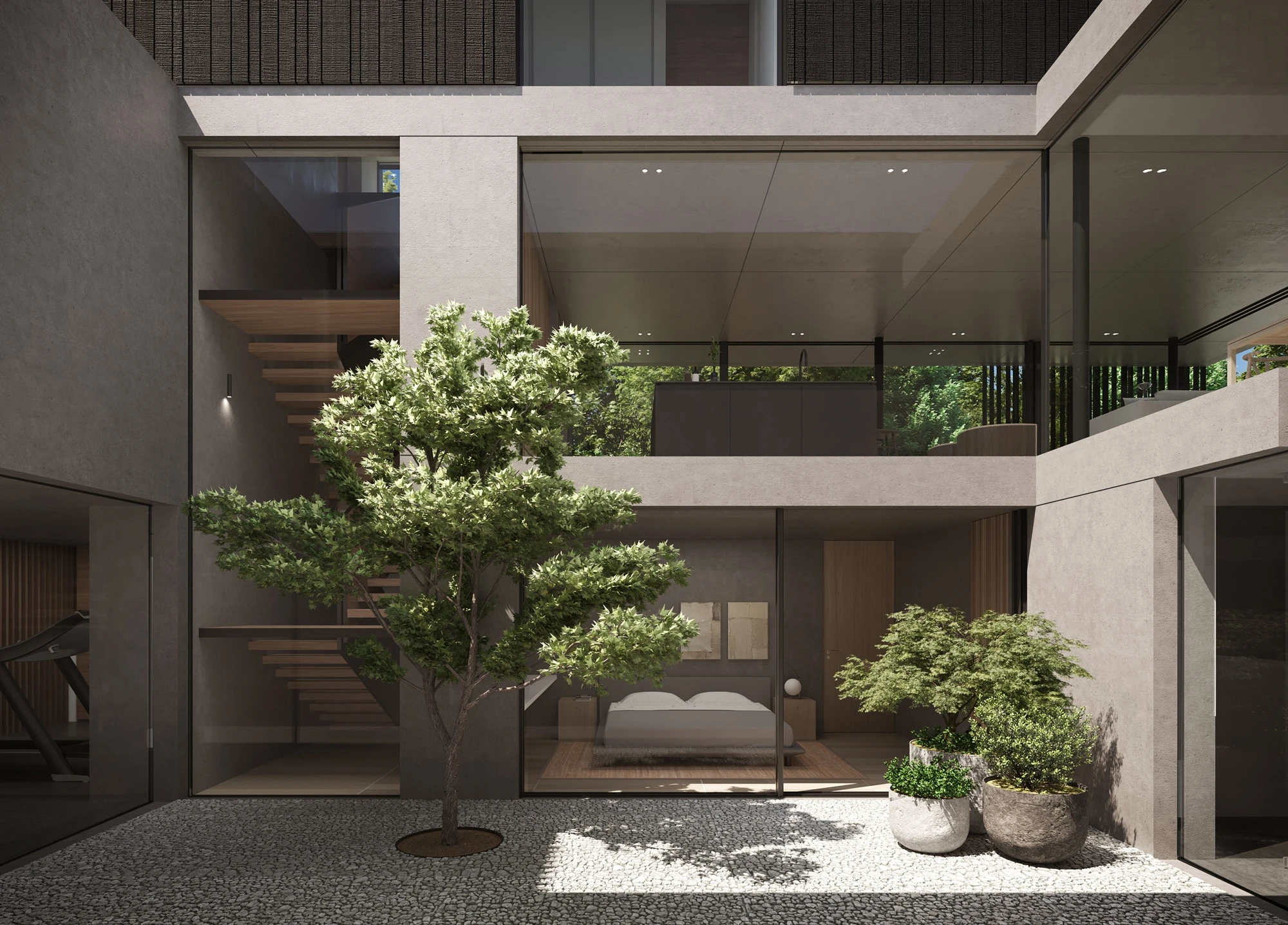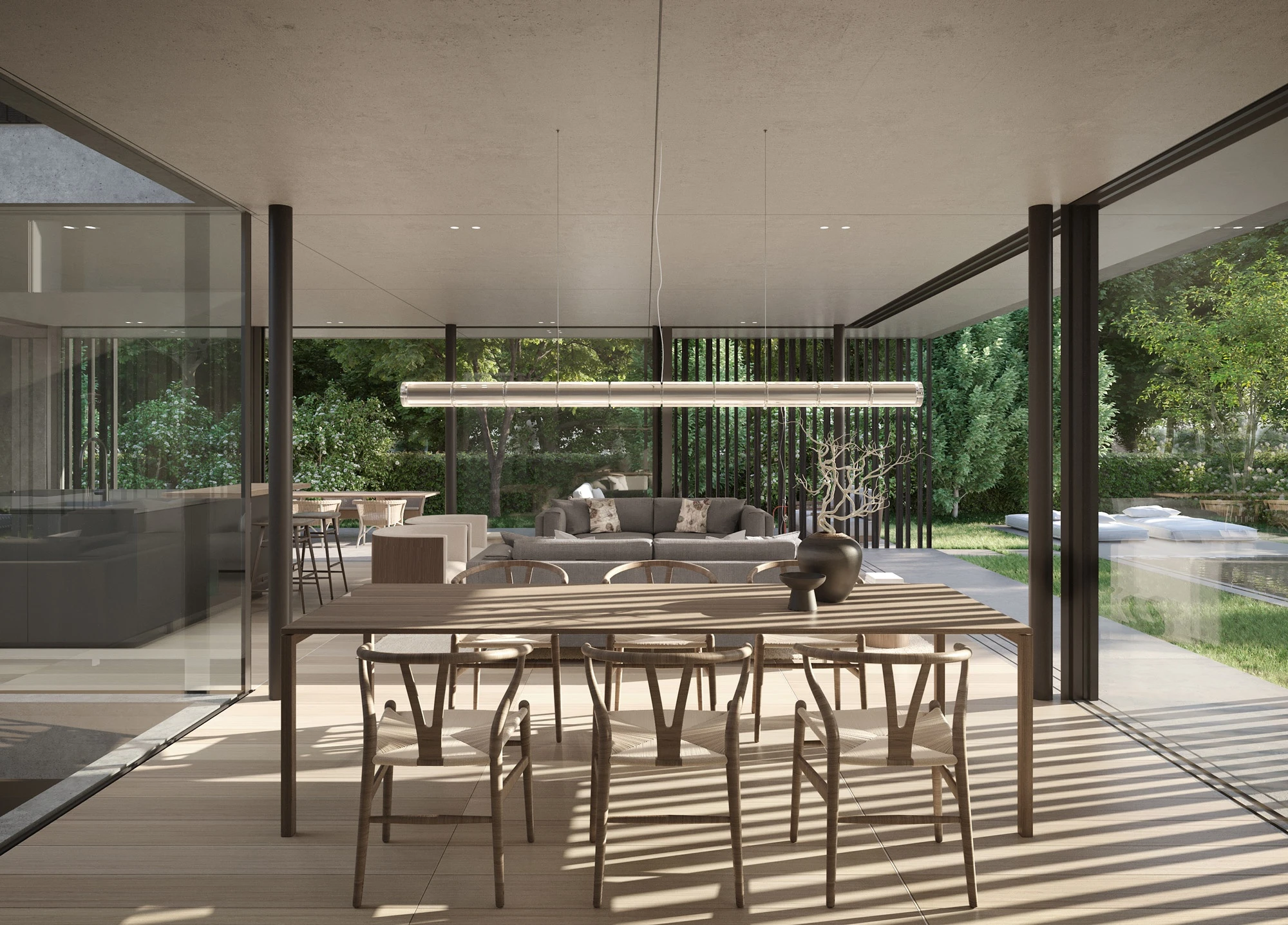 The architecture unfolds over three floors and is made up of pure and overlapping volumes. The ground floor in cement is characterized by large retractable windows that establish a constant dialogue between the interior spaces and the private garden, while a lightwell brings daylight into the lower ground floor. The top floor is instead defined by the archetypal form of the pitched roof in dark wood, forming a kind of telescope that projects over the garden.