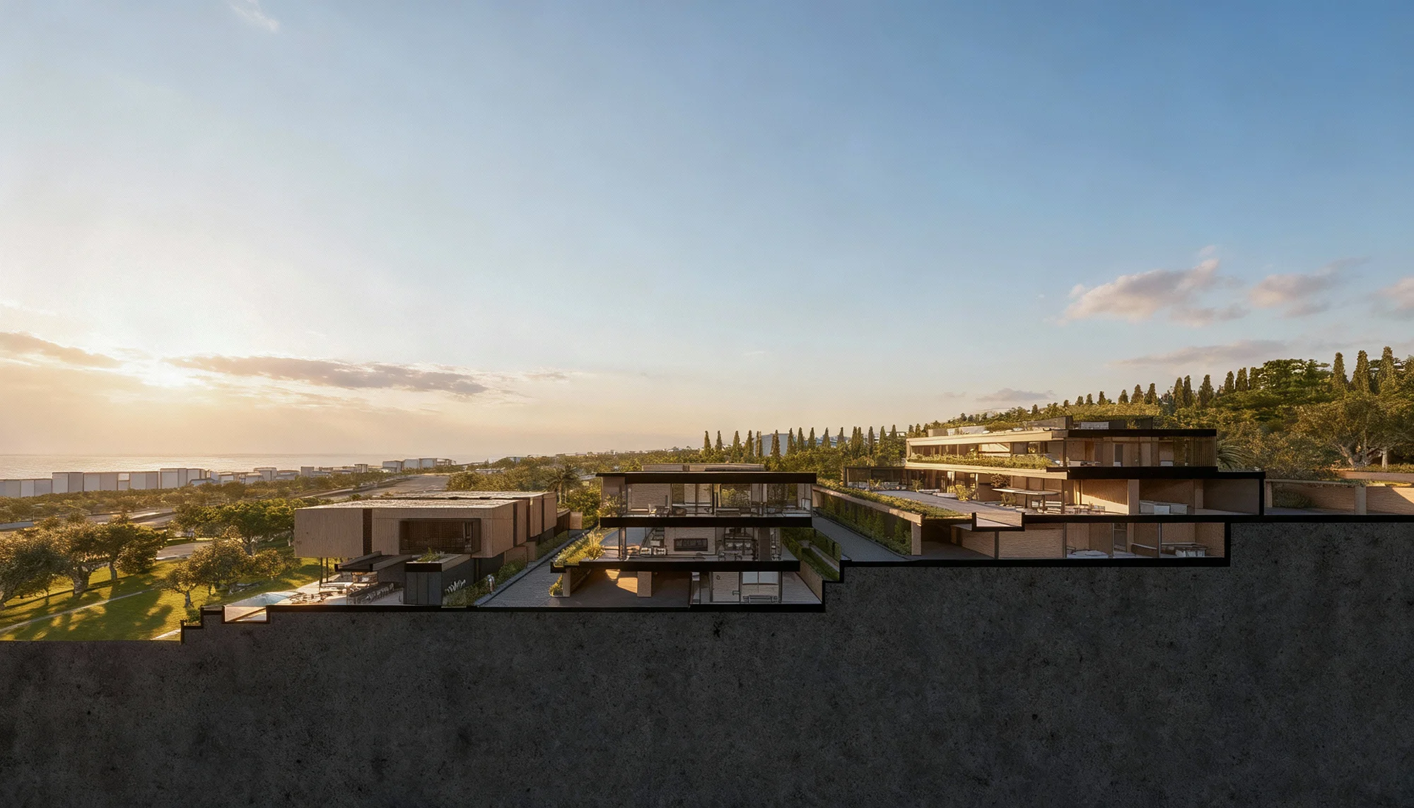 Located at 240m above sea level, the plot offers spectacular views of the Mediterranean Sea, with the site morphology greatly influencing the design approach to the project. A 15m slope determined the strategic direction and the overall concept: three cascading platforms of diverse villas placed in such a way that each unit commands unimpeded views of the sea.