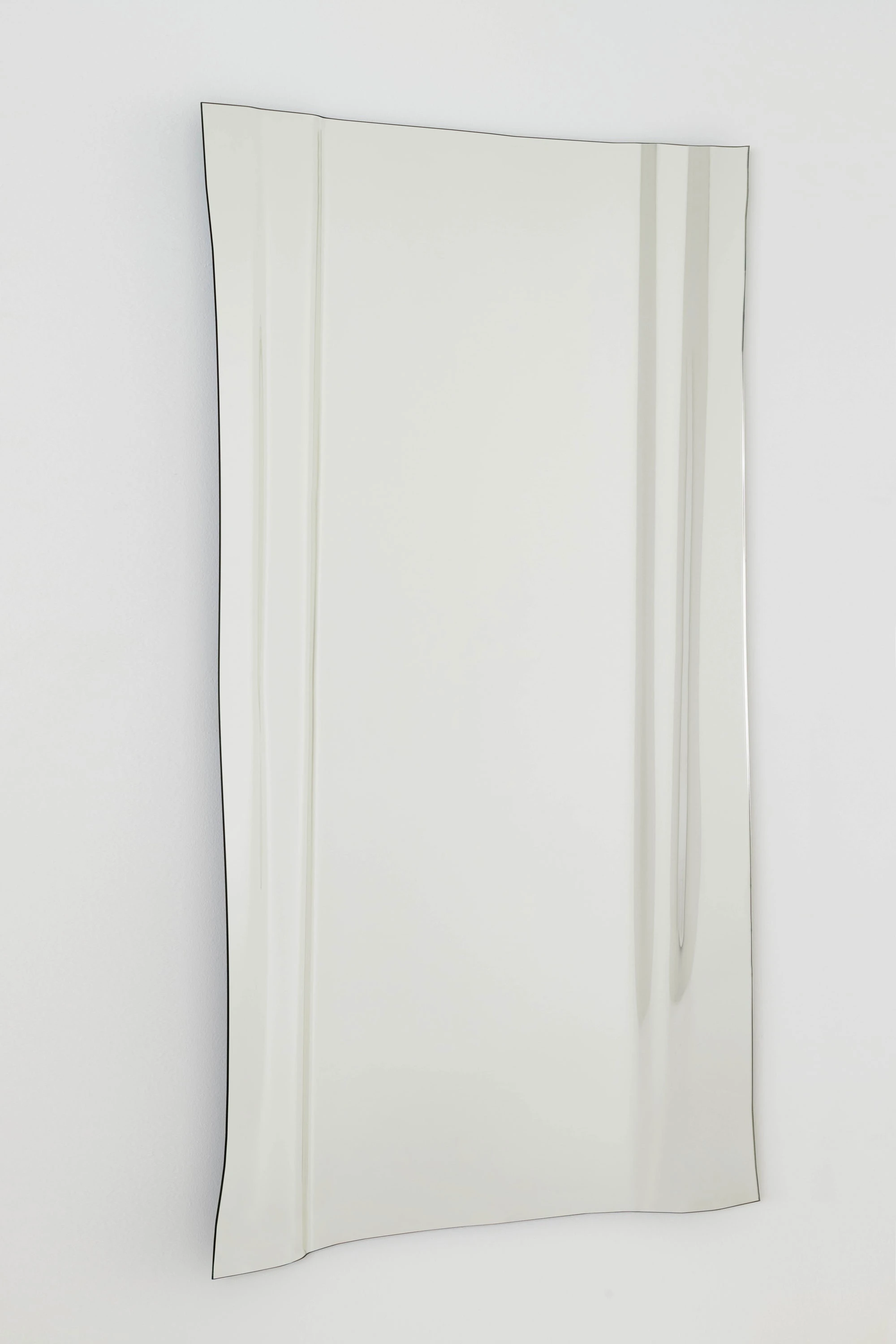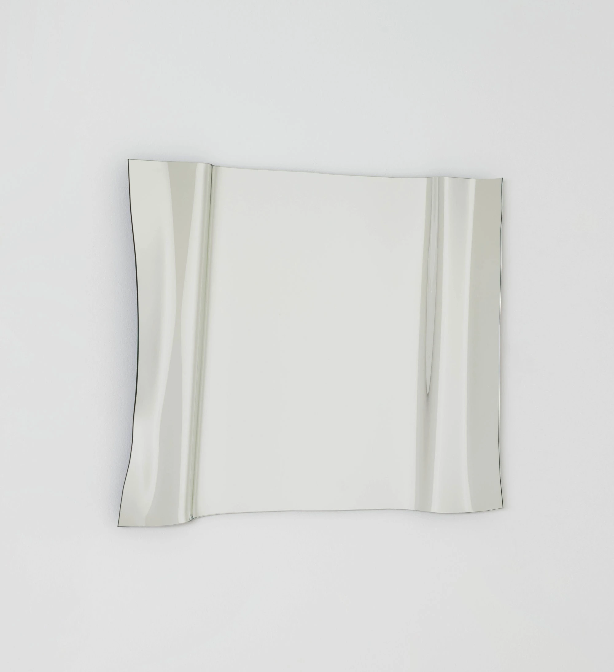 The Maestrale Mirrors are created from a single sheet of hand-silvered extralight or blue glass that undulates towards the perimeter, reminiscent of a banner fluttering in the breeze or delicate waves flowing over a liquid surface. Images reflected in the curvatures are intriguingly distorted, while the reflection in the central flat area is functional and true to life. Available in two sizes, the mirrors can be hung horizontally or vertically.