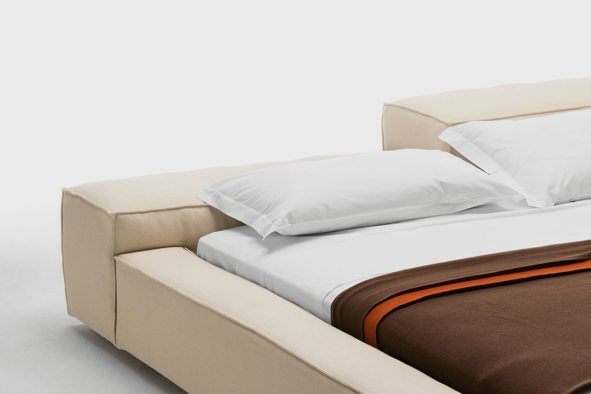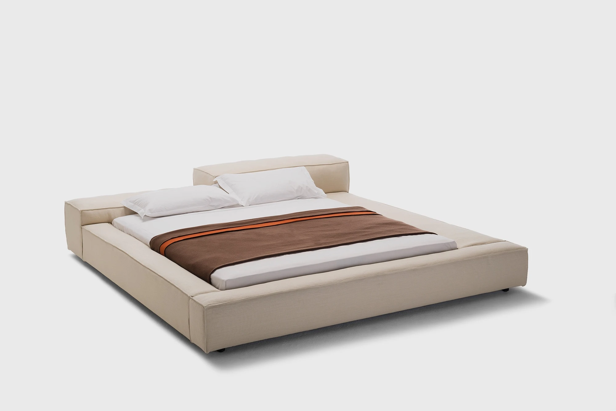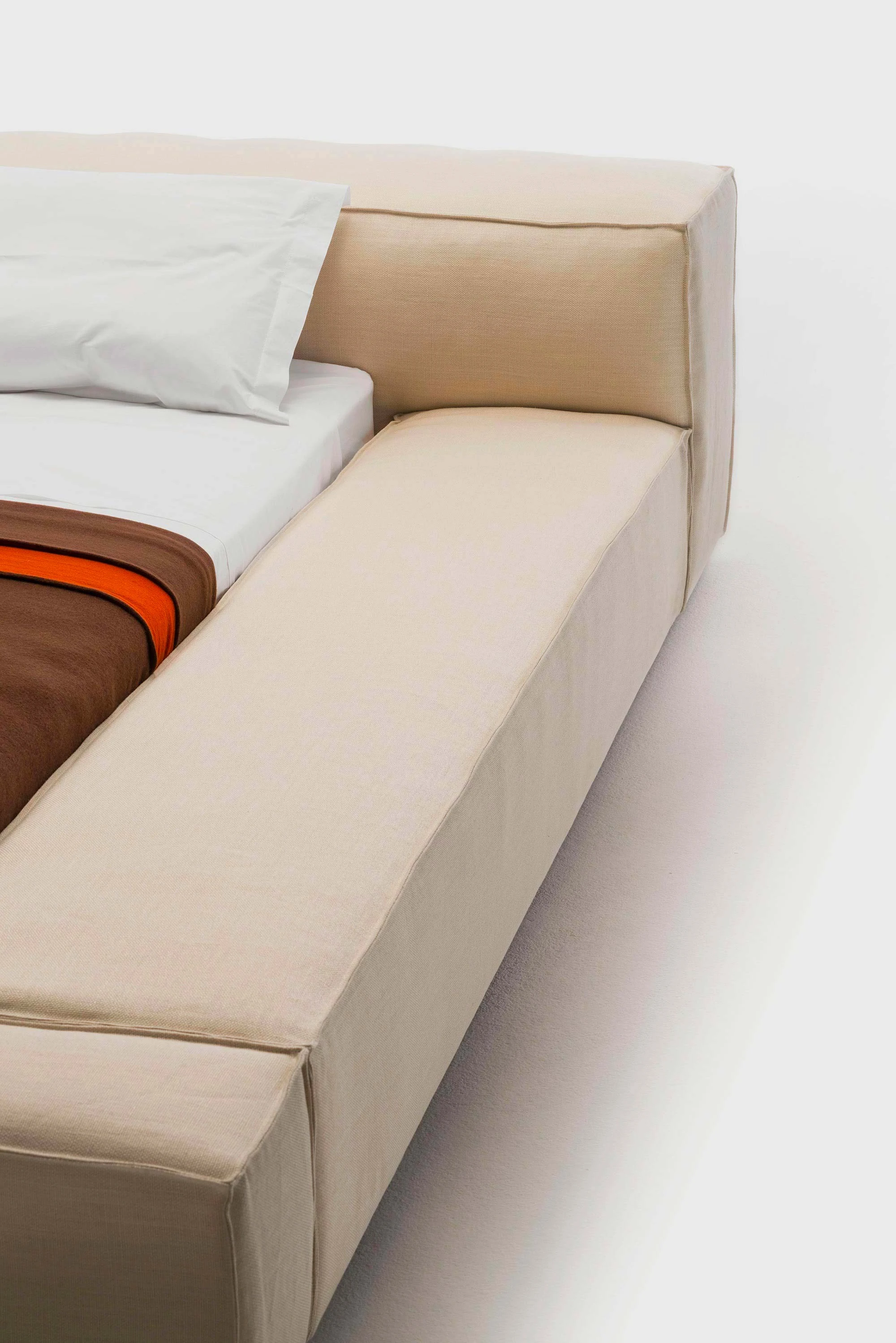 The mattress is surrounded by a perimeter of soft volumes embellished with stitching and an equally soft asymmetrical headboard, promoting relaxation while at the same time expressing energy and personality.