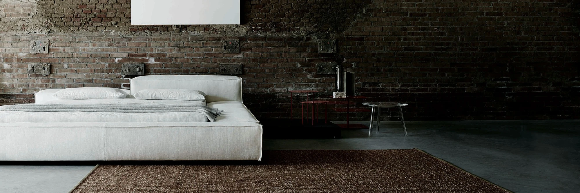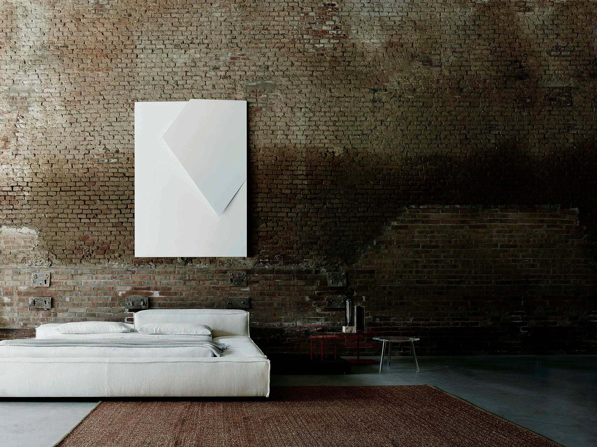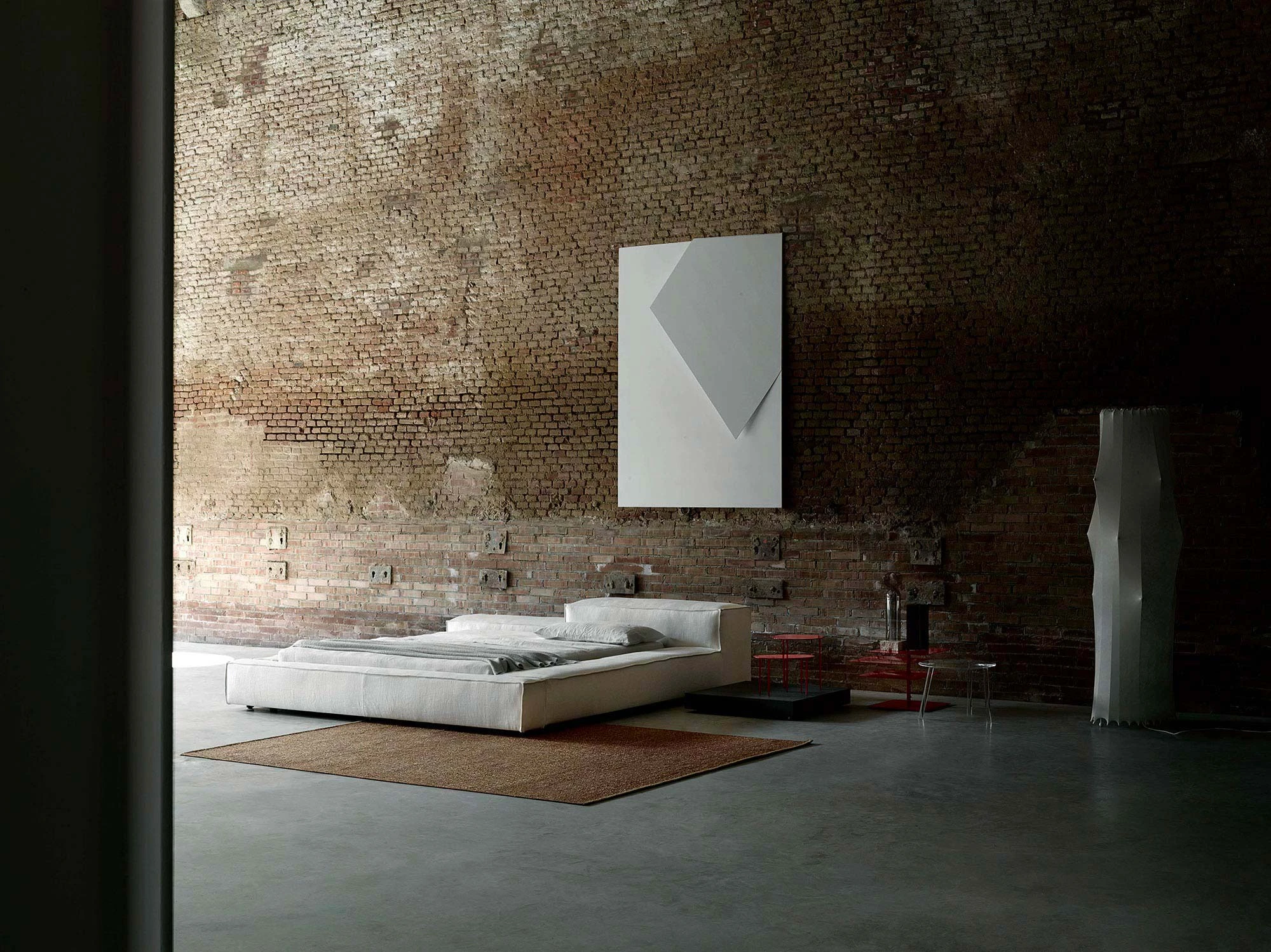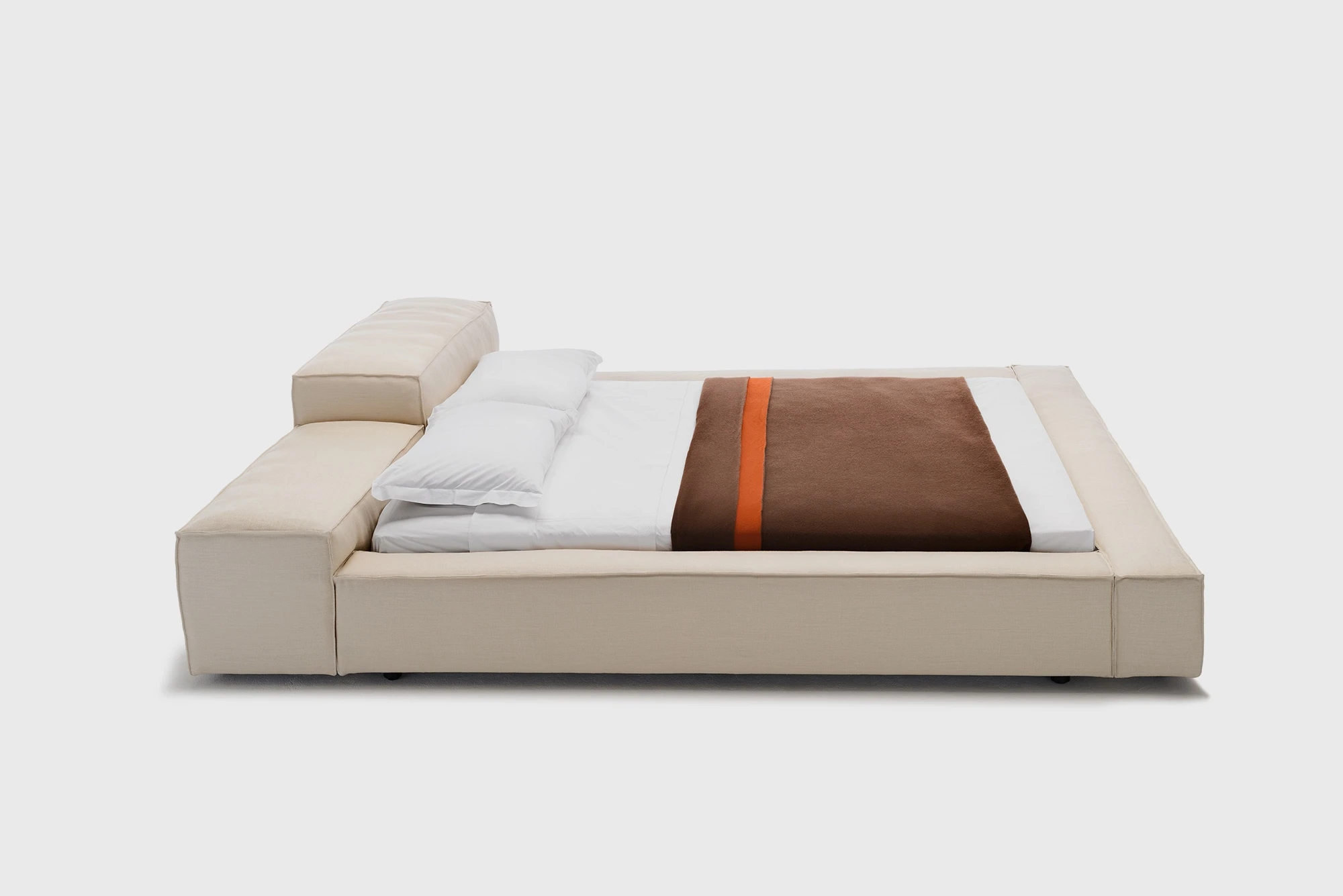 The mattress is surrounded by a perimeter of soft volumes embellished with stitching and an equally soft asymmetrical headboard, promoting relaxation while at the same time expressing energy and personality.