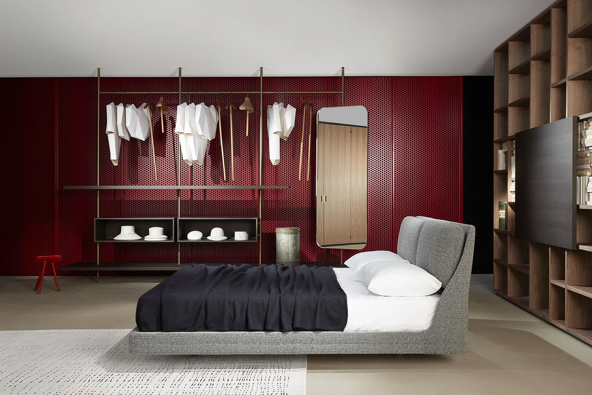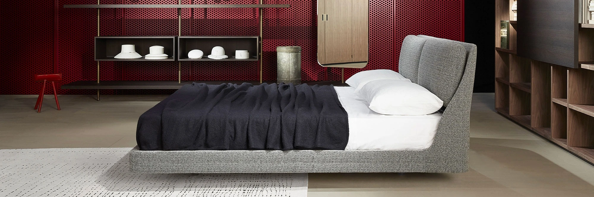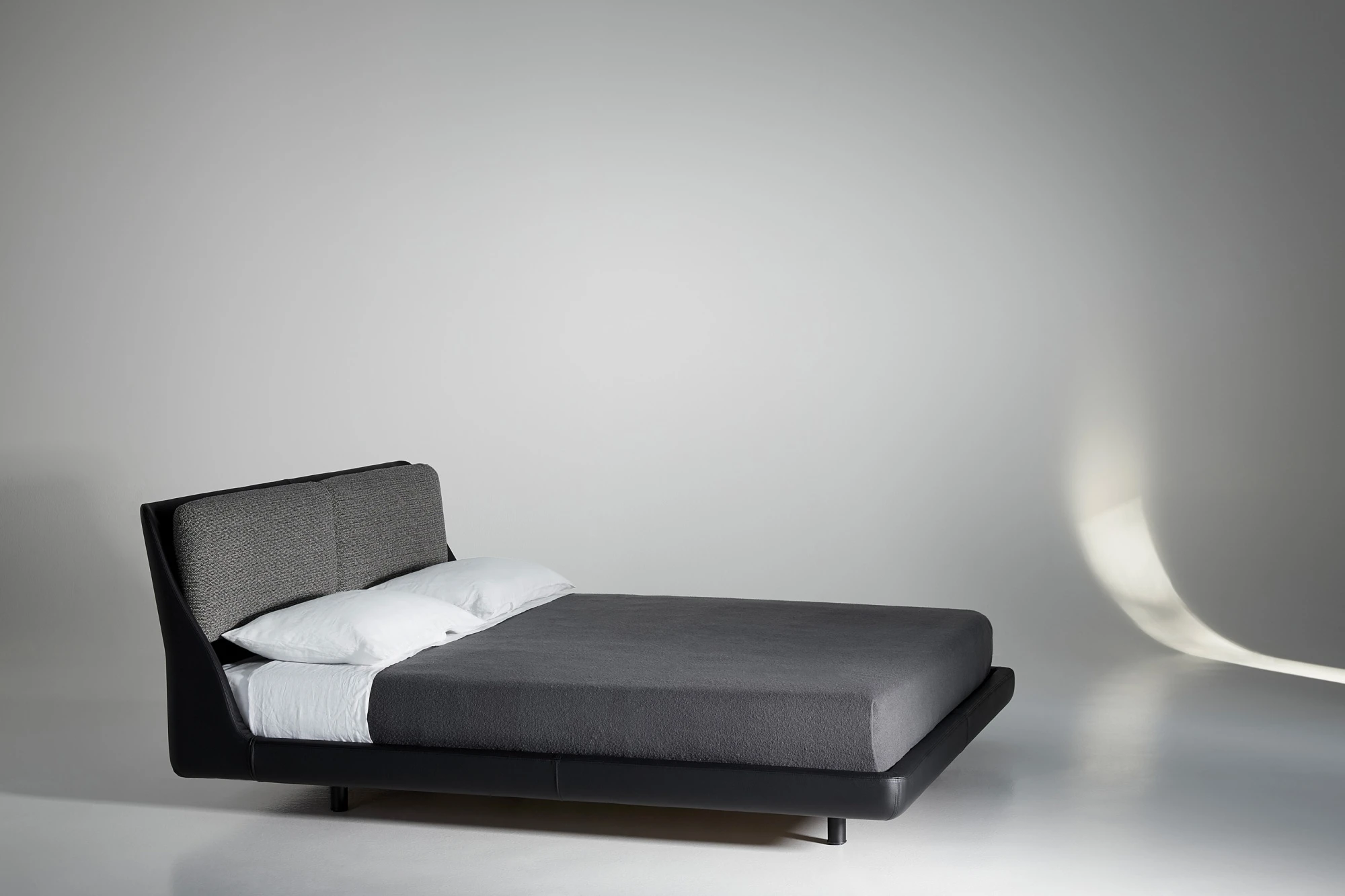 The textile bed Makura interprets a new conception of domestic warmth, between rationality and sensuality. Appearing suspended from the floor, Makura has a soft and inviting shape thanks to the sinuous and enveloping headboard with its superbly comfortable cushions that are also removeable. The attention to detail is found in the smooth curve that connects the headboard with the structure.