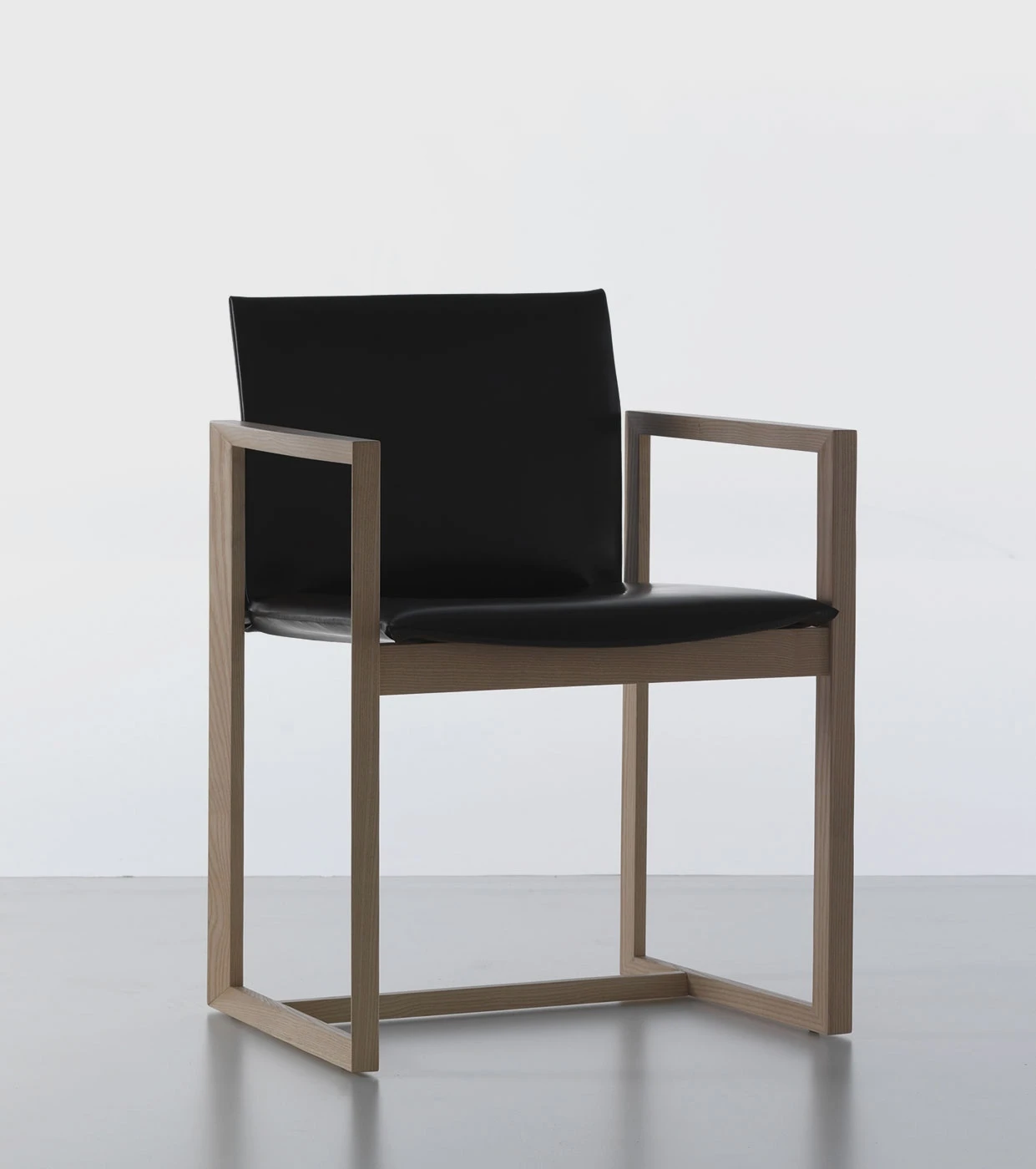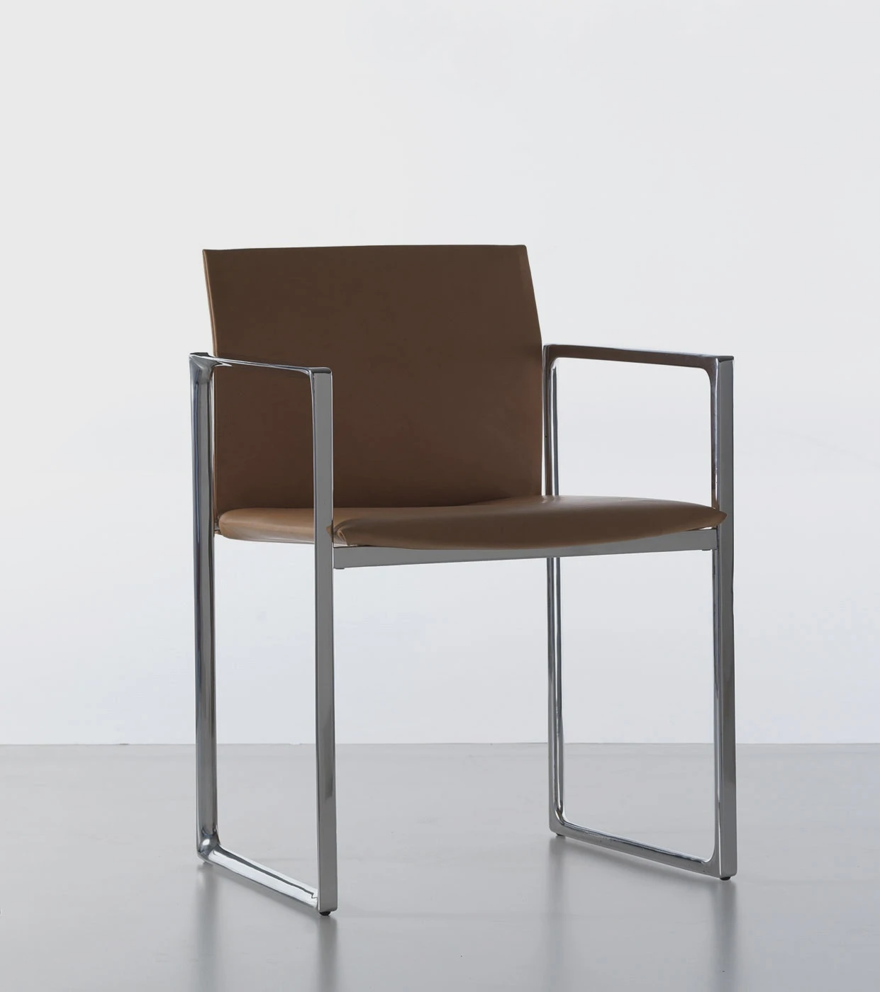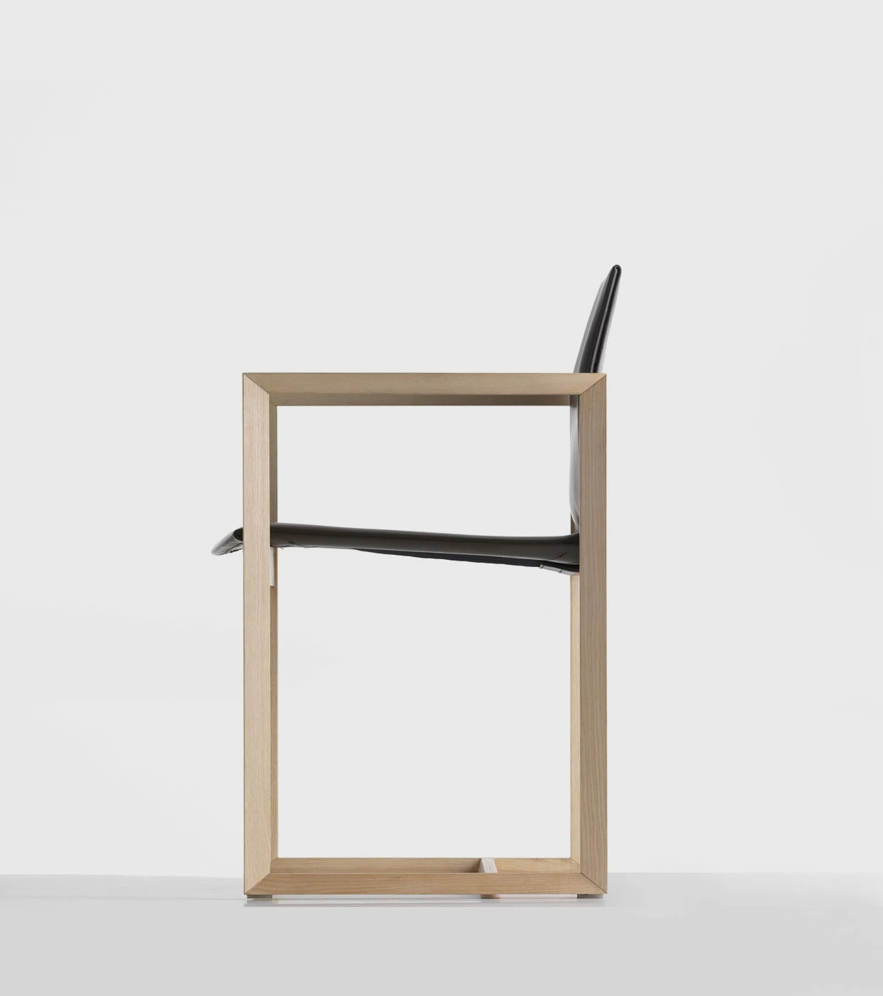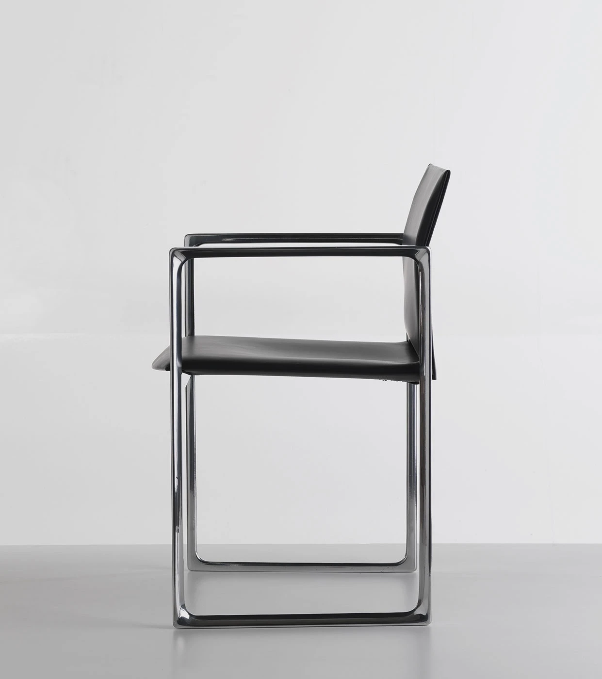 The choice of a metal or wood frame allows two personalities with one form, while the back and seat are in leather. The simple geometry of the structure is warmer and closer to nature in the walnut or ash version, making is ideal for the home environment, while the lines become slimmer and more dynamic in the cast aluminium option, perfect for office or corporate spaces.