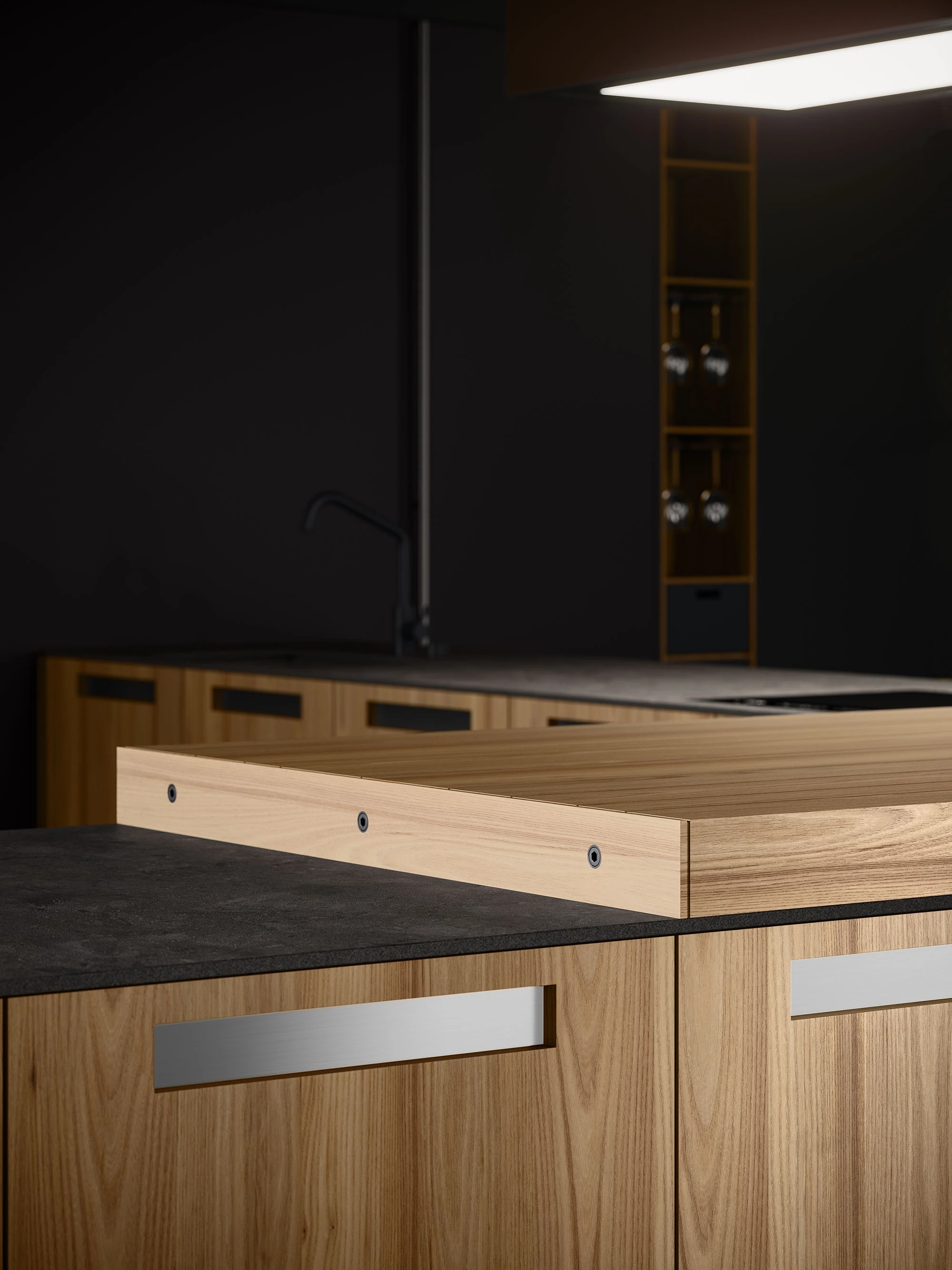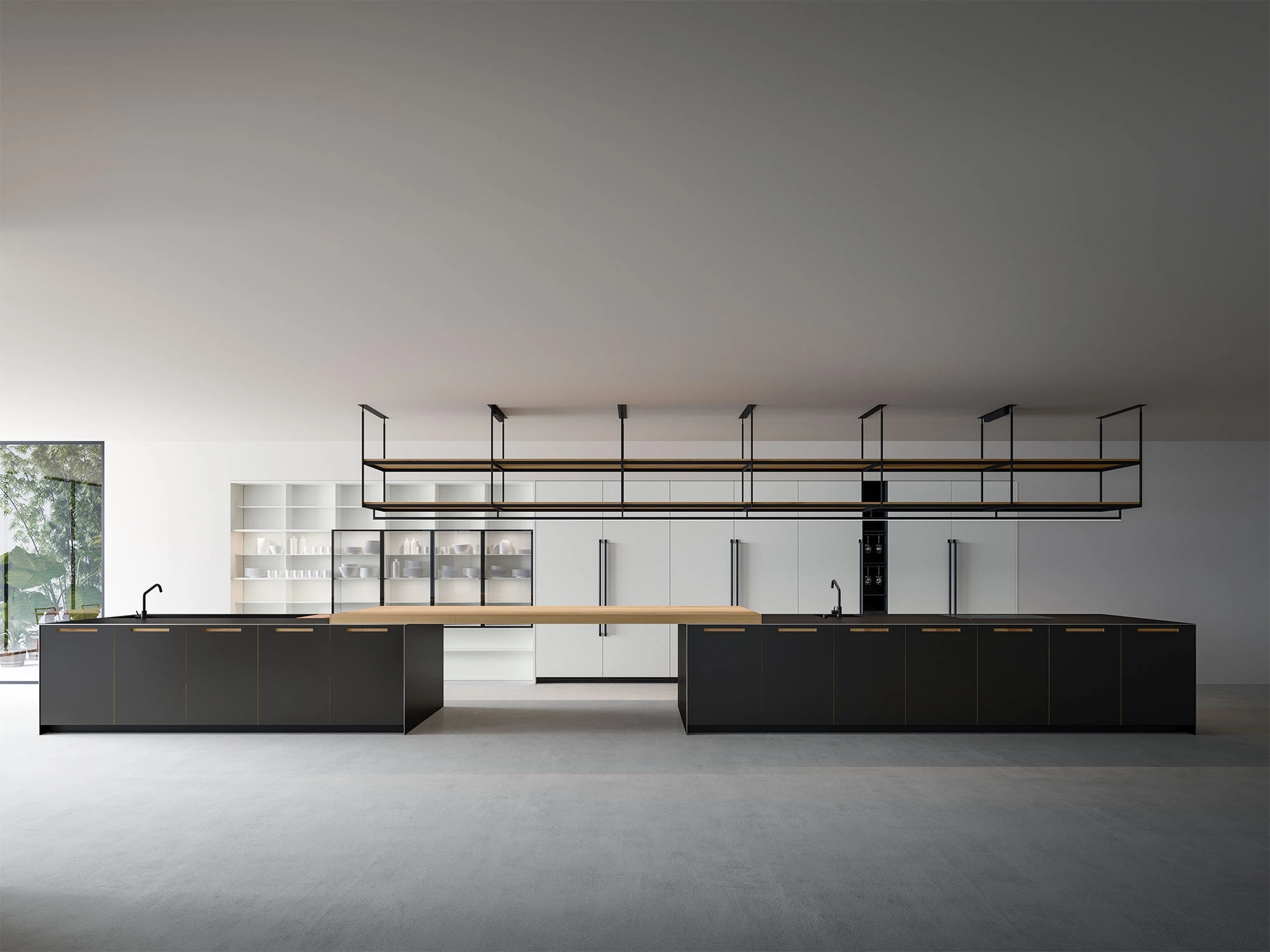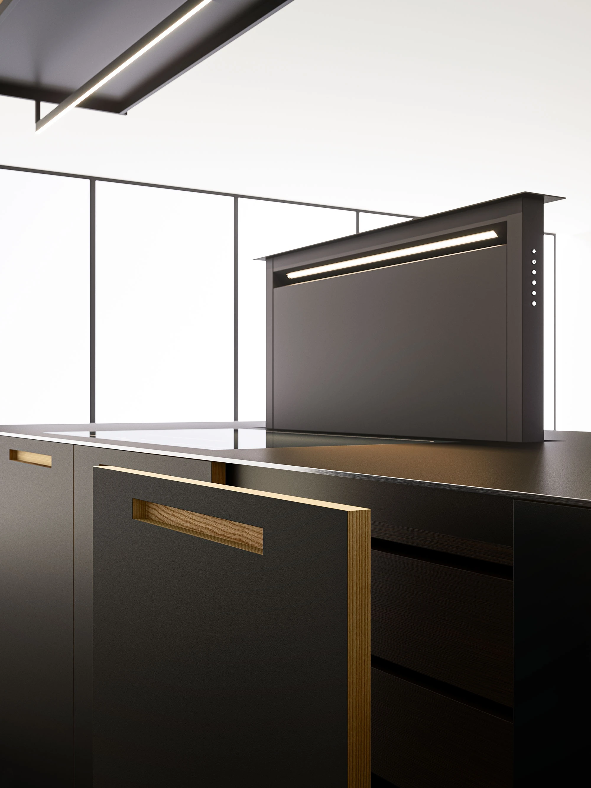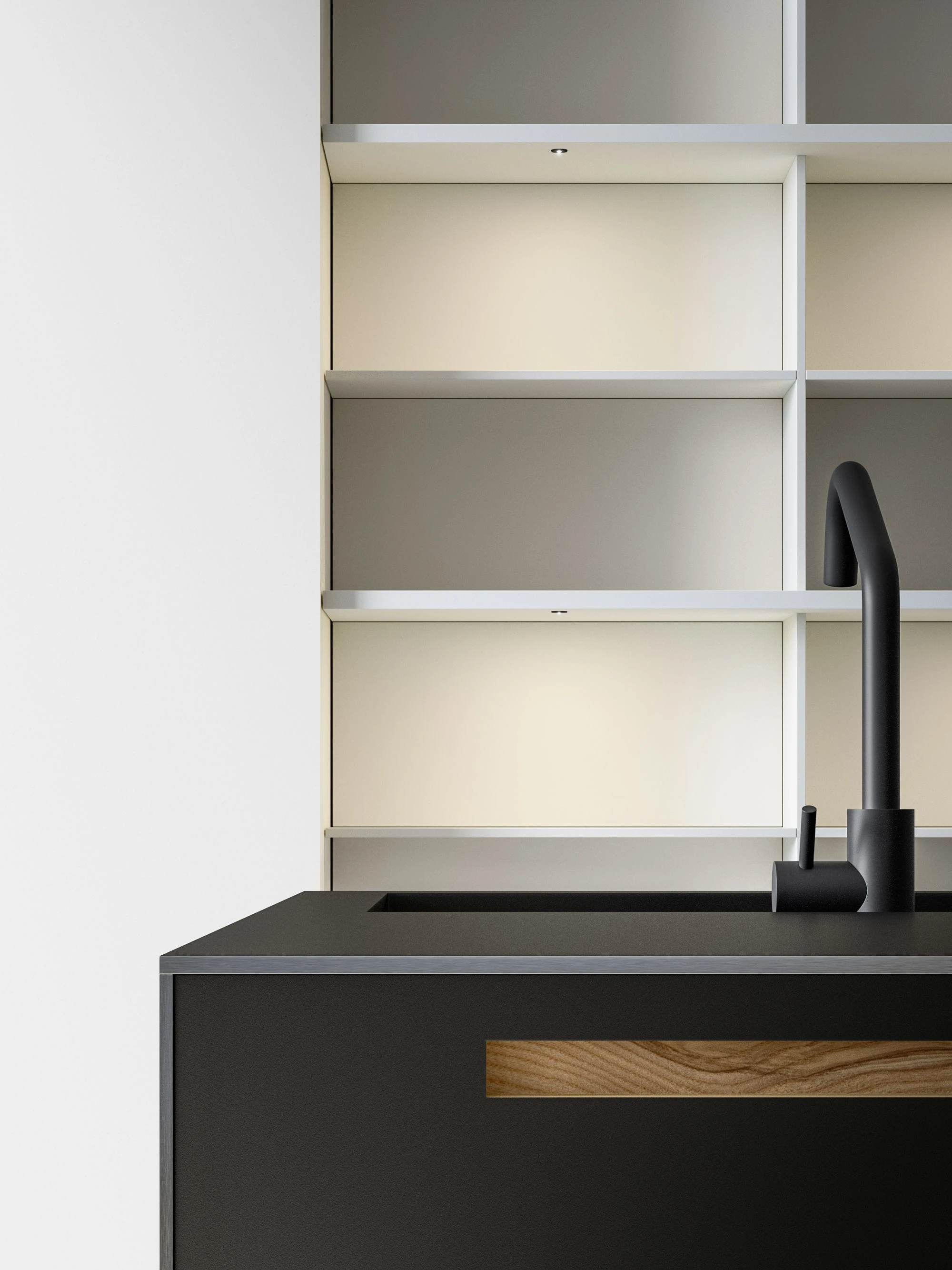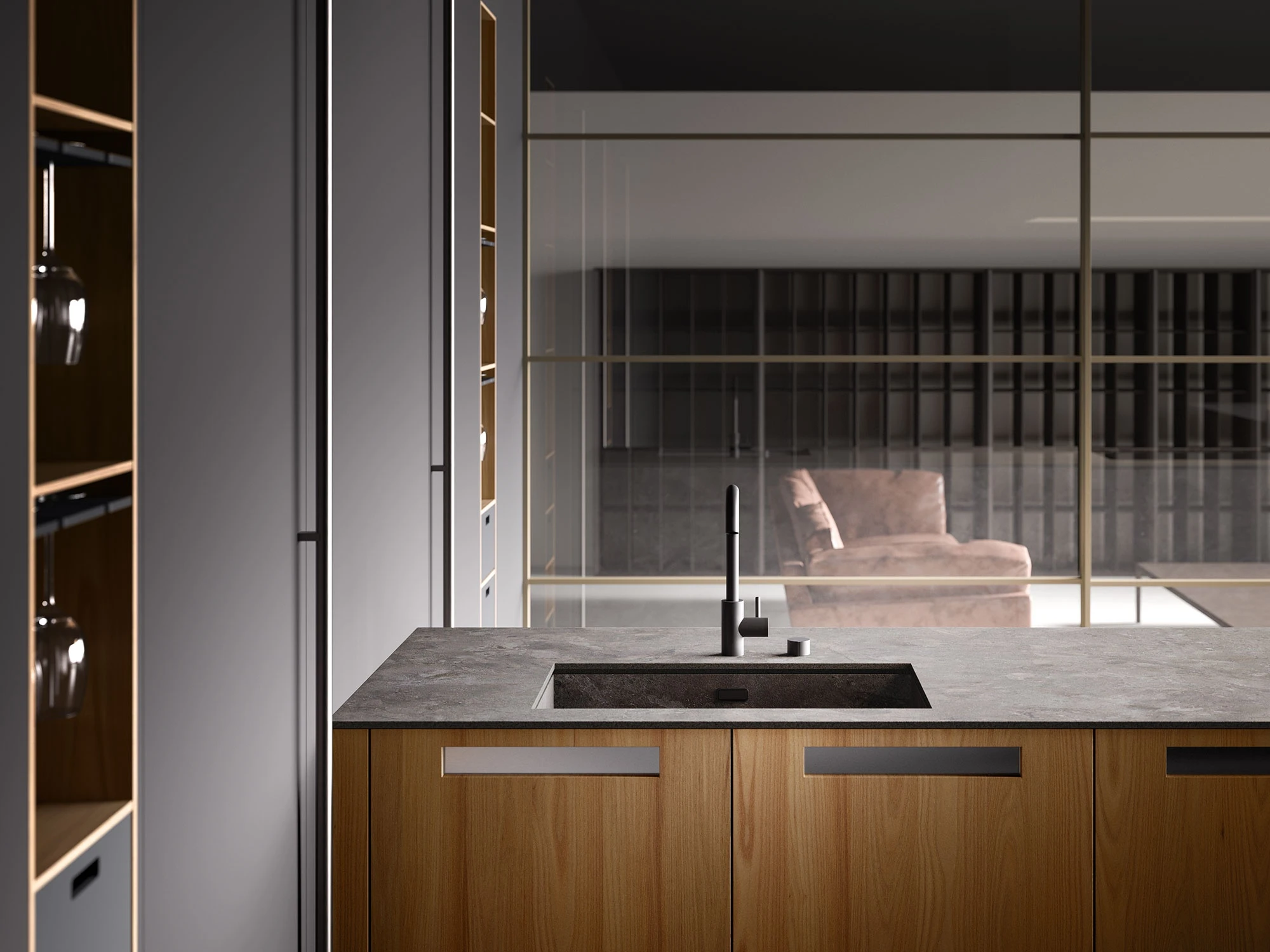 Sloane is a handle designed to enhance the use of natural materials: woods protected with exclusive treatments and stainless steel available in new finishes. This handle is integrated in the door thickness and its decor is in contrast with the different finish of the front, creating various elegant combinations.