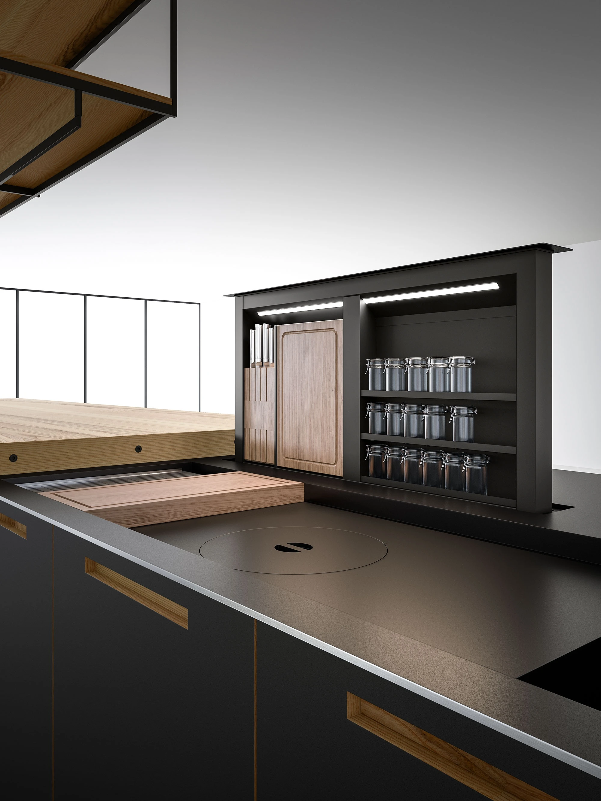 The Aprile kitchen is a project designed to emphasize the value of using natural materials. The kitchen is planned using treated wood finishes, stainless steel and stone in different thicknesses, creating new solutions for worktops and peninsular eating areas.