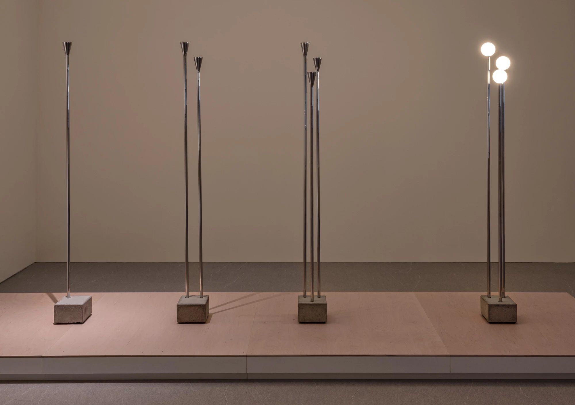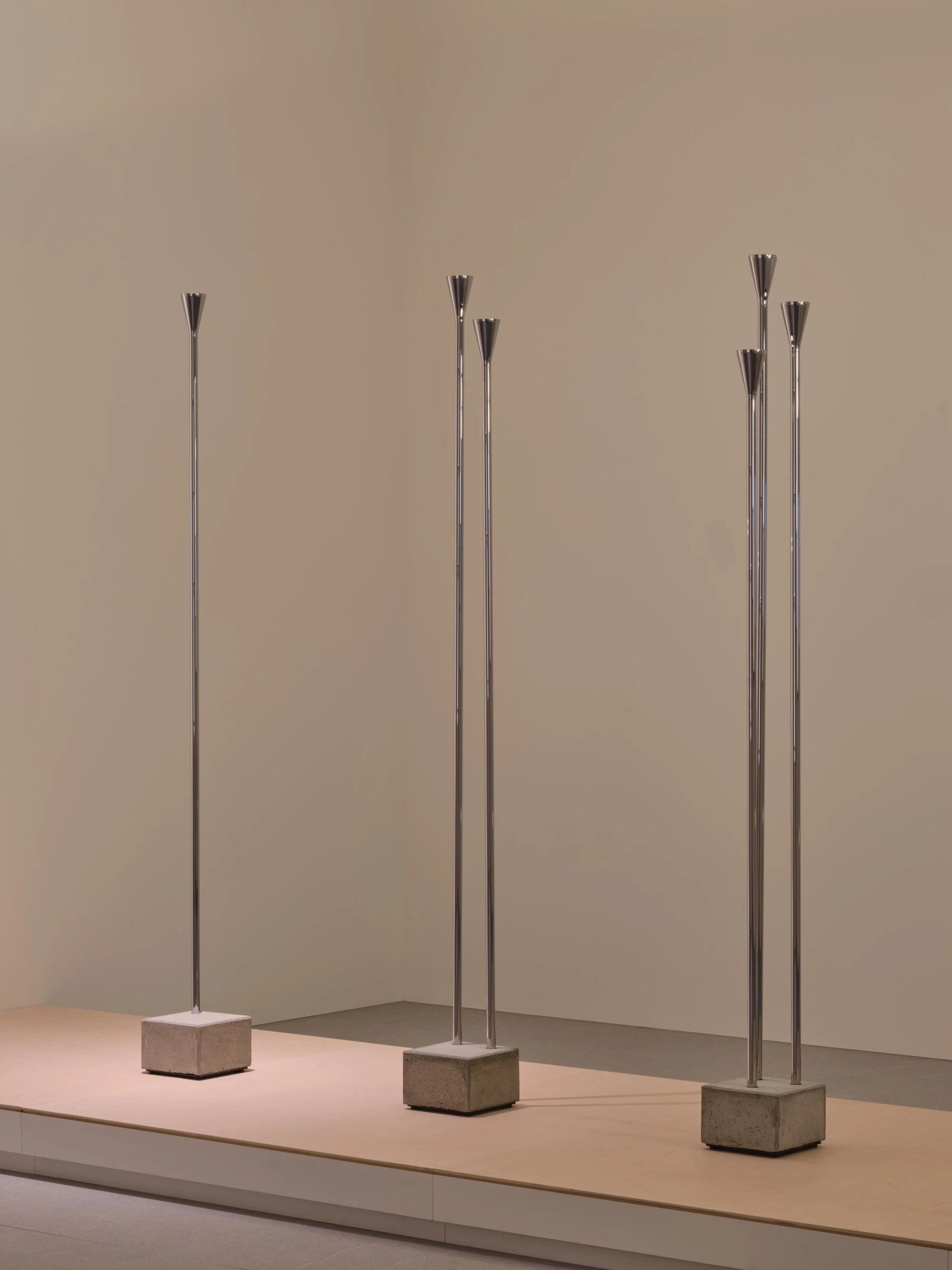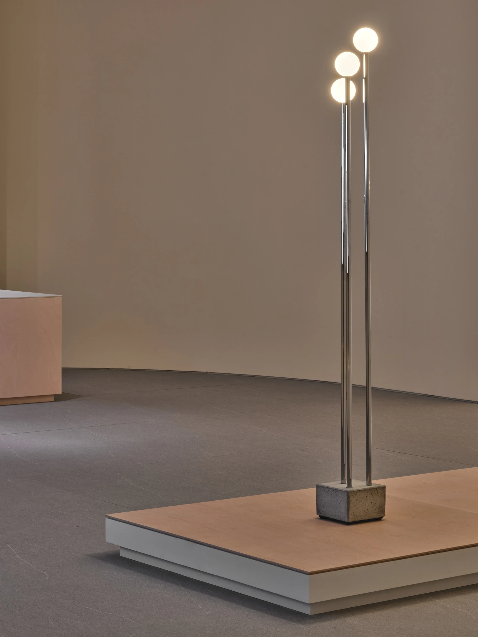 “This lamp was born from a high degree of simplicity and purity. It’s as if I had taken a flaming torch, which is actually the light, and I had placed it inside a support. But this wasn’t enough, and I saw that the torch could be doubled or tripled, so together with Flos we designed a support that could carry up to three torches. However, this torch with a very graceful light, a sort of large candle, was still missing something. I wanted a gentler light diffuser and so I put a glass sphere over it: the light is a torch encased in a sphere. The very materic cement base allows me to mount three lights. The ingenious thing is this socket which locks the light in place. You can buy just one torch at first and then add a second torch later.” Piero Lissoni