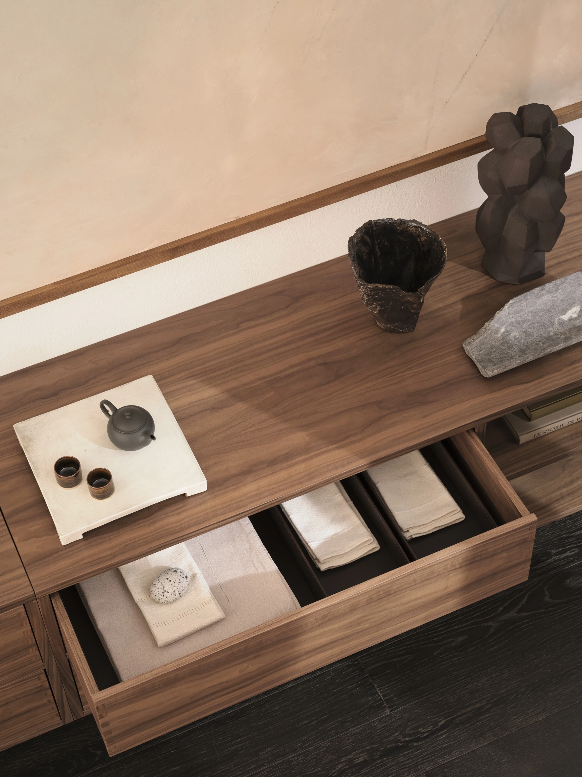 Wood-In is a perfect illustration of De Padova’s craftsmanship and its ability to respect and value the material—in this case, a wood that reveals much about the quality of its cabinetmaking.