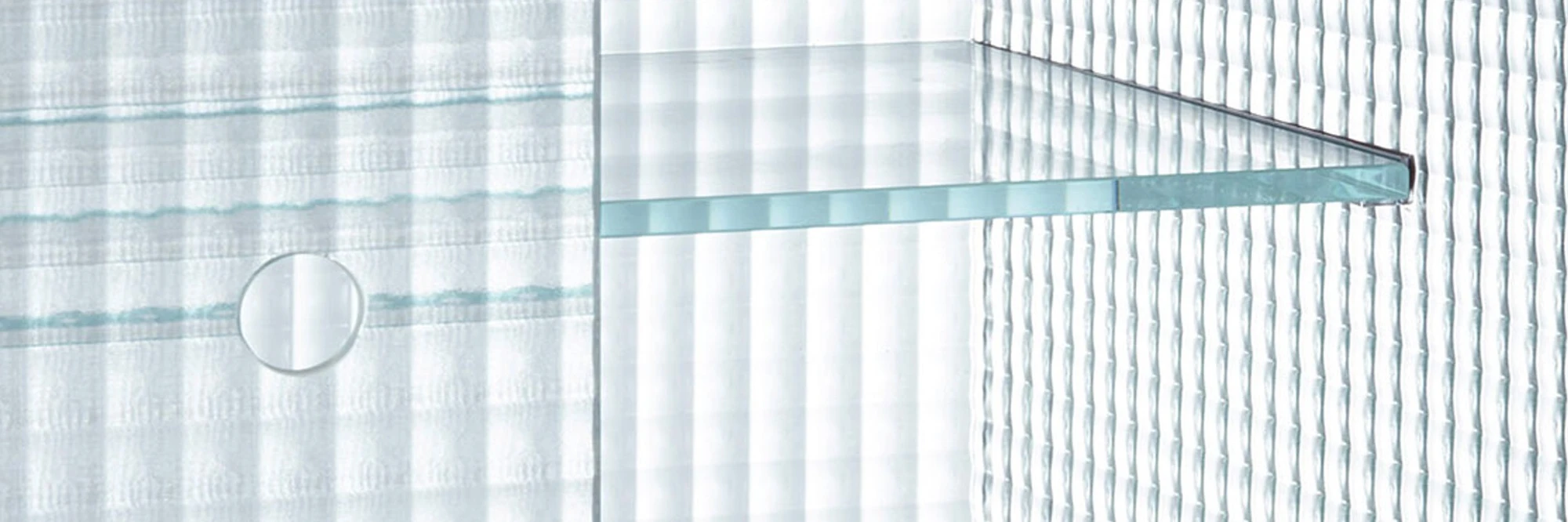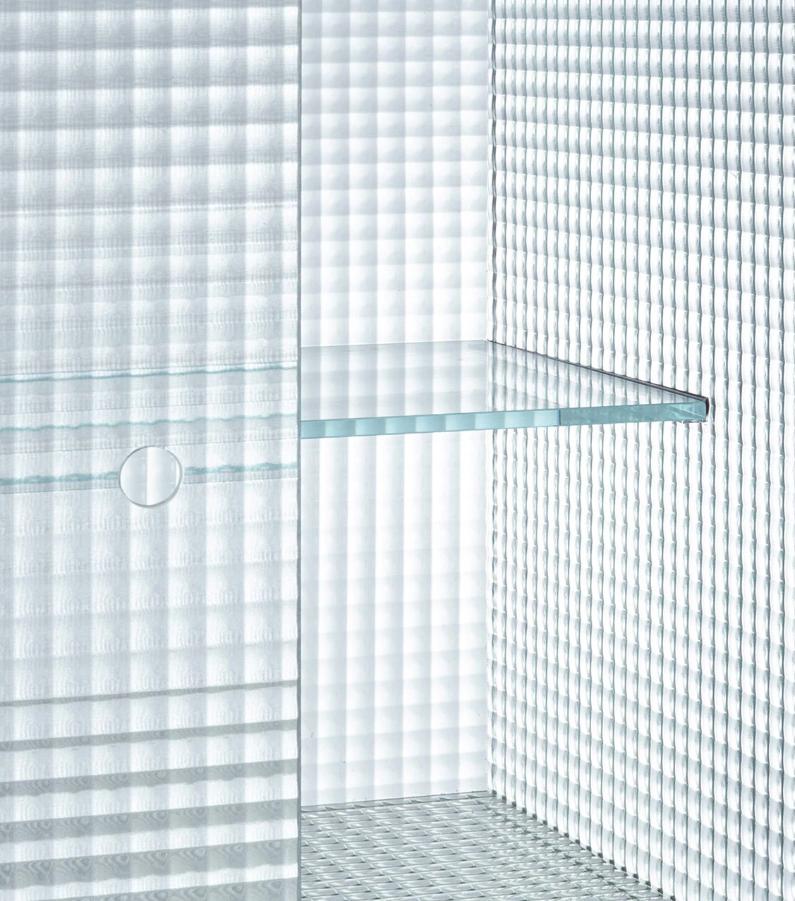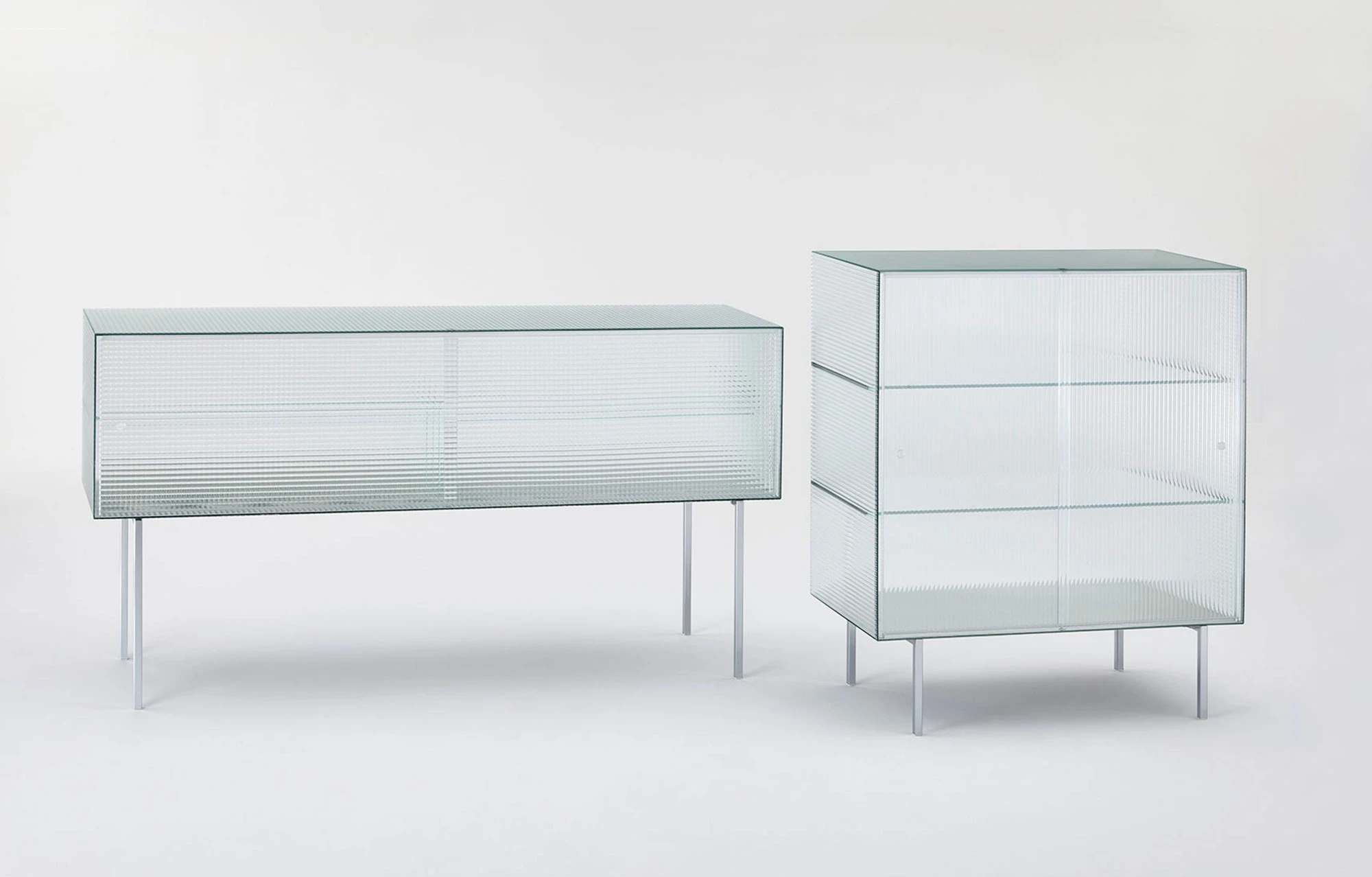 Storage furniture in striped or checked printed glass, tempered and glued 45°, with silvered base. The sliding doors run in transparent plexiglass tracks, whilst the slender legs are in glossy chromium-plated metal.
