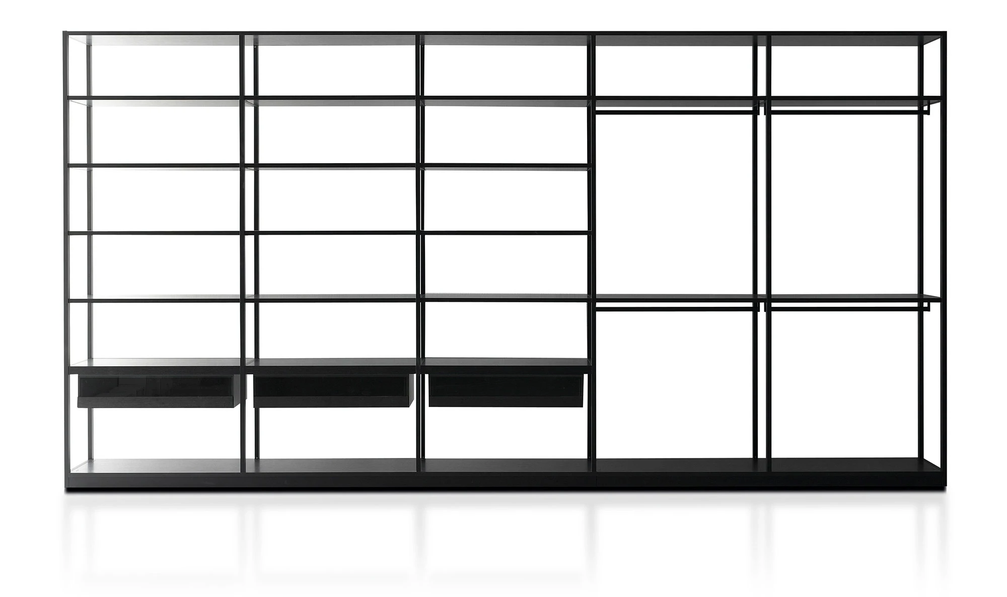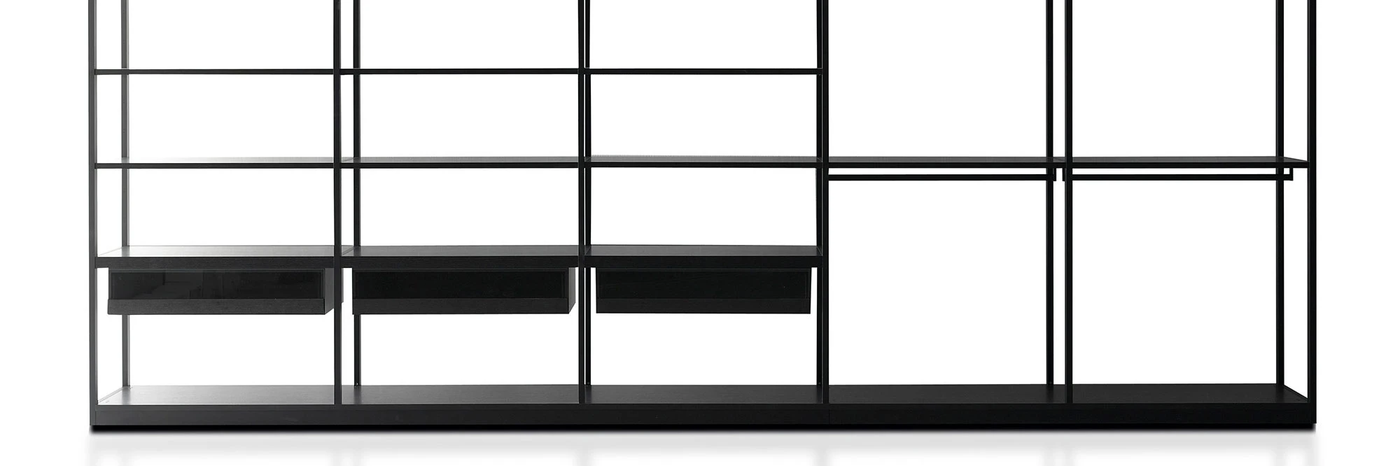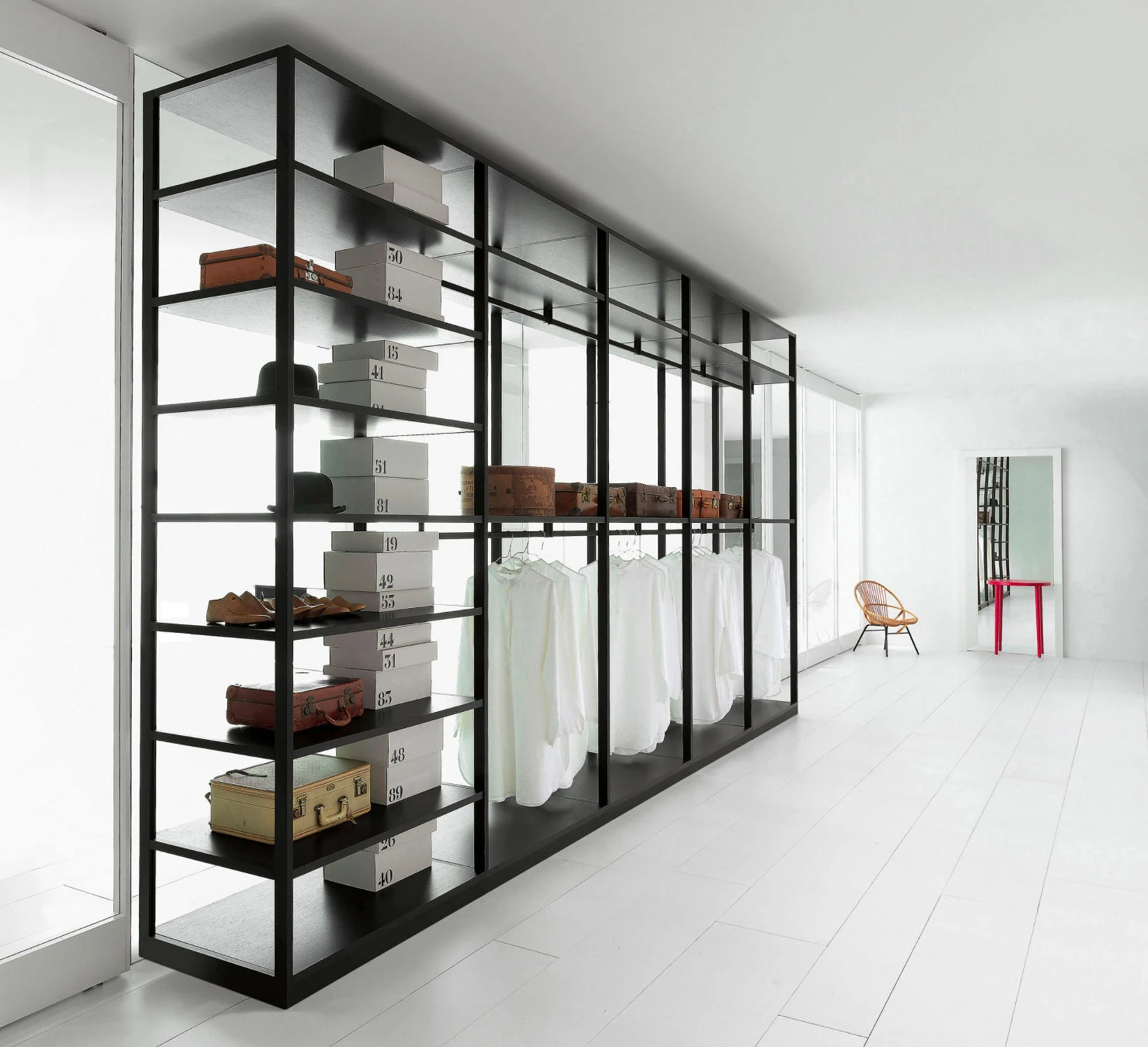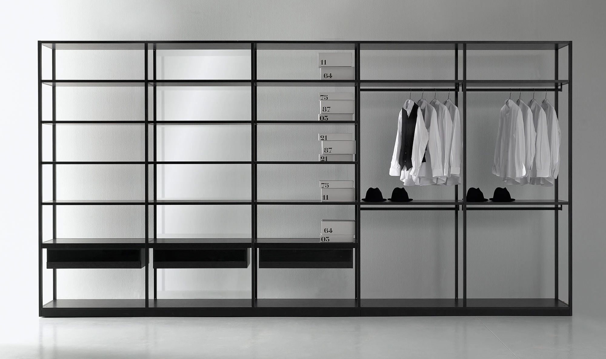 Storage Air is a self-standing wardrobe that can be left open with the contents visible or closed with back and side panels and with doors in transparent or smoked glass and iron or burnished brass profiles.