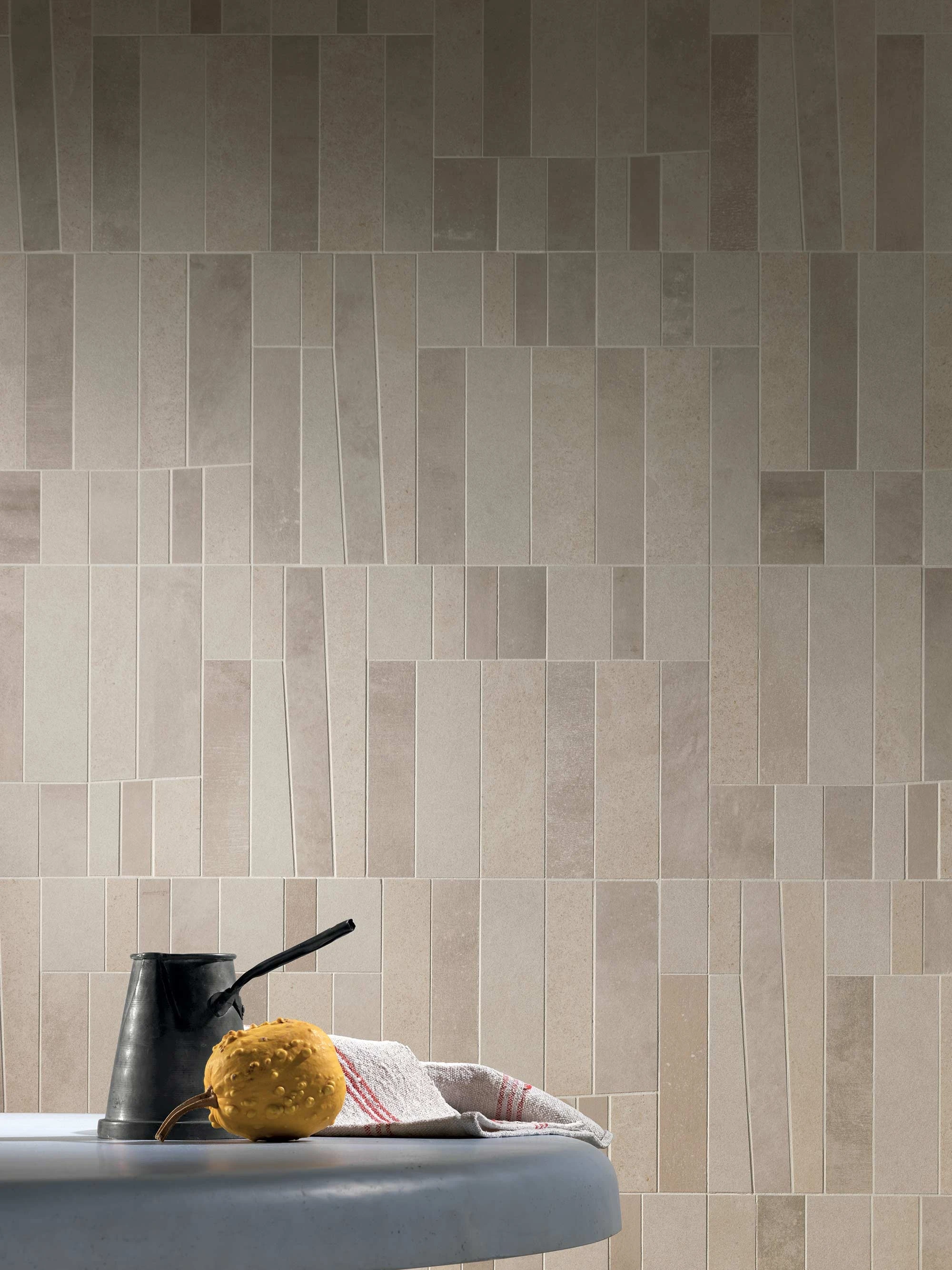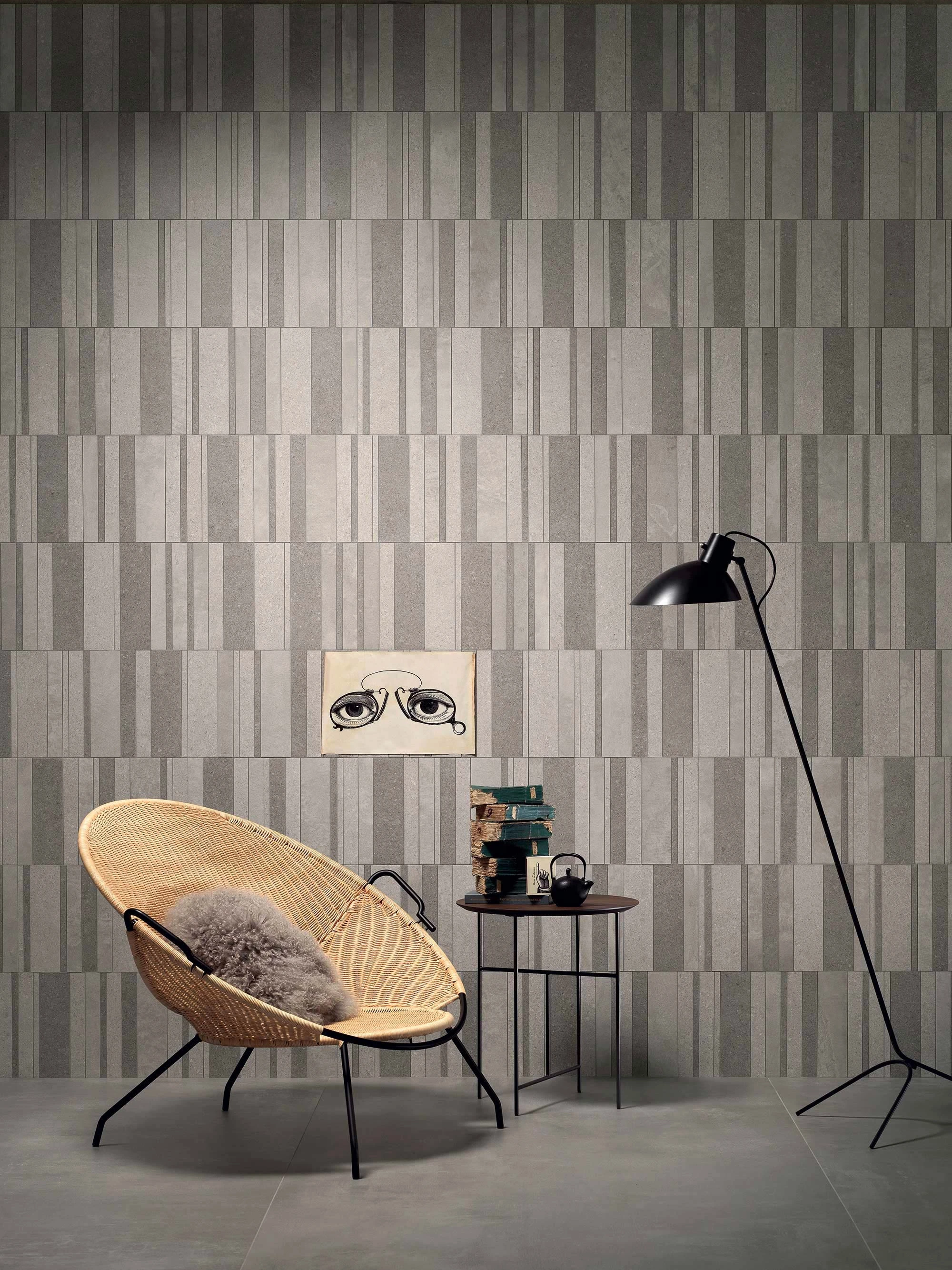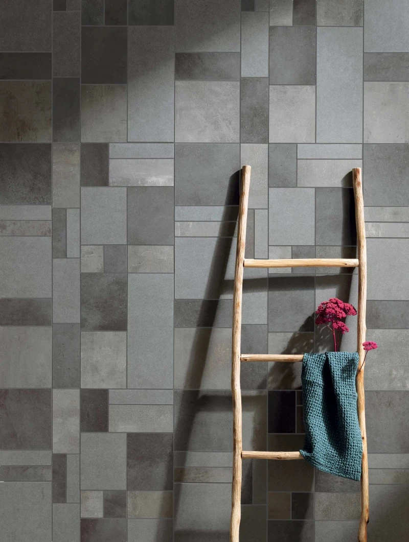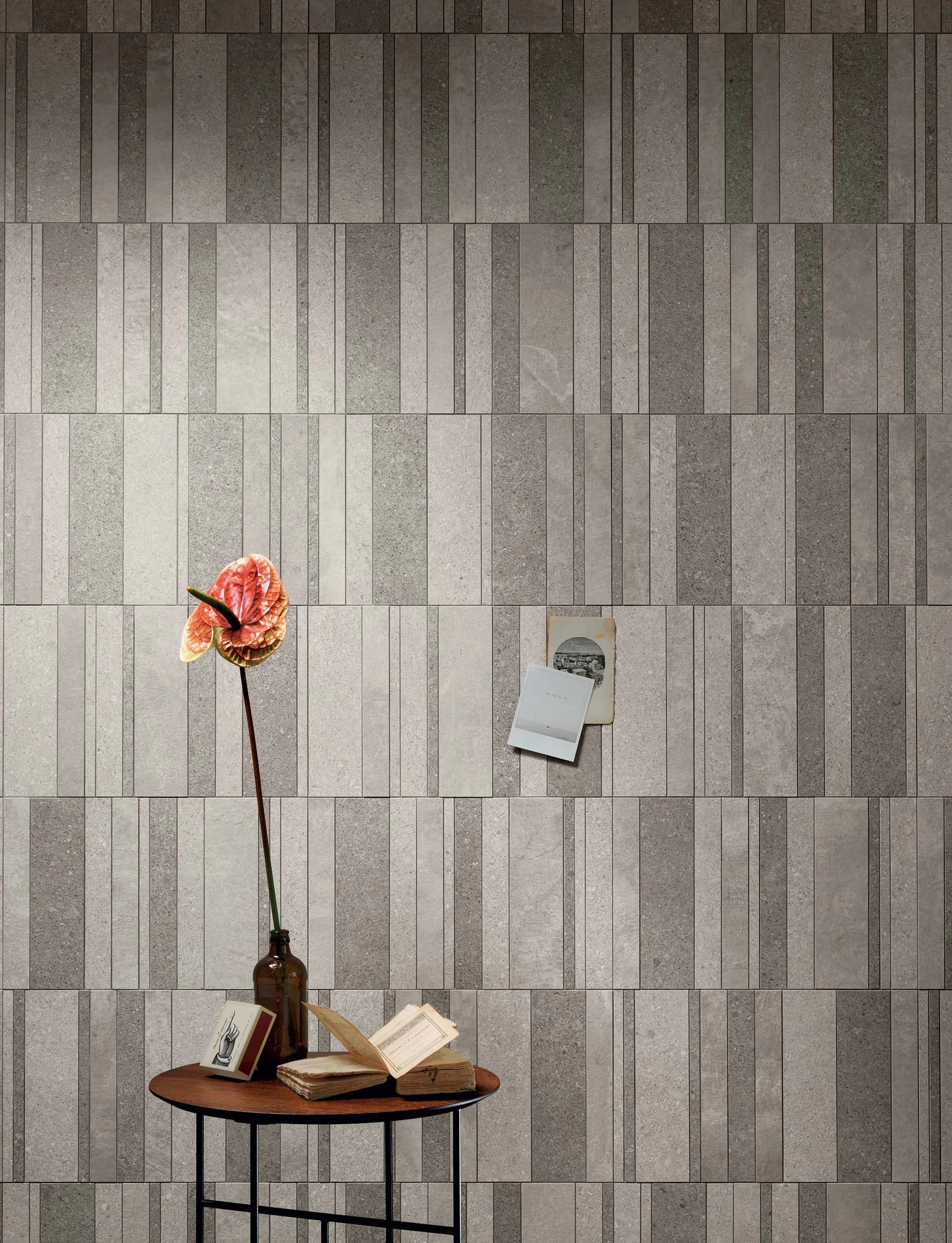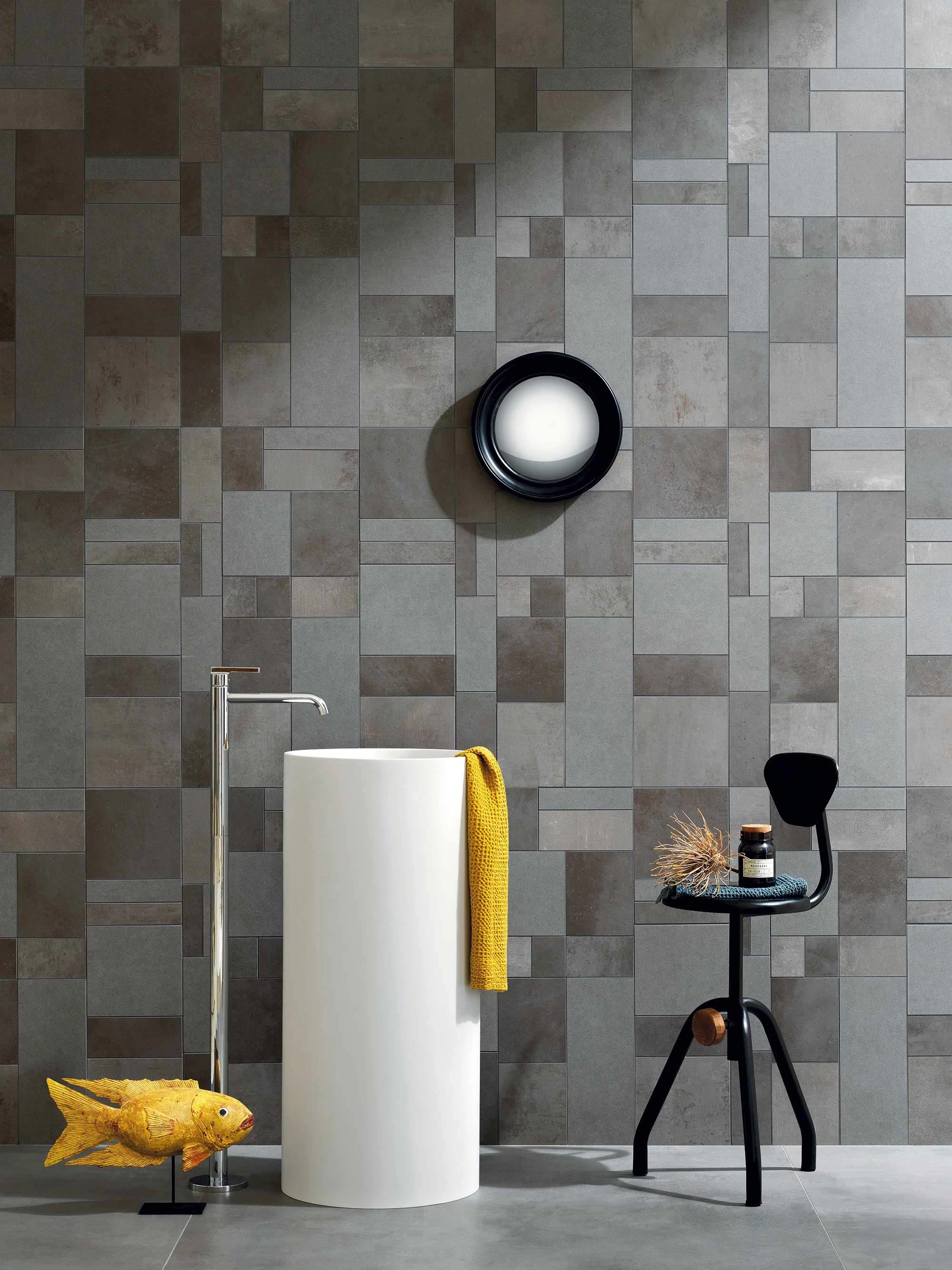 The project is divided into four porcelain tile mosaics inspired by the world of cement and minimalist stones, in shades ranging from warm white to beige with traces of clay and dove gray, from grays in cooler and lighter tones to the darker anthracite and smoke.