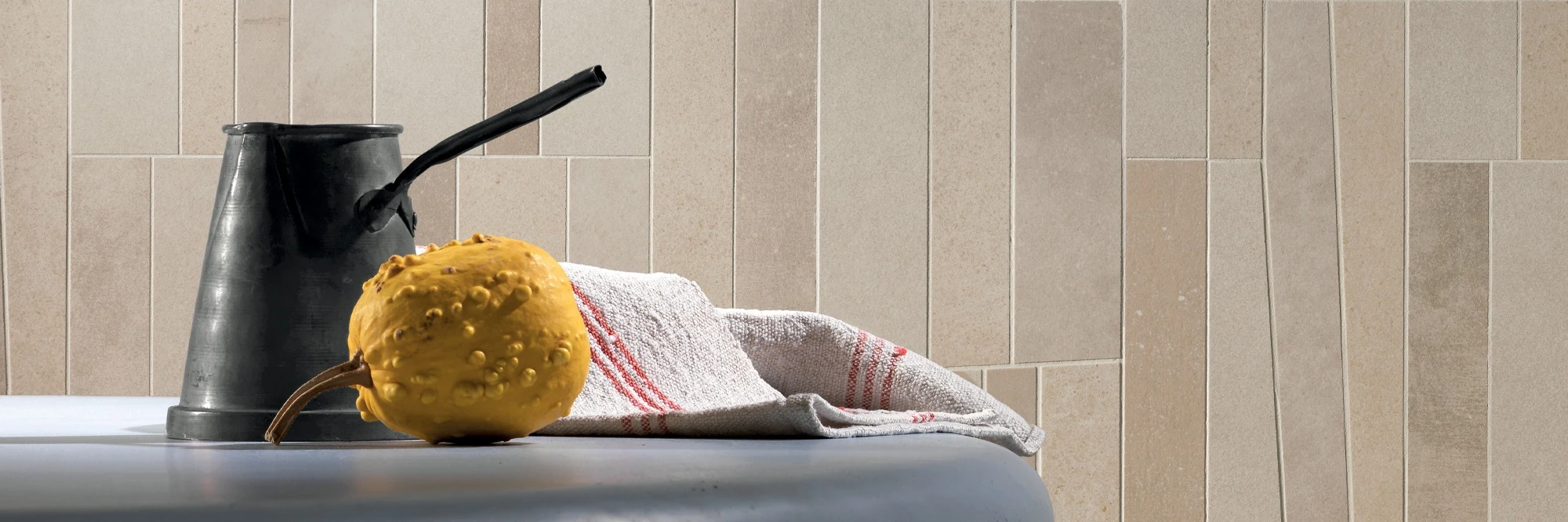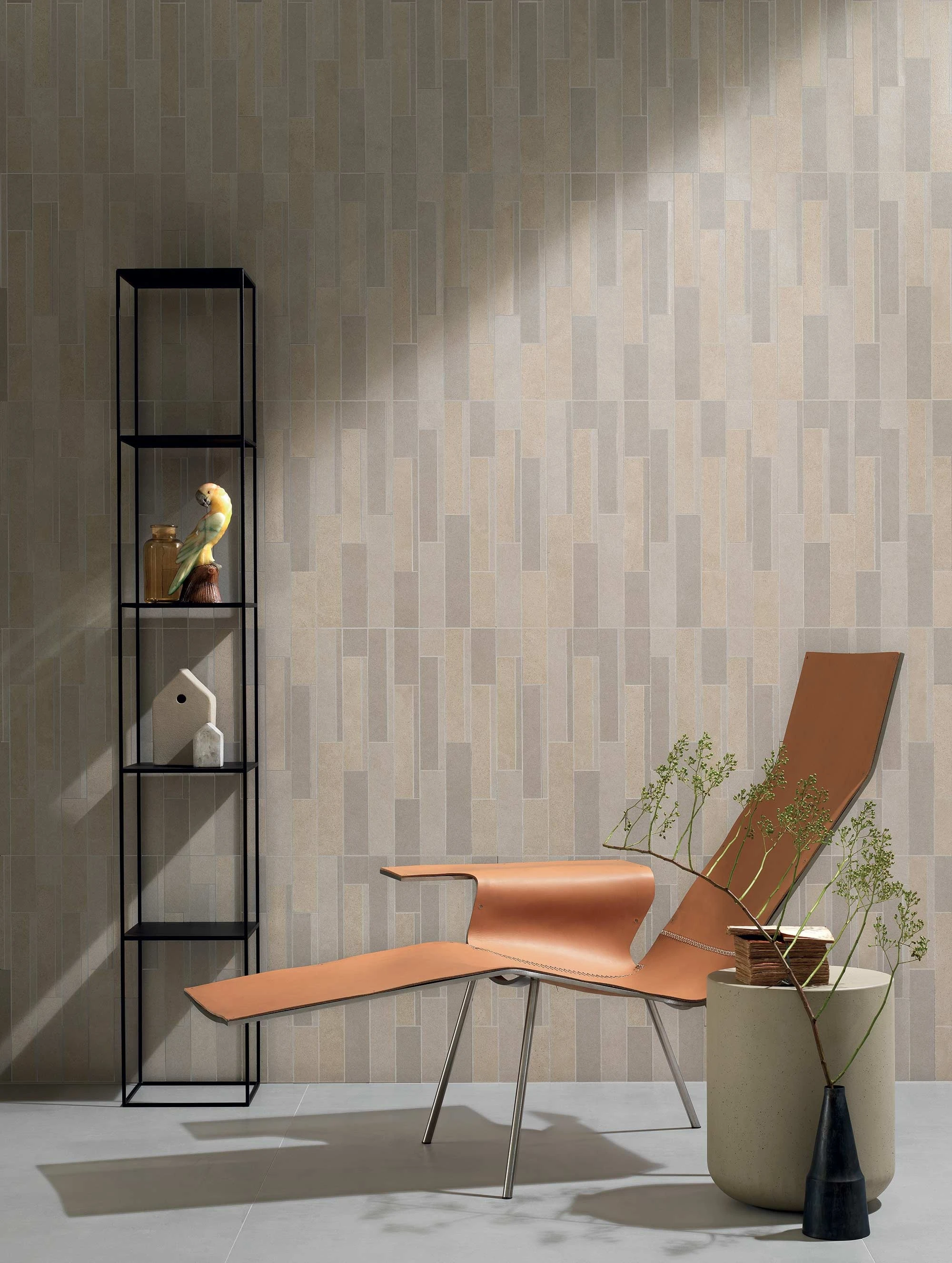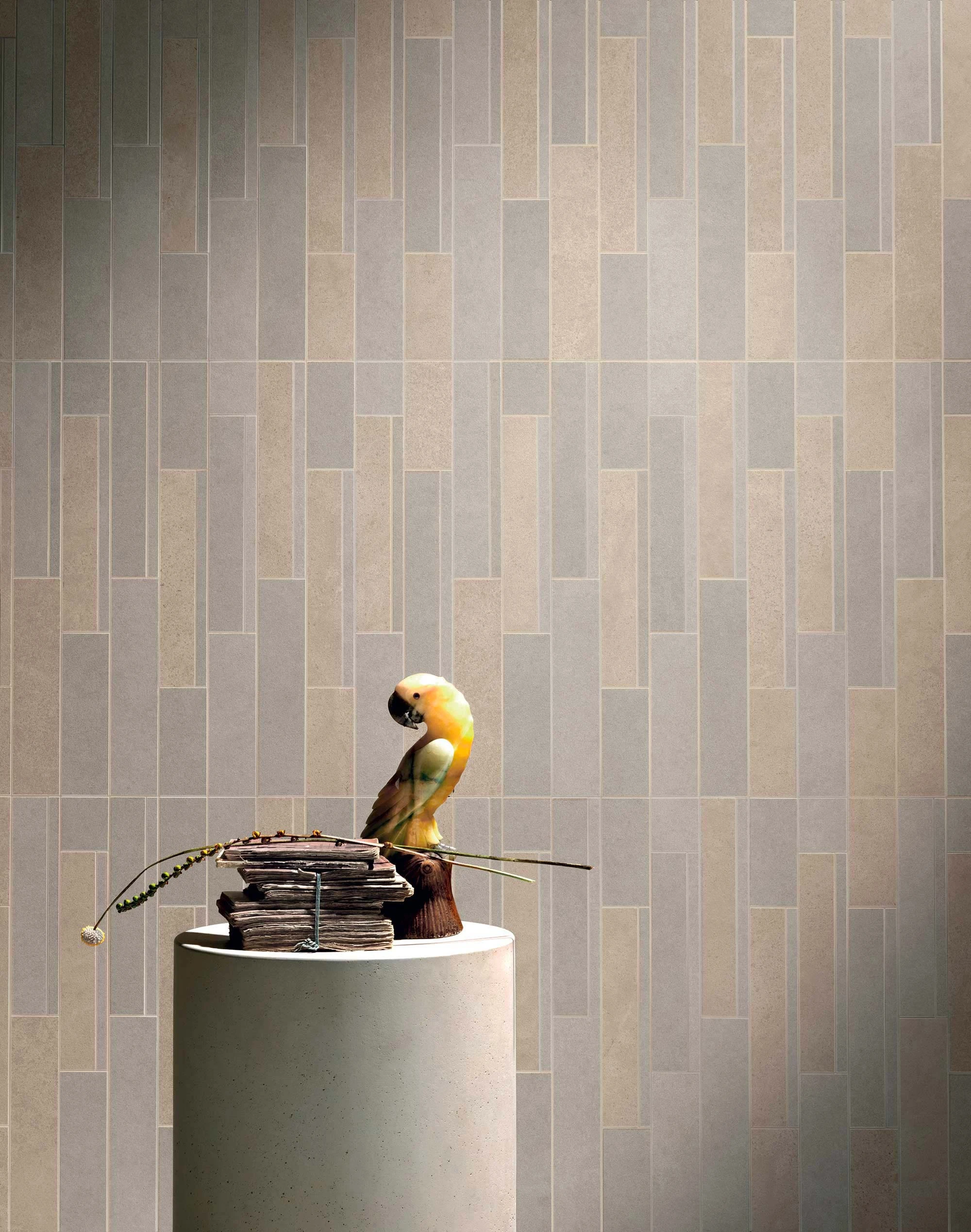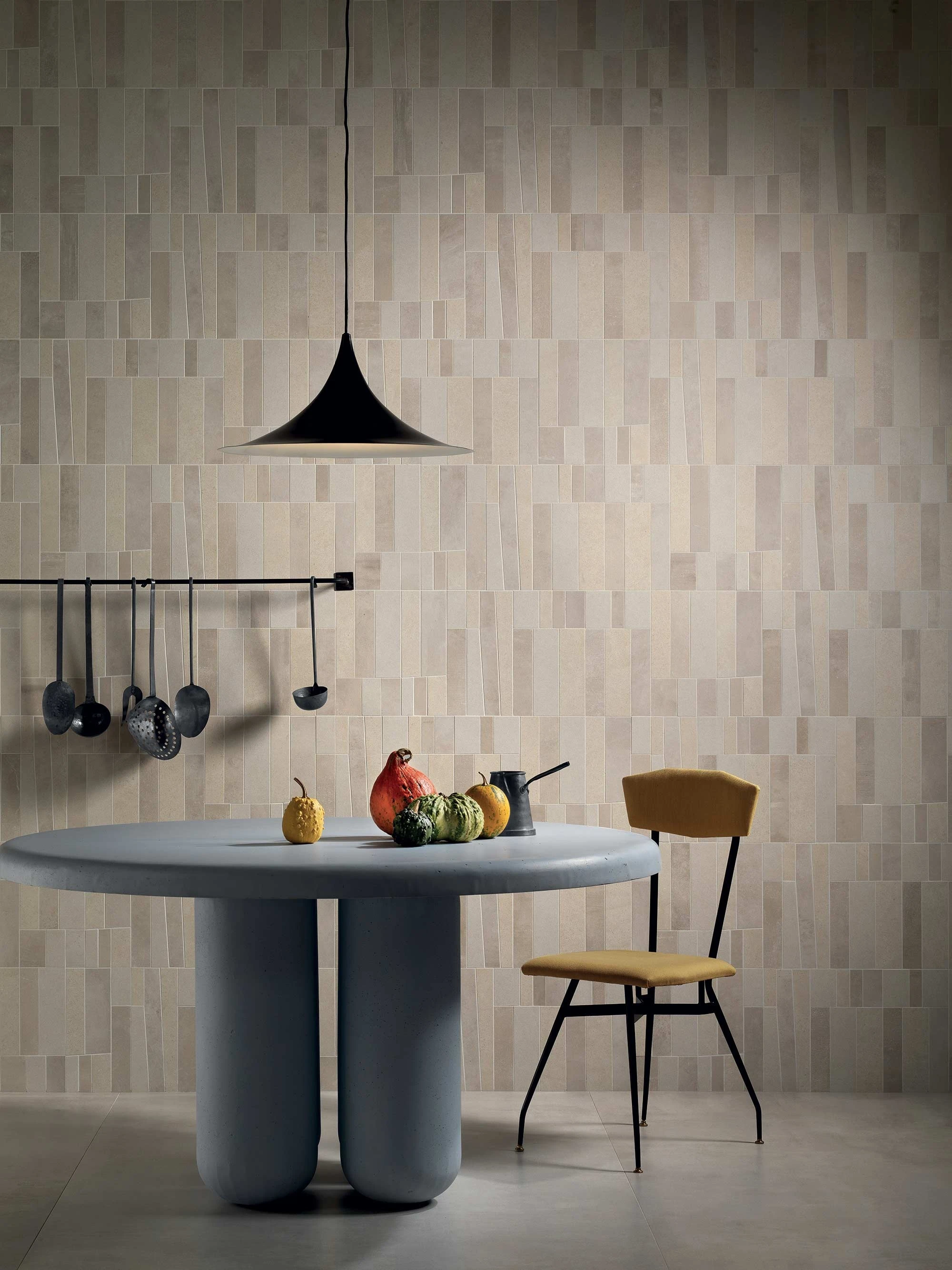 The project is divided into four porcelain tile mosaics inspired by the world of cement and minimalist stones, in shades ranging from warm white to beige with traces of clay and dove gray, from grays in cooler and lighter tones to the darker anthracite and smoke.