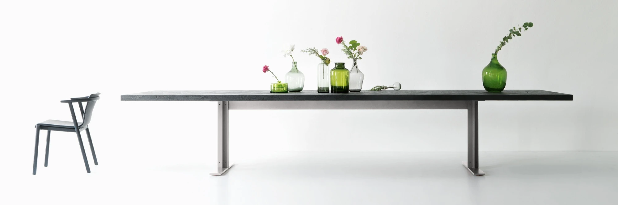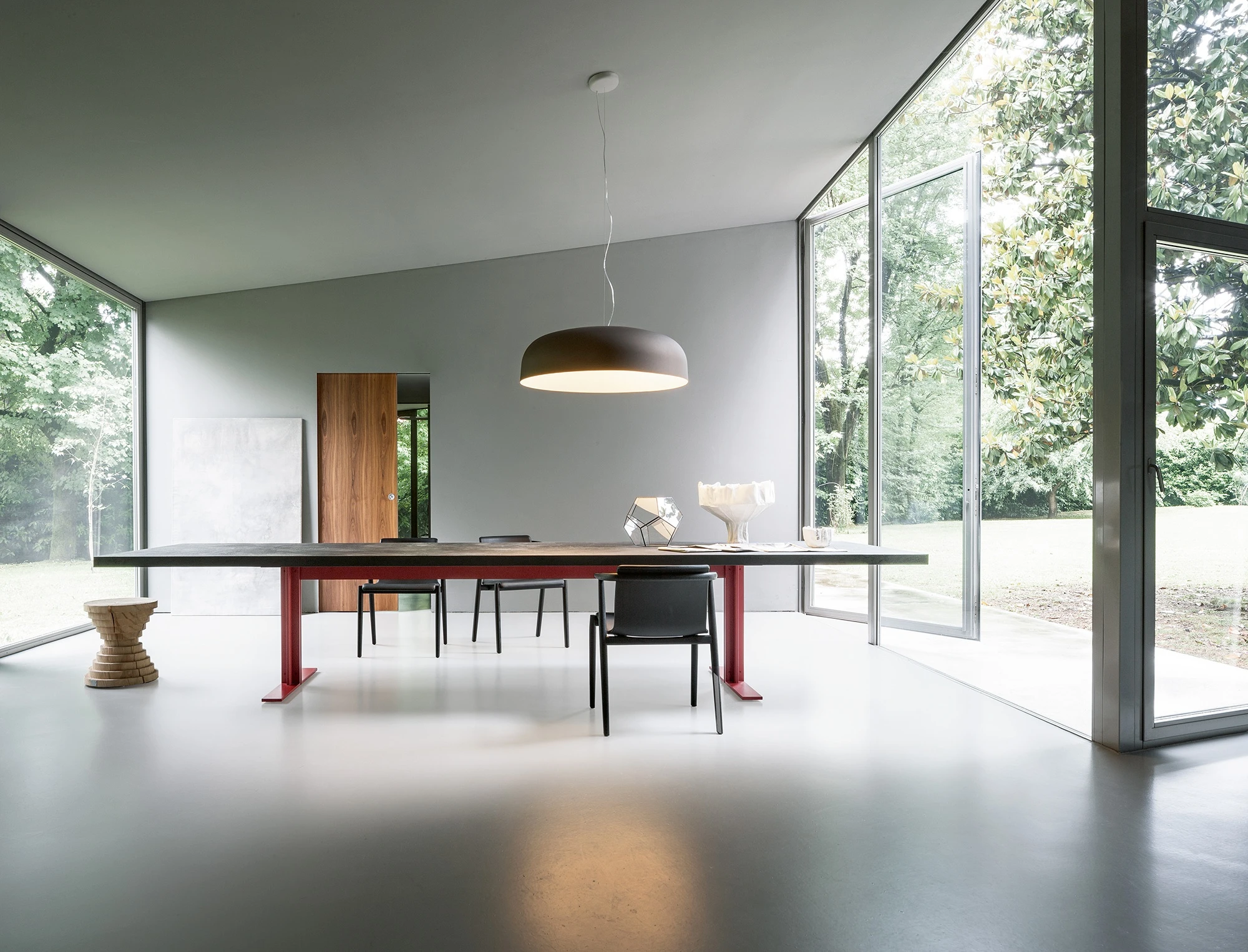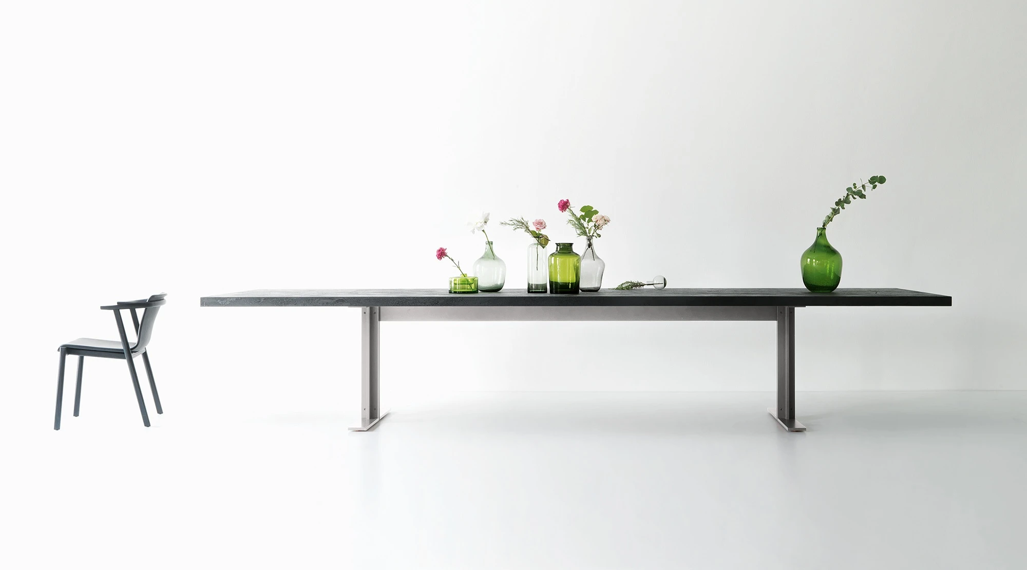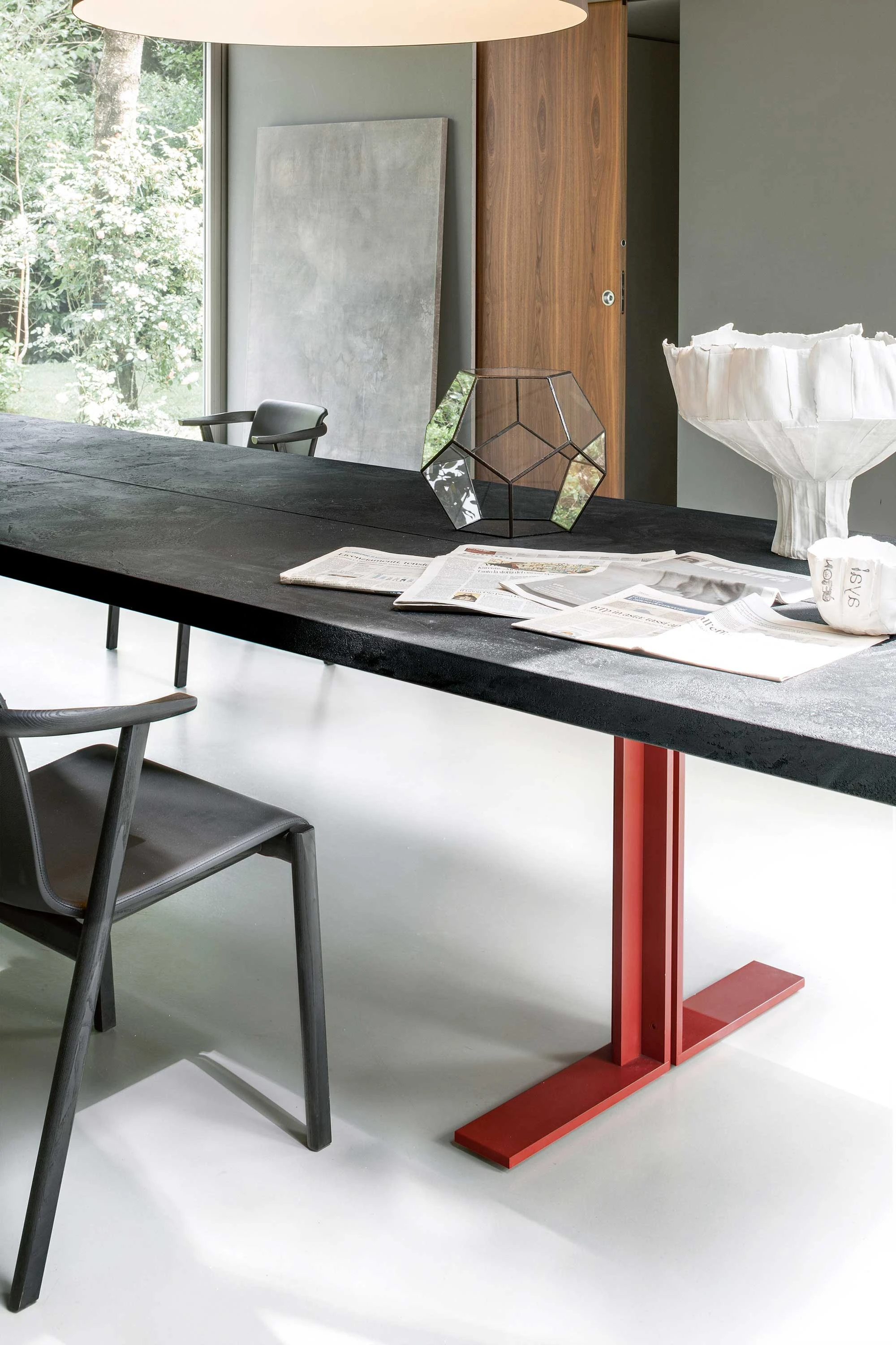 Designed to furnish a large dining area or a refined meeting room, the Memo table is characterized by discrete minimalism and large proportions. Available in two versions, 300 ×110 cm and 400 x 110 cm, it is the very antithesis of ostentatious design, a perfect equilibrium of elements with great expressive character – the top in heat-treated oak or Lava stone and the structure in metal.