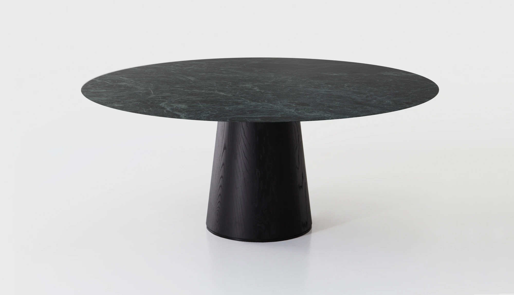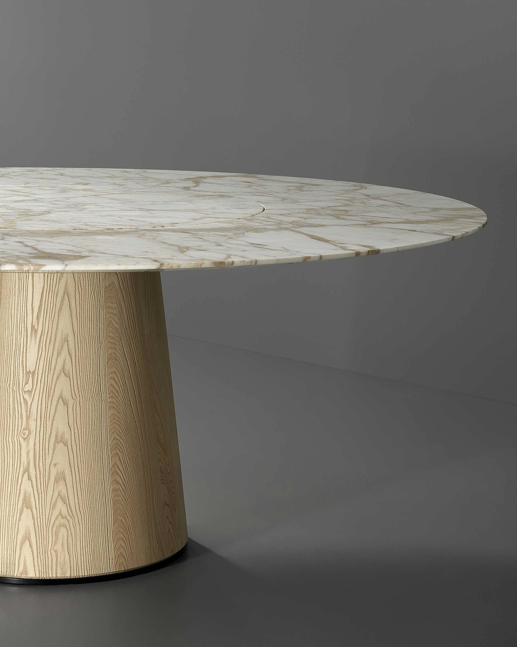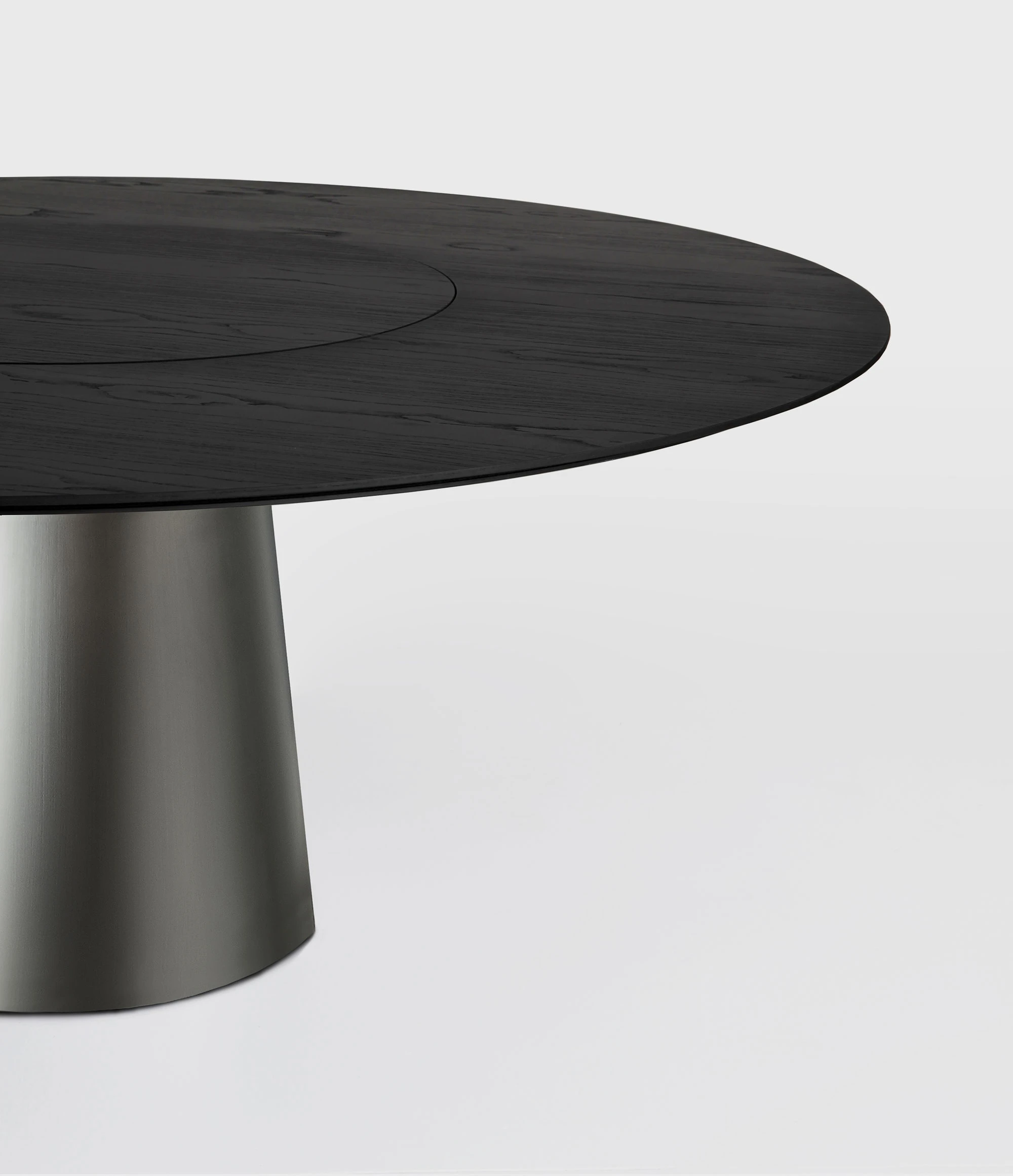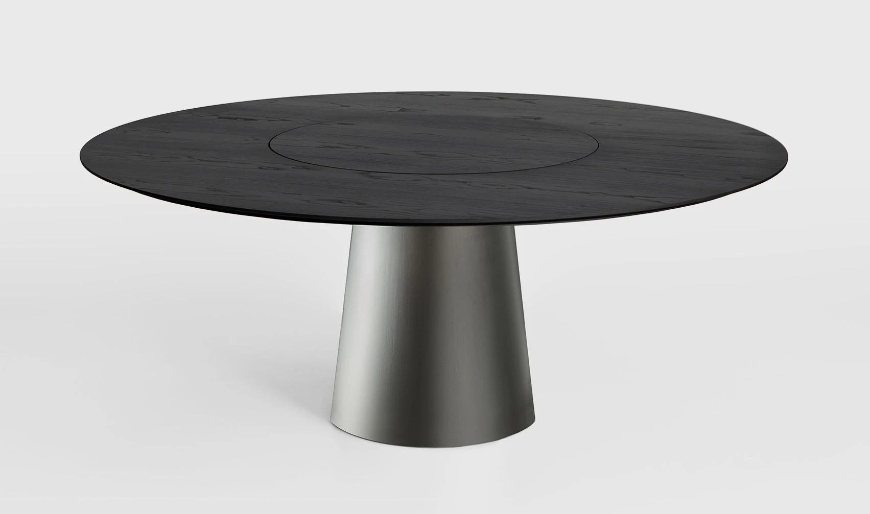 The Materic table is a sculptural object where the absolute simplicity of design is juxtaposed with the sophistication of materials and workmanship. Materic features a round and bevelled top placed on a base formed of a truncated cone. The top can also incorporate a rotating tray in the centre.
