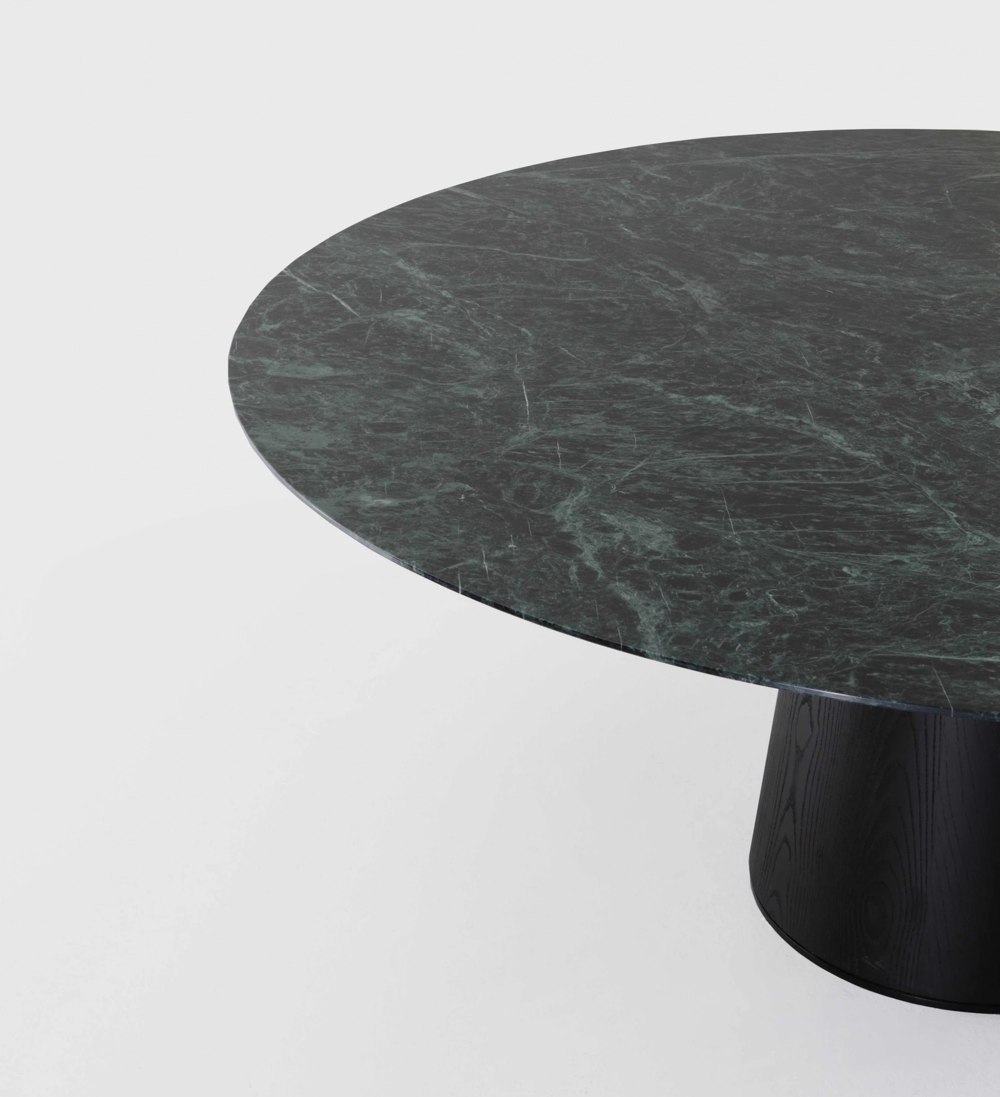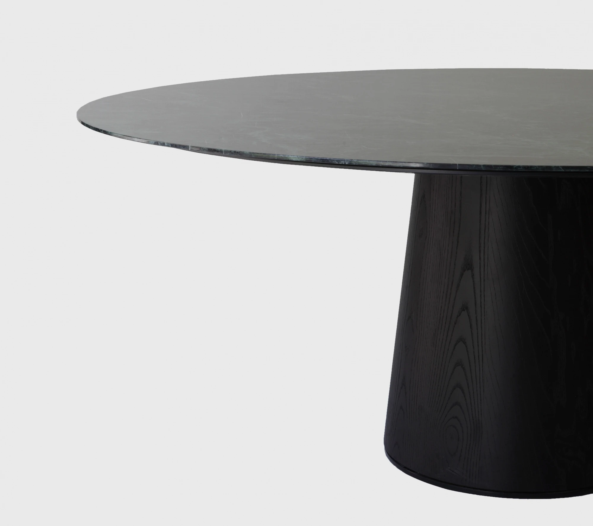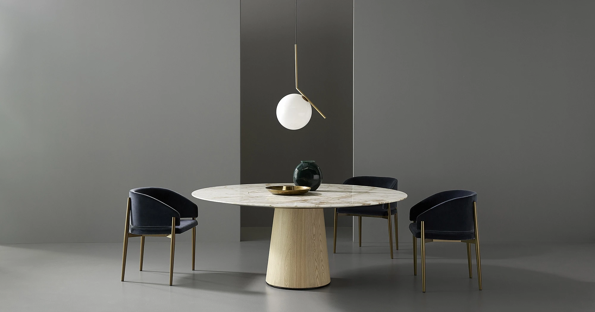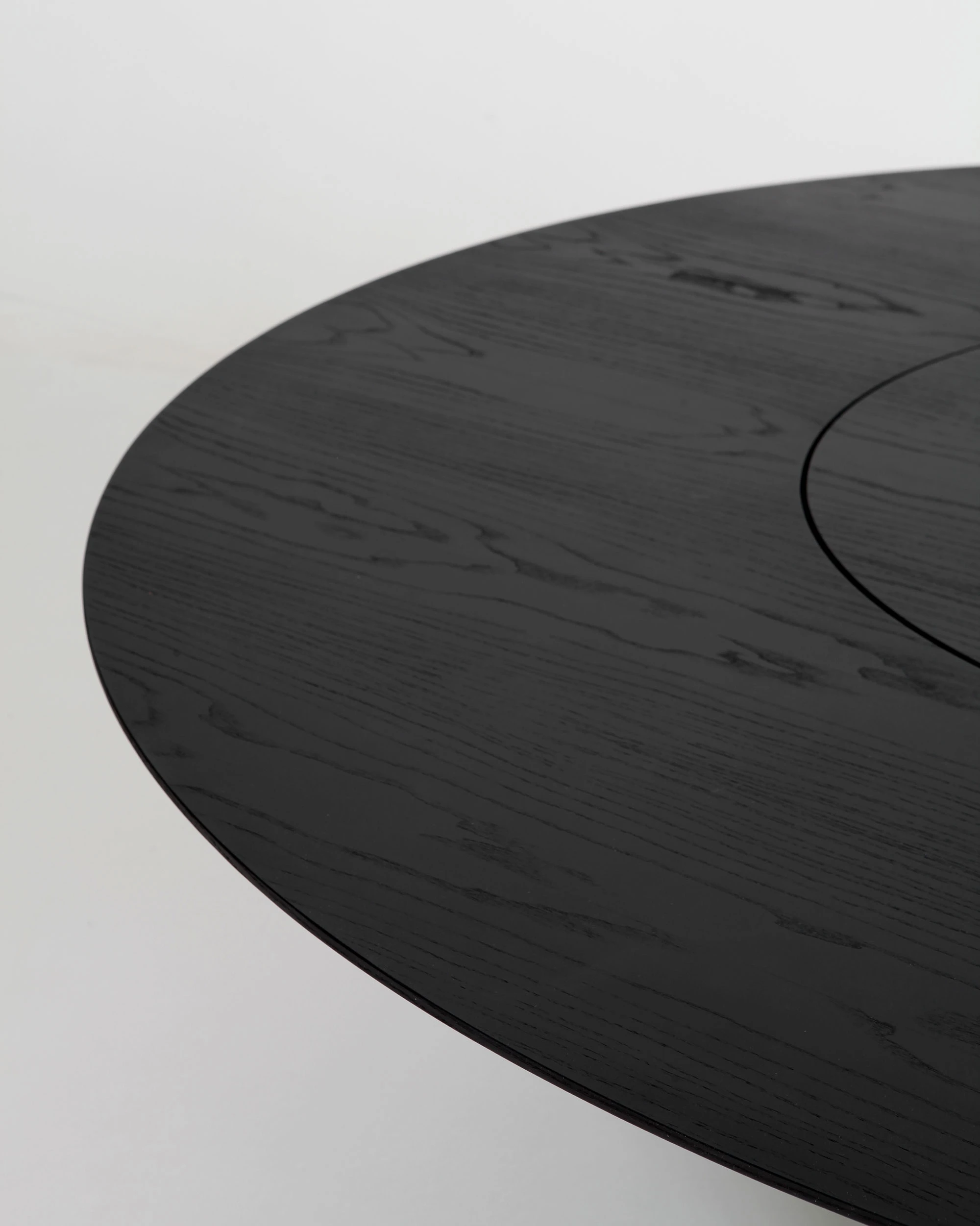 The Materic table is a sculptural object where the absolute simplicity of design is juxtaposed with the sophistication of materials and workmanship. Materic features a round and bevelled top placed on a base formed of a truncated cone. The top can also incorporate a rotating tray in the centre.