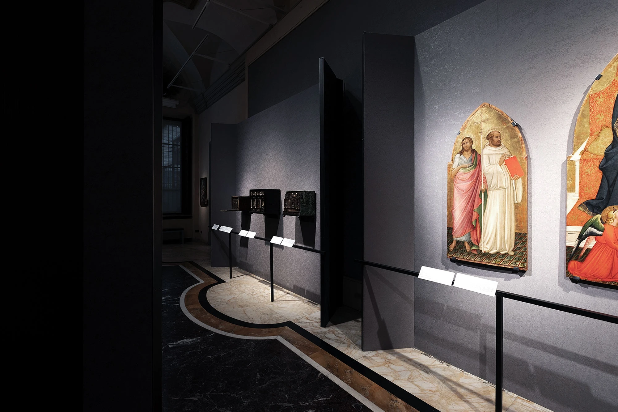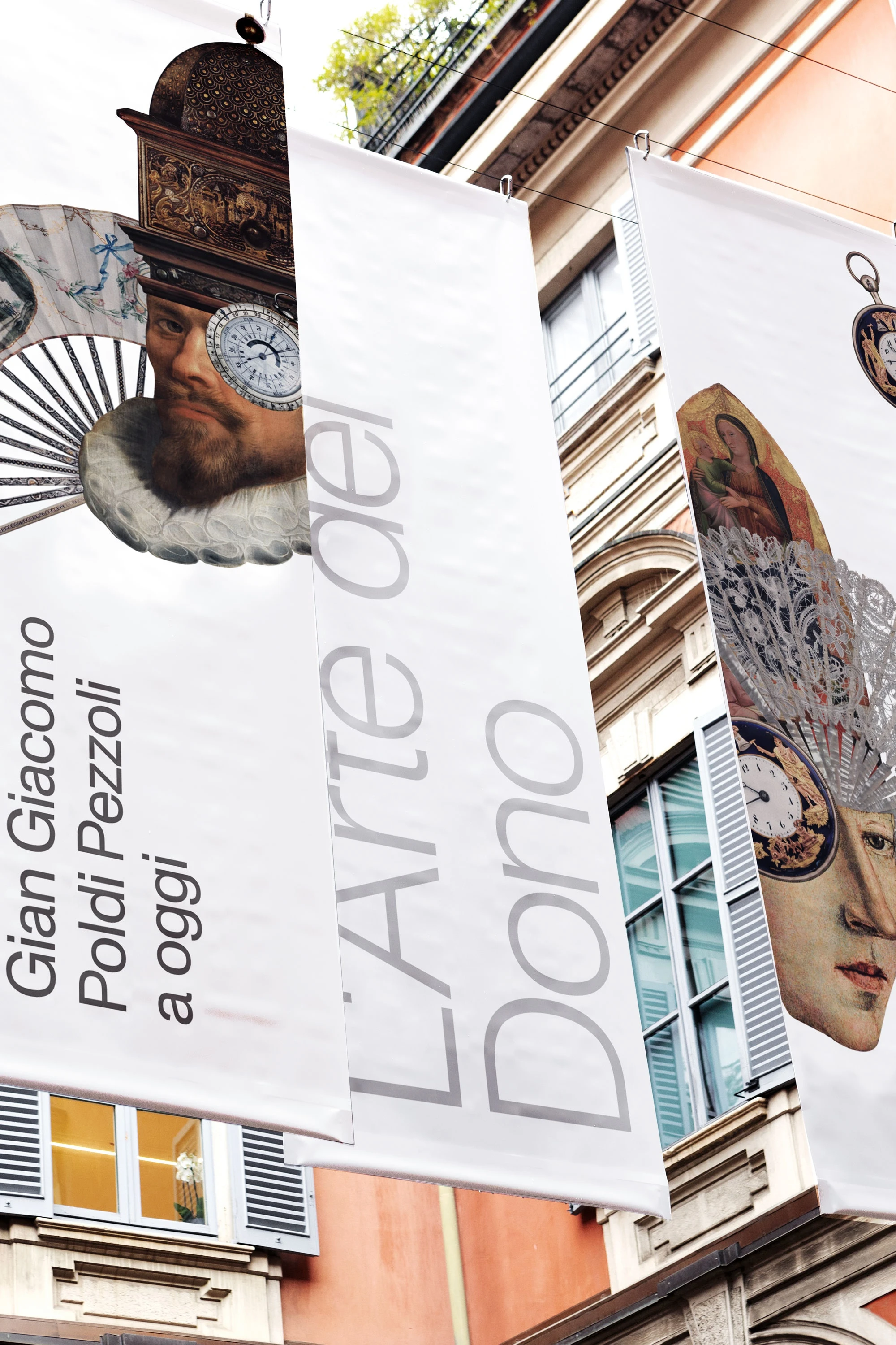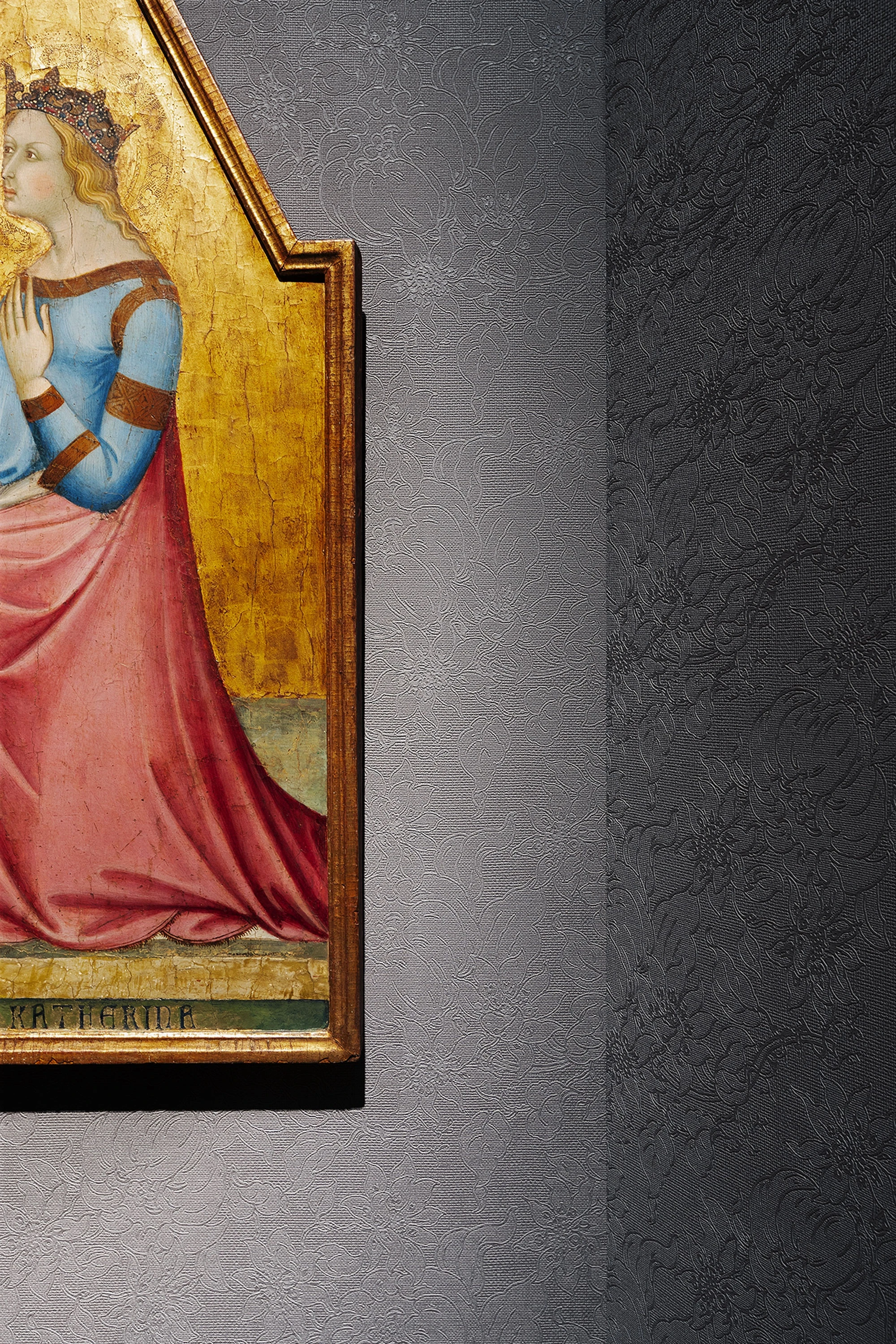 The exhibition fit-out, along with the graphics project, was developed by Lissoni & Partners and presents the works by evoking a domestic dimension, isolating them individually or gathering them together by type into small groups and placing them in niches lined with wallpaper, an element that recalls the house that once belonged to Gian Giacomo Poldi Pezzoli.