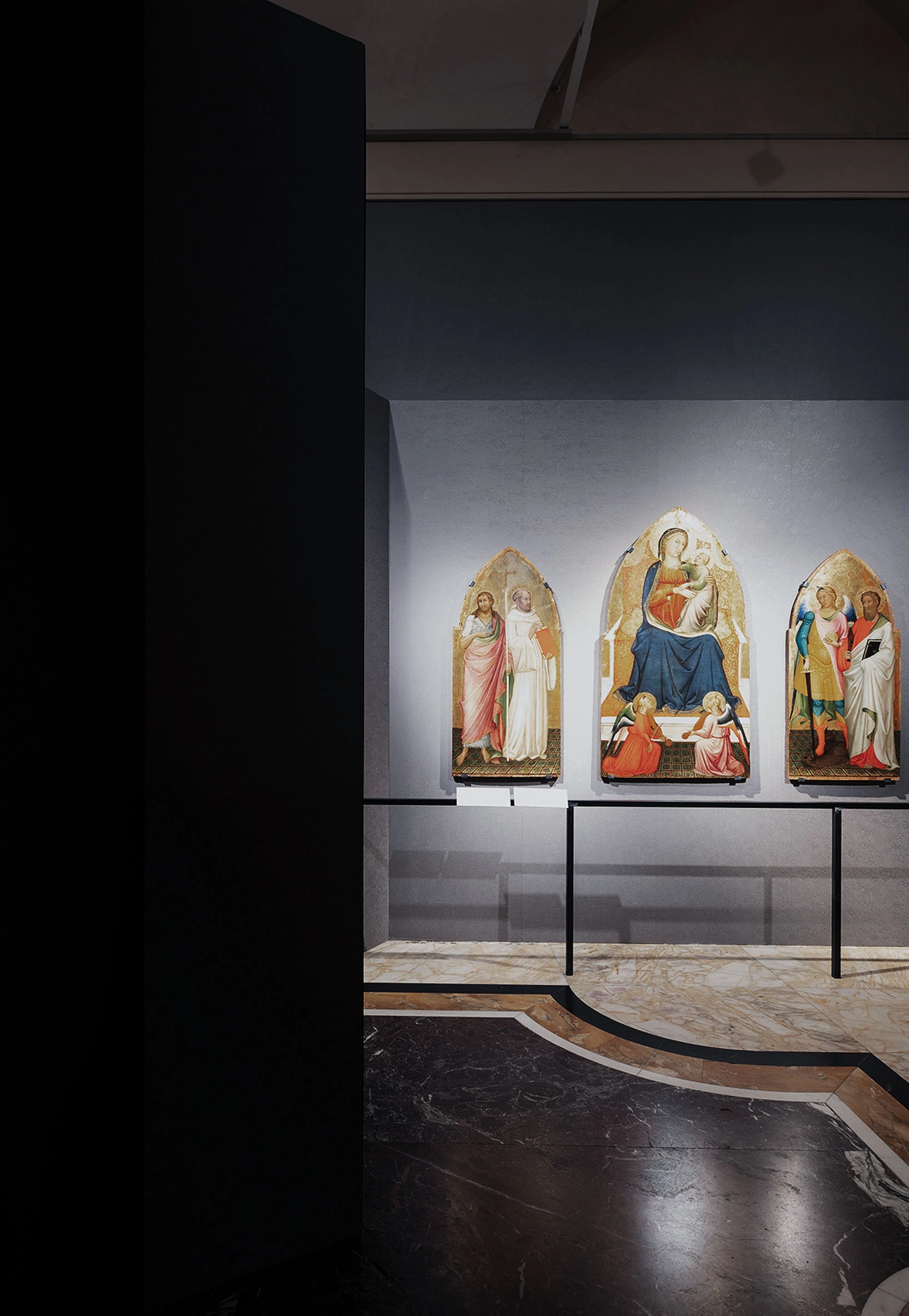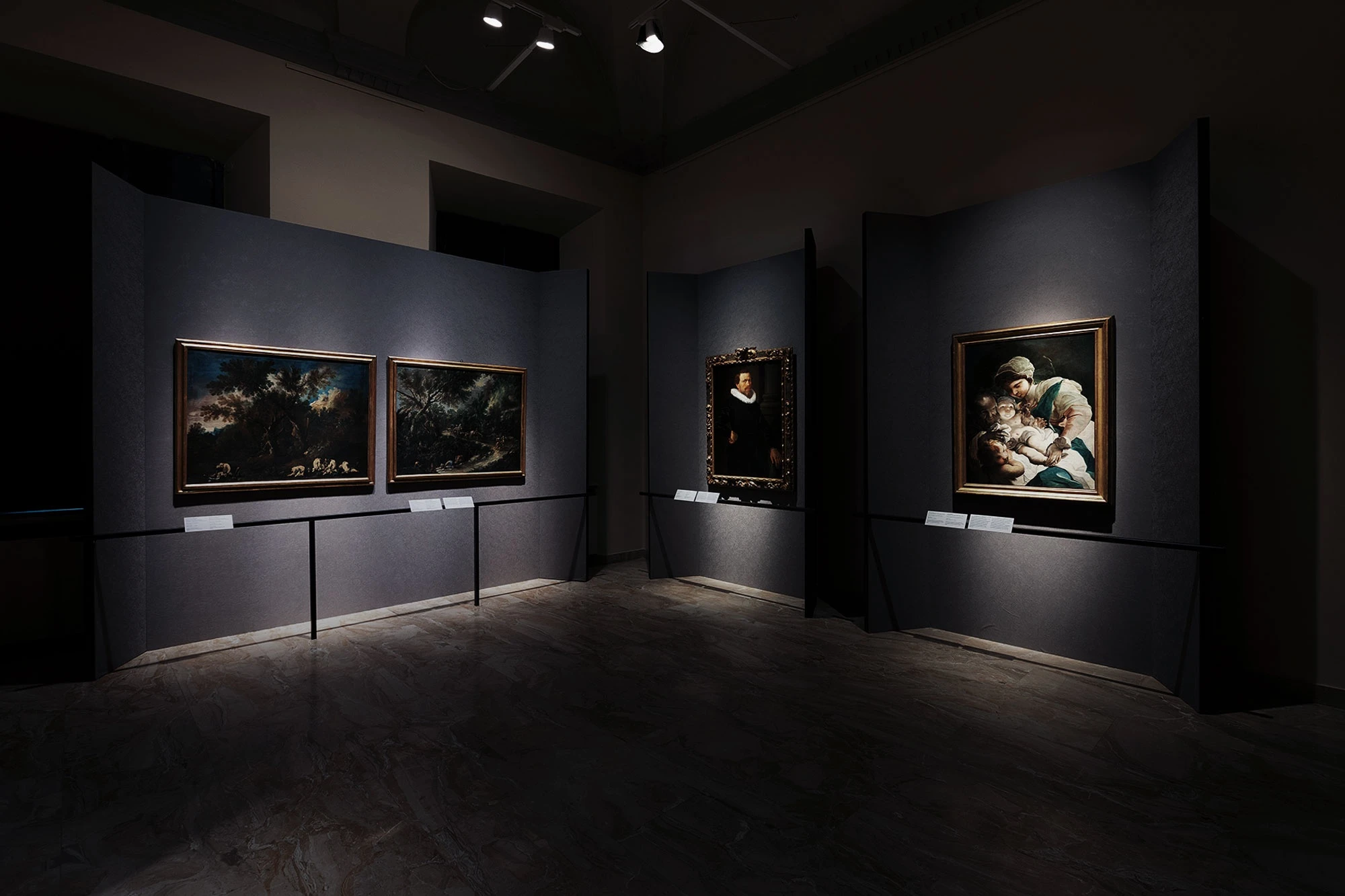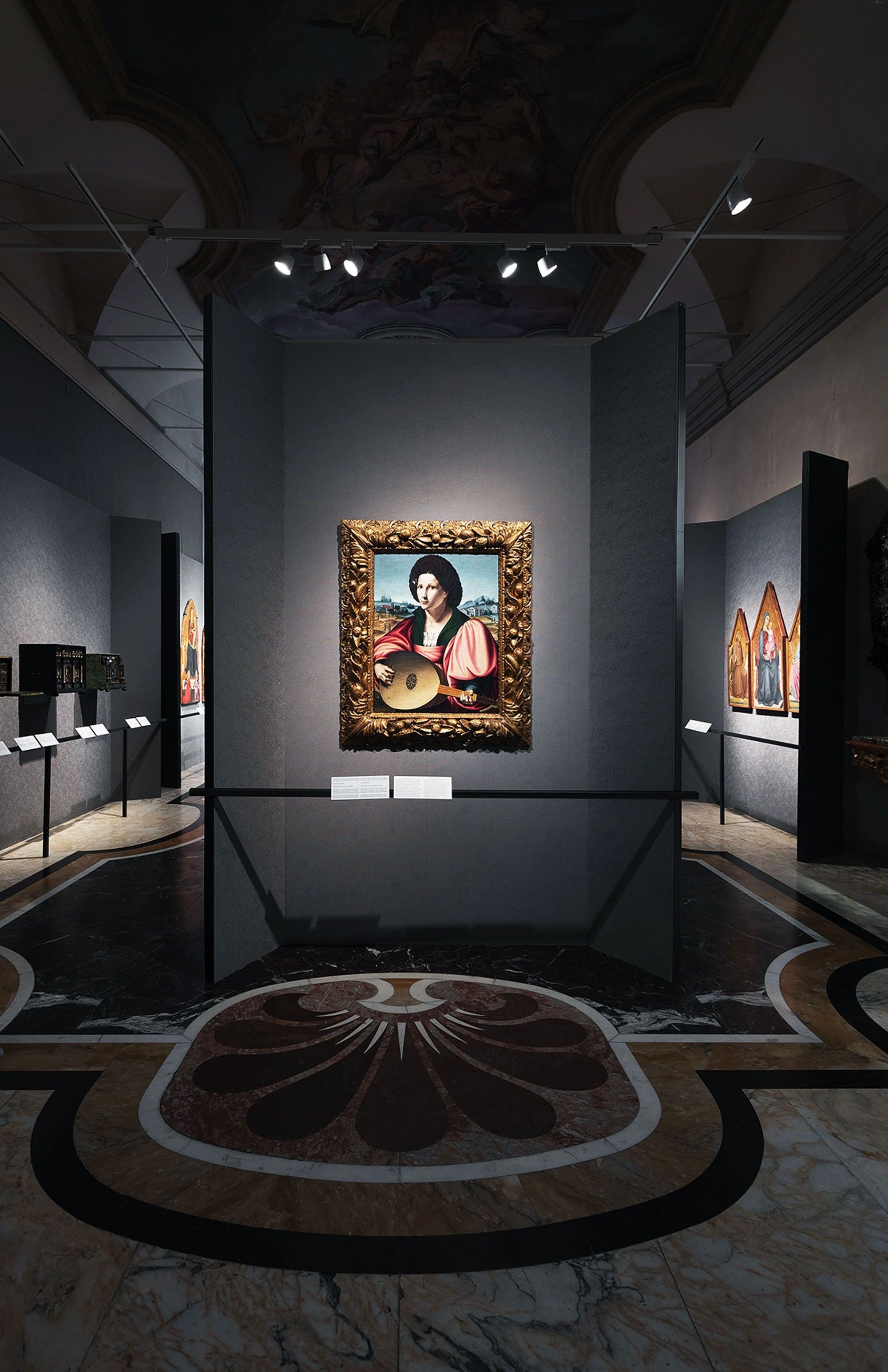 The exhibition fit-out, along with the graphics project, was developed by Lissoni & Partners and presents the works by evoking a domestic dimension, isolating them individually or gathering them together by type into small groups and placing them in niches lined with wallpaper, an element that recalls the house that once belonged to Gian Giacomo Poldi Pezzoli.