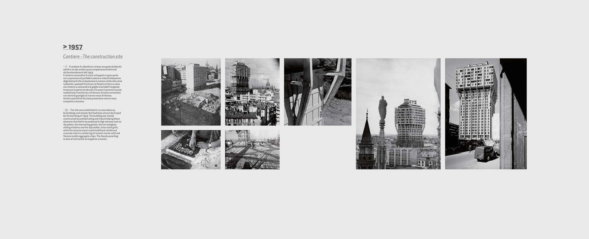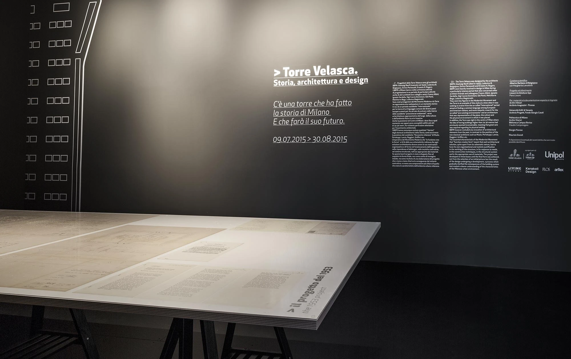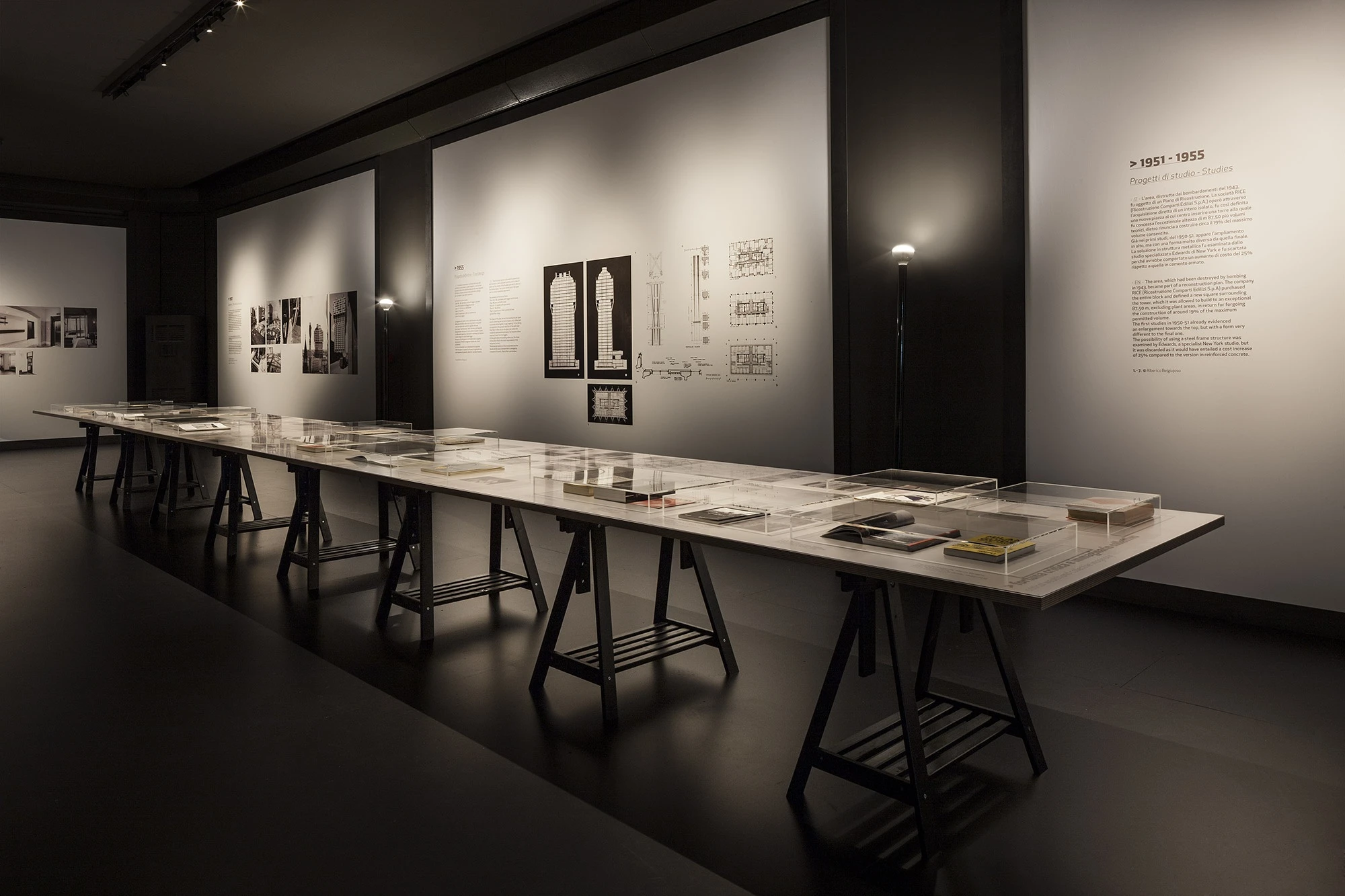 The space fitted out by Piero Lissoni and curated by Alberico Barbiano di Belgiojoso features reproductions of original photographs, drawings and objects which describe the architectural importance of the Torre in relation to the historical context within which the building was conceived.