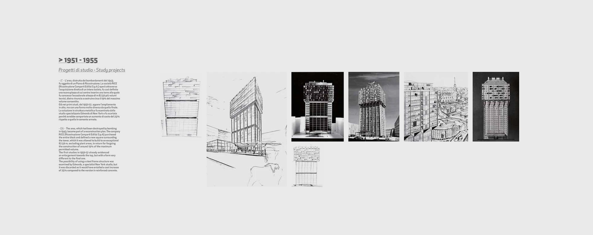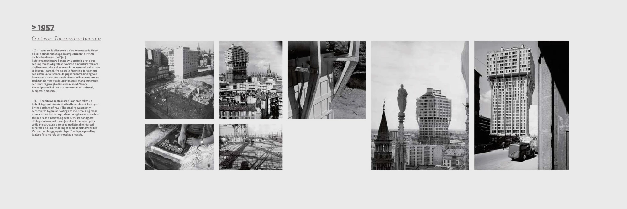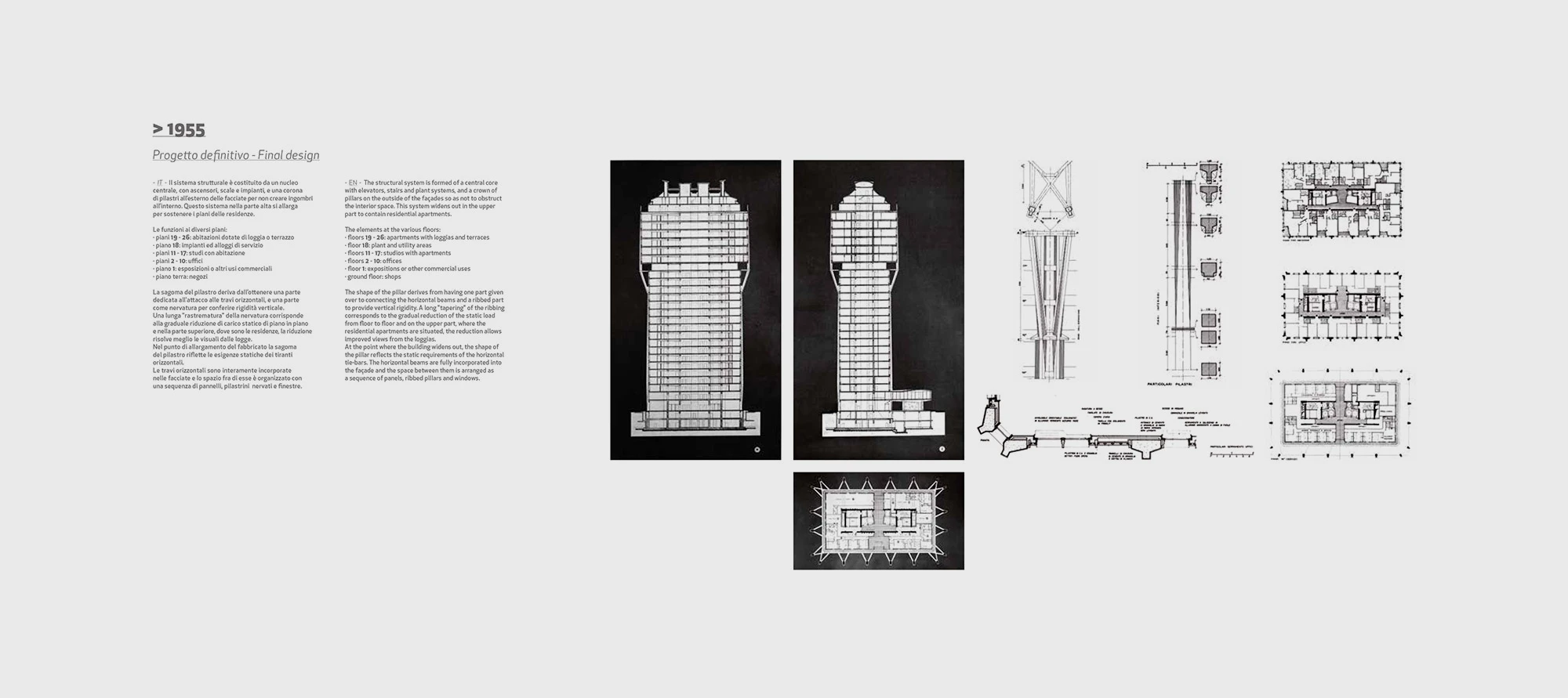 The space fitted out by Piero Lissoni and curated by Alberico Barbiano di Belgiojoso features reproductions of original photographs, drawings and objects which describe the architectural importance of the Torre in relation to the historical context within which the building was conceived.