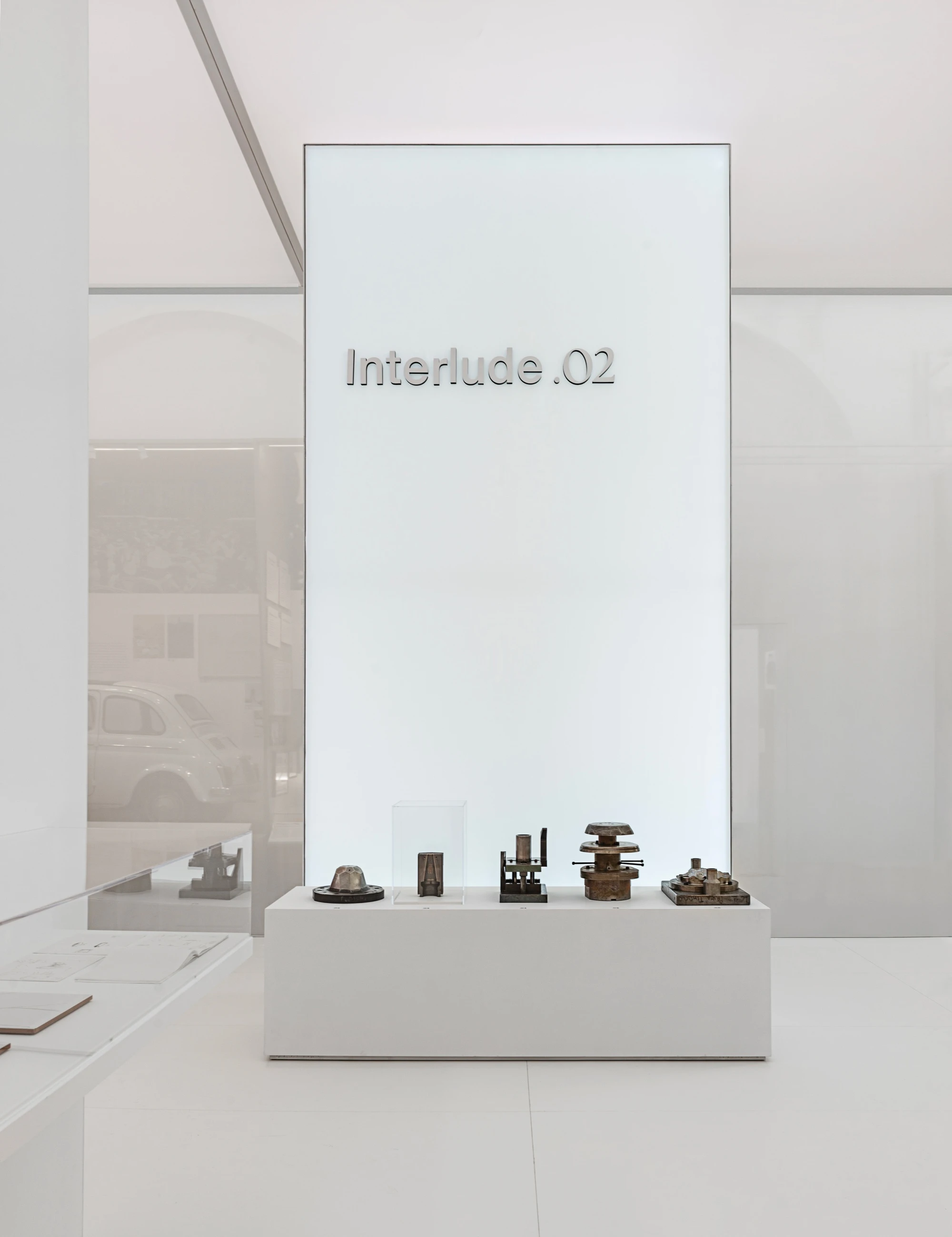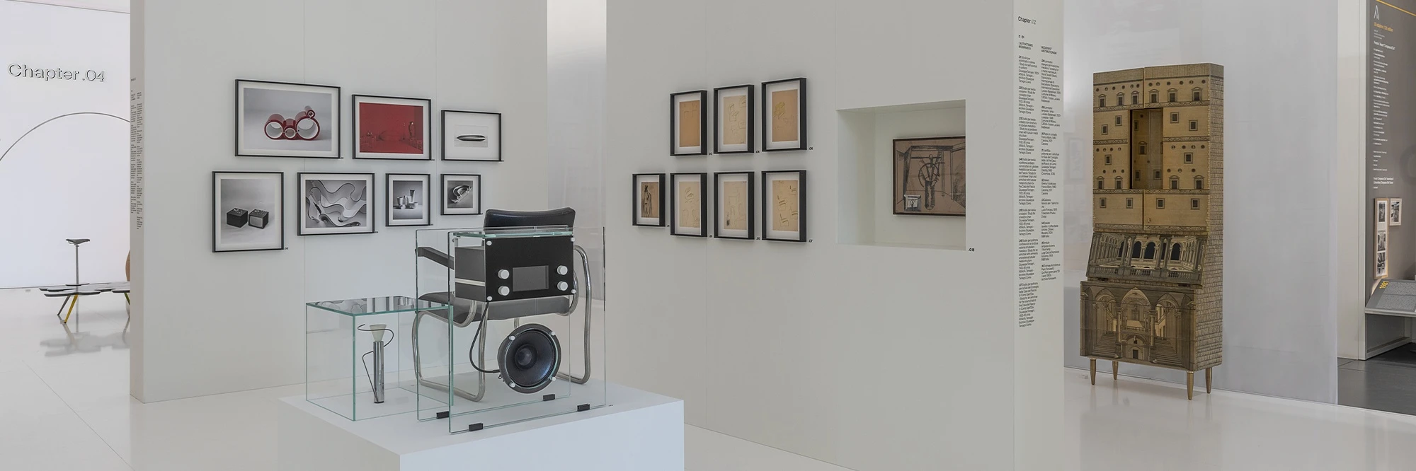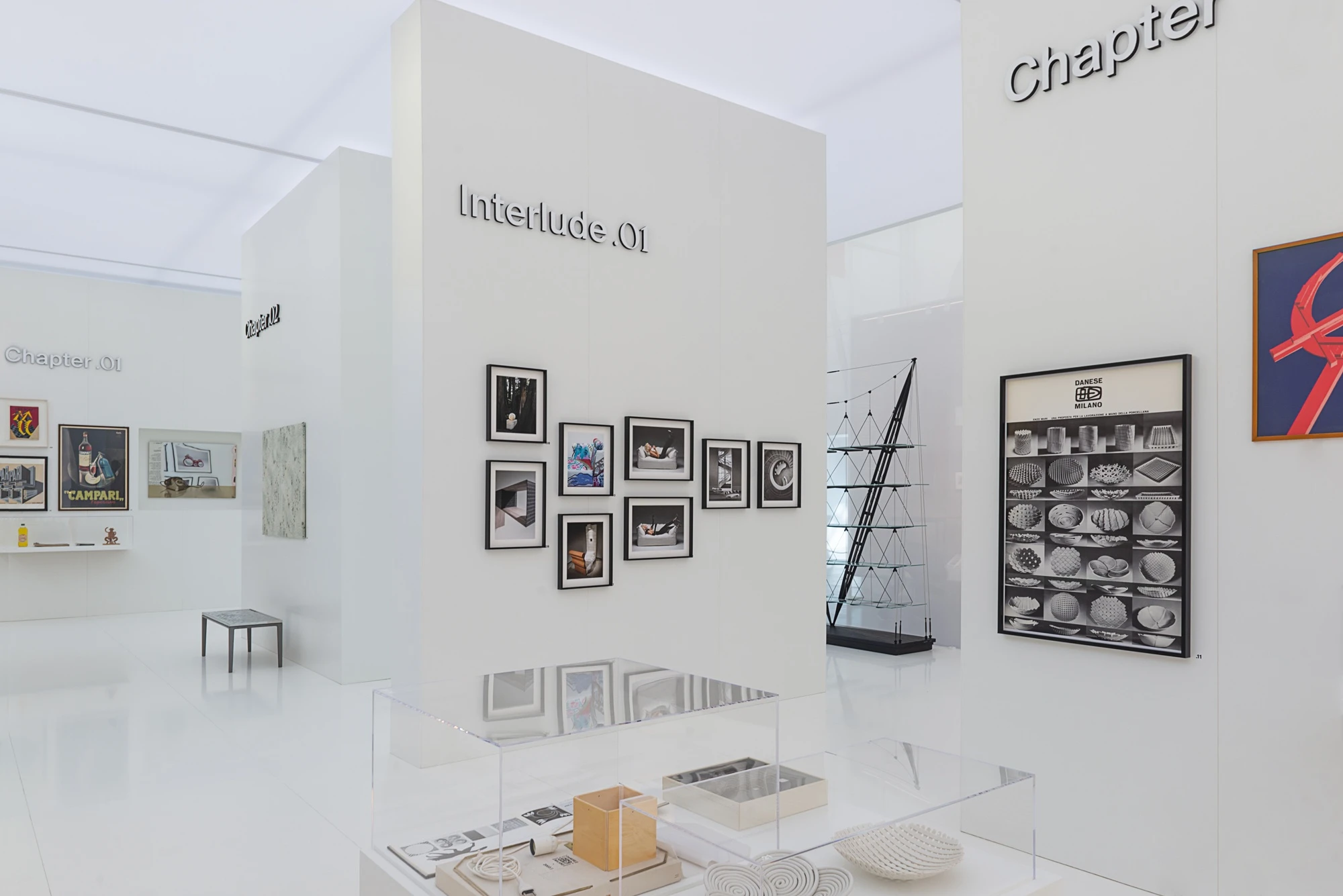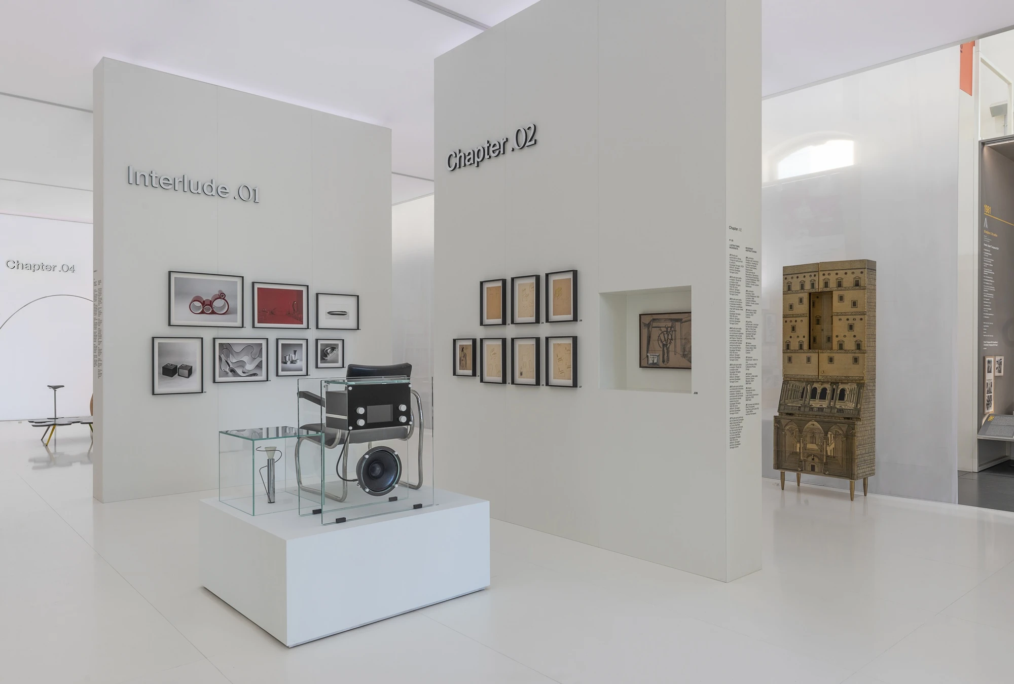 The exhibition design has been conceived as an architecture immersed within the expanse of the museum; a monolithic parallelepiped enveloped by a fine and ethereal white veil. Inside, a series of white partitions, some of which are backlit, subdivide the space into different thematic areas, creating a pathway that guides the visitor in their exploration.