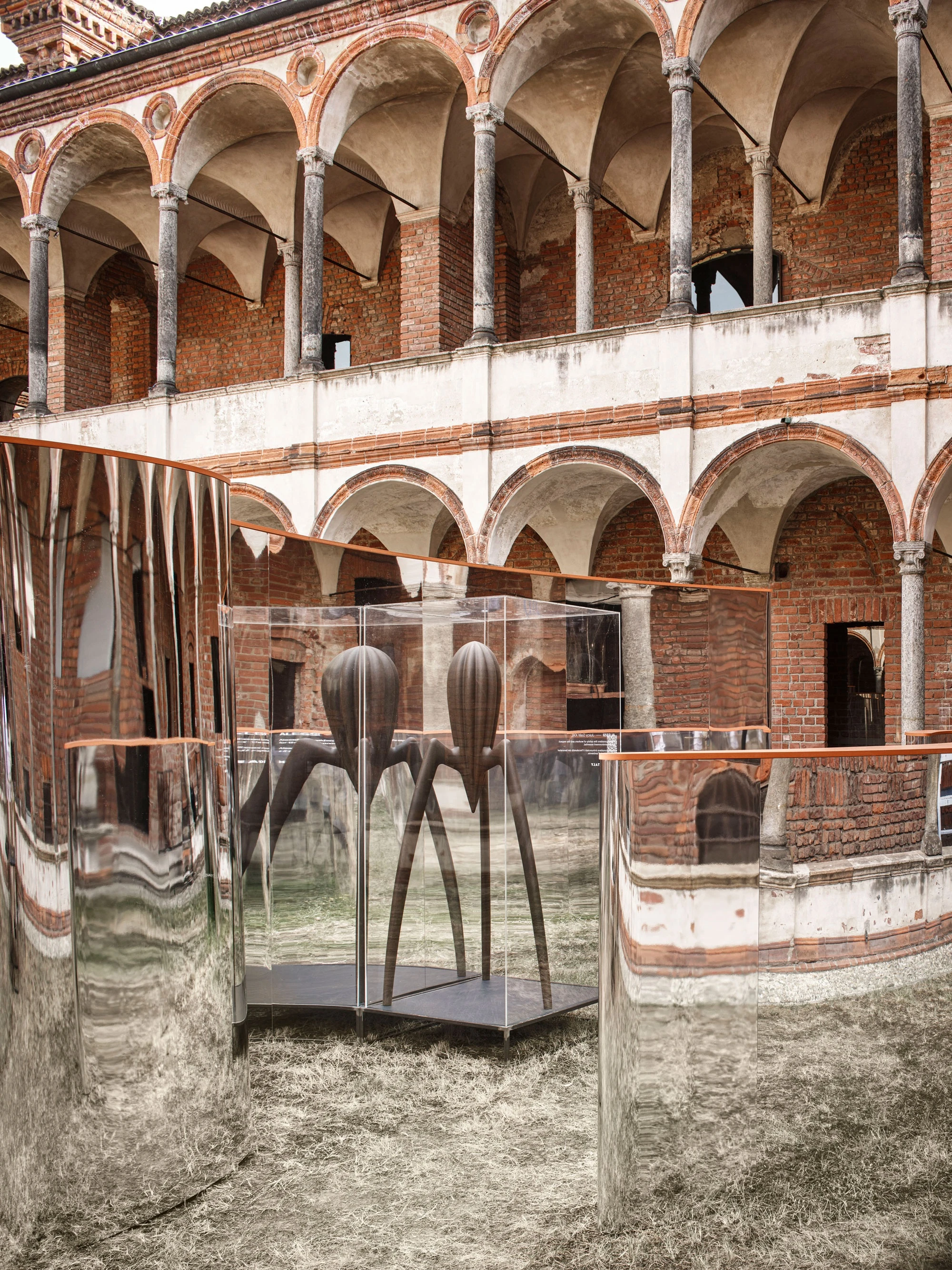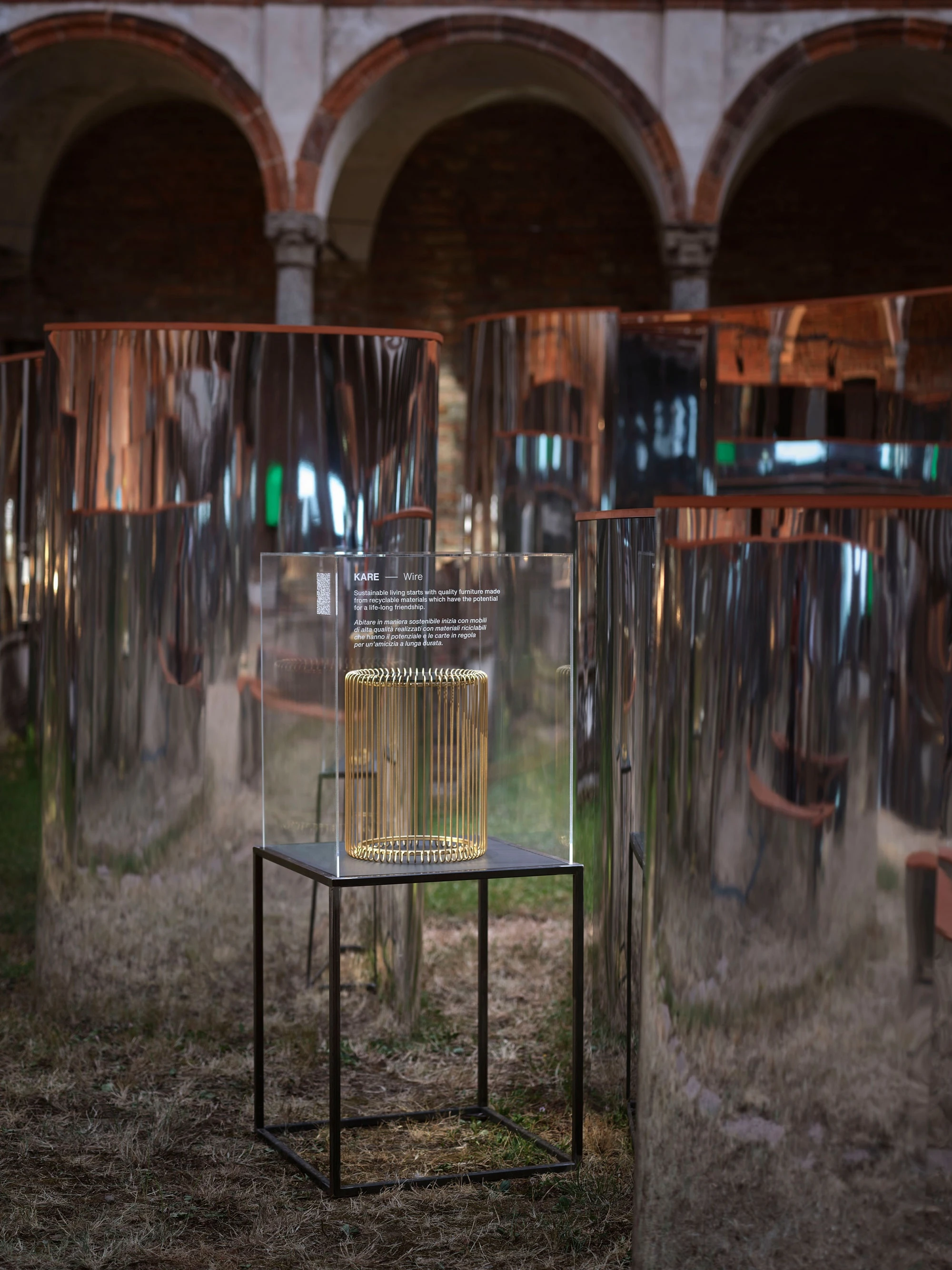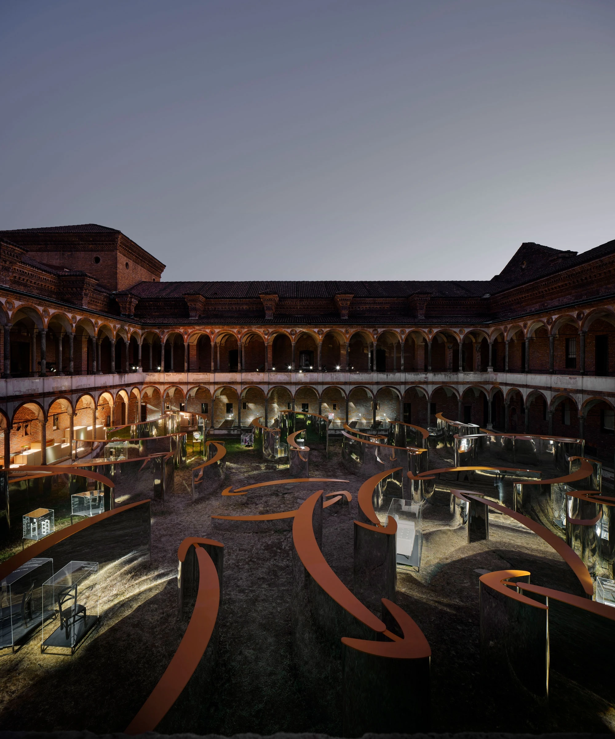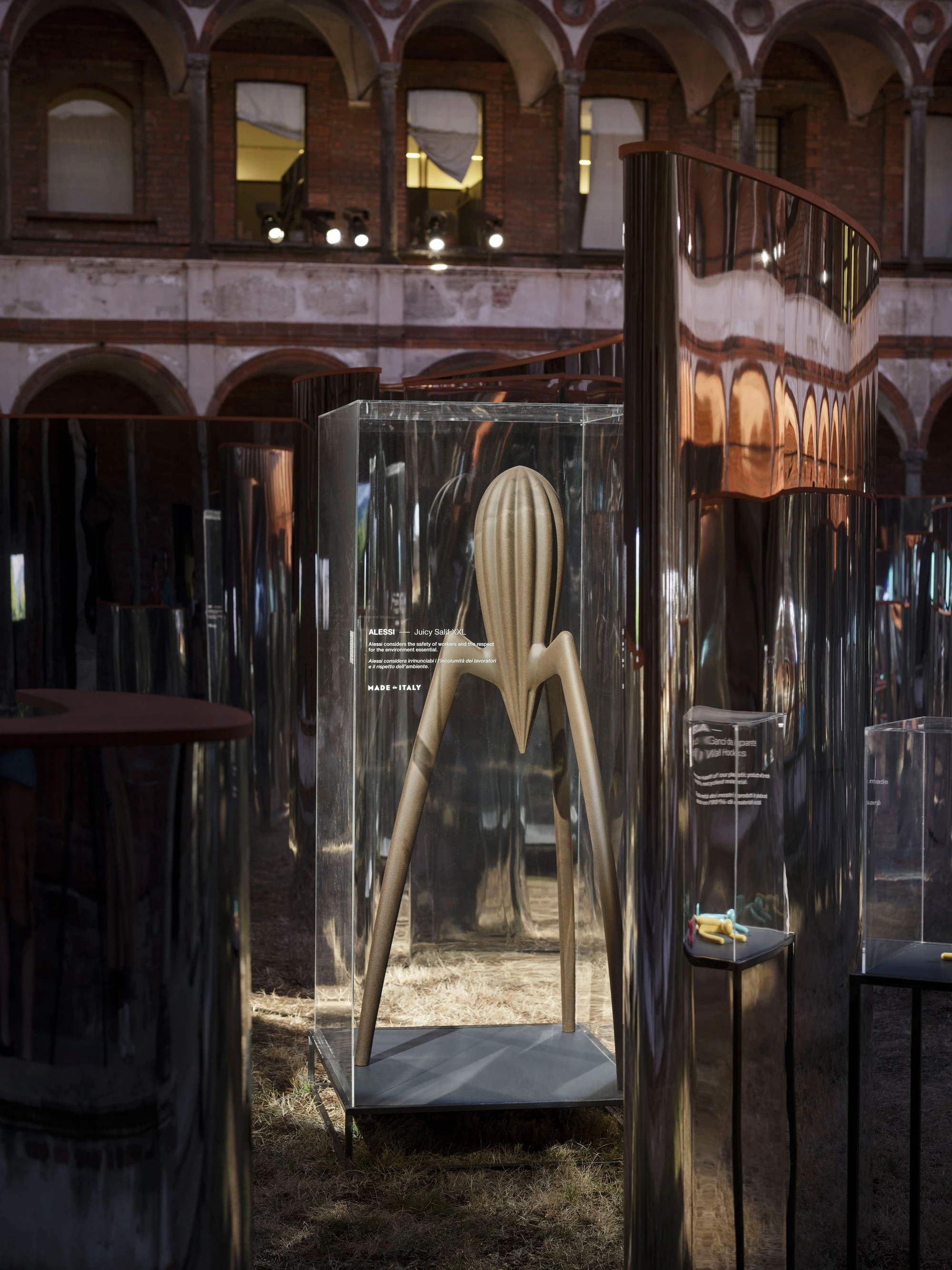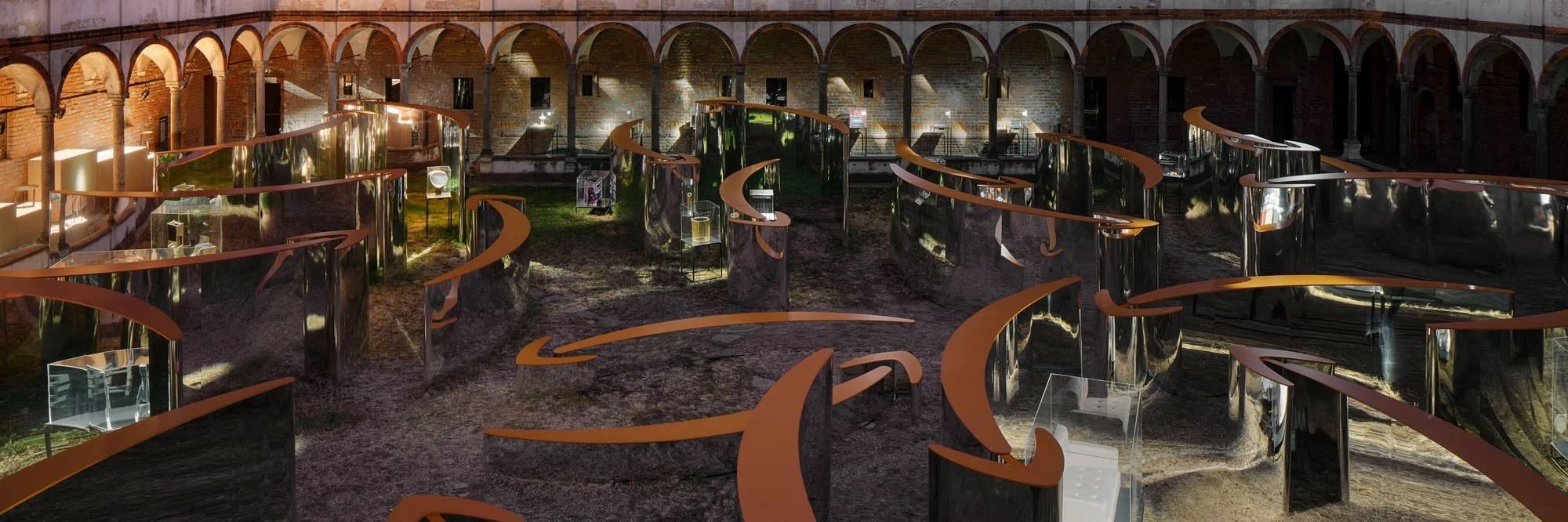 Drawing inspiration from Italian garden mazes, the project consists of curved walls shaped like an arrow and covered in mirrored aluminium, laid out inside the area of the Cortile della Farmacia. Made in four different heights, these mirror walls reinterpret the company’s Smile but also recall Piet Mondrian’s abstract trees, thus hinting at the values of the environmental commitment established by Amazon with the Climate Pledge, co-founded with Global Optimism in 2019 and now shared by more than 200 companies, whose objective is to reach zero carbon emissions by 2040, 10 years before the Paris Agreement. Along the pathways and under the portico, a selection of products available from Amazon.it, such as home furniture and accessories, are presented as if they were statues, each mounted on a pedestal.