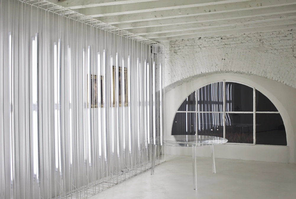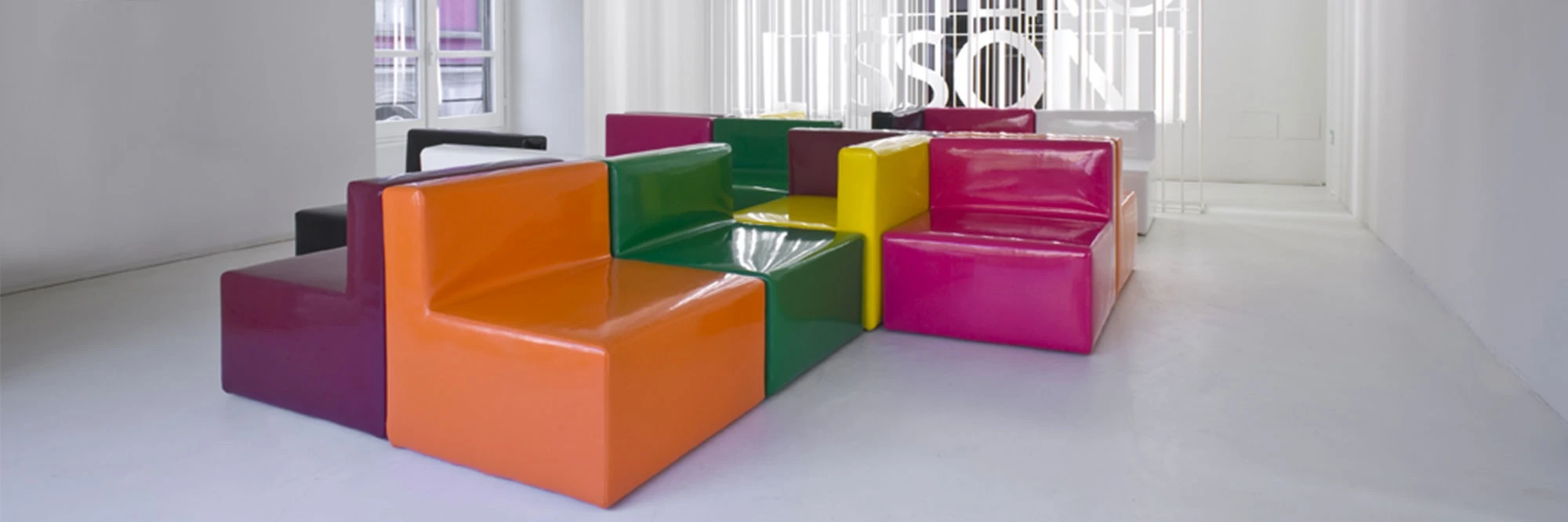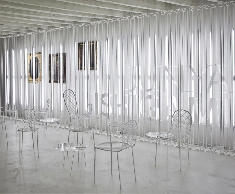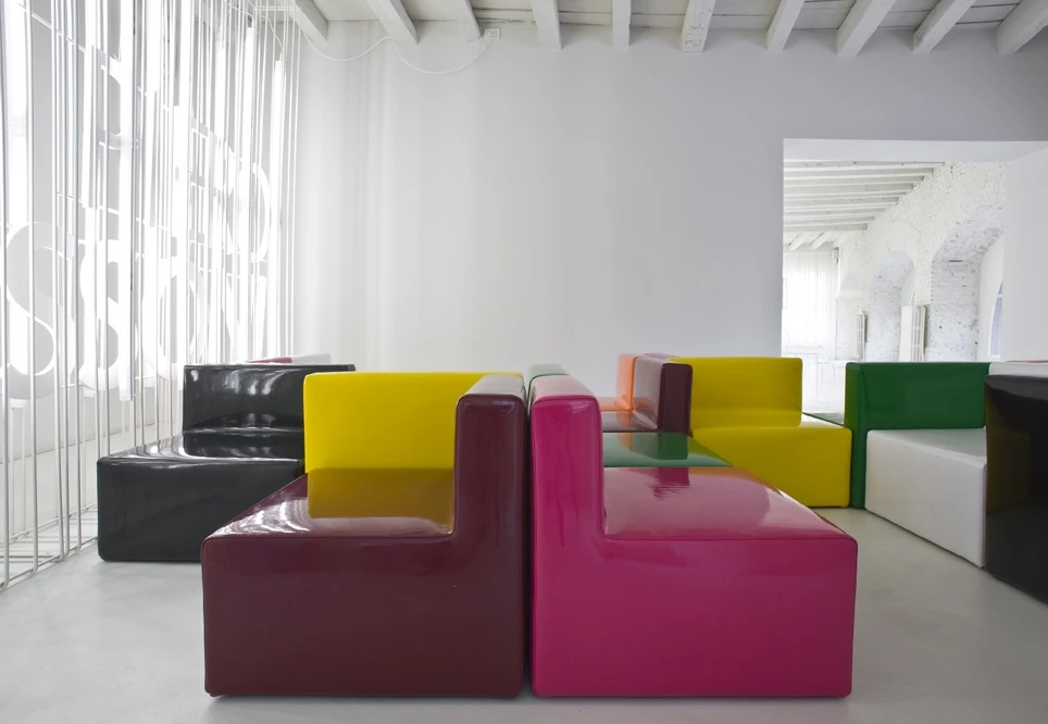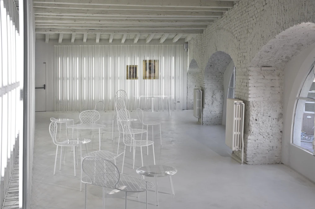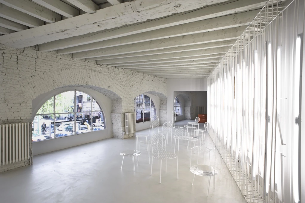 In a setting that plays on contrast, Piero Lissoni's soft and brightly coloured Cabrio chair collection is placed in direct comparison with the non-colour, transparency and fluidity of the Family Chair and Drop table by Junya Ishigami.