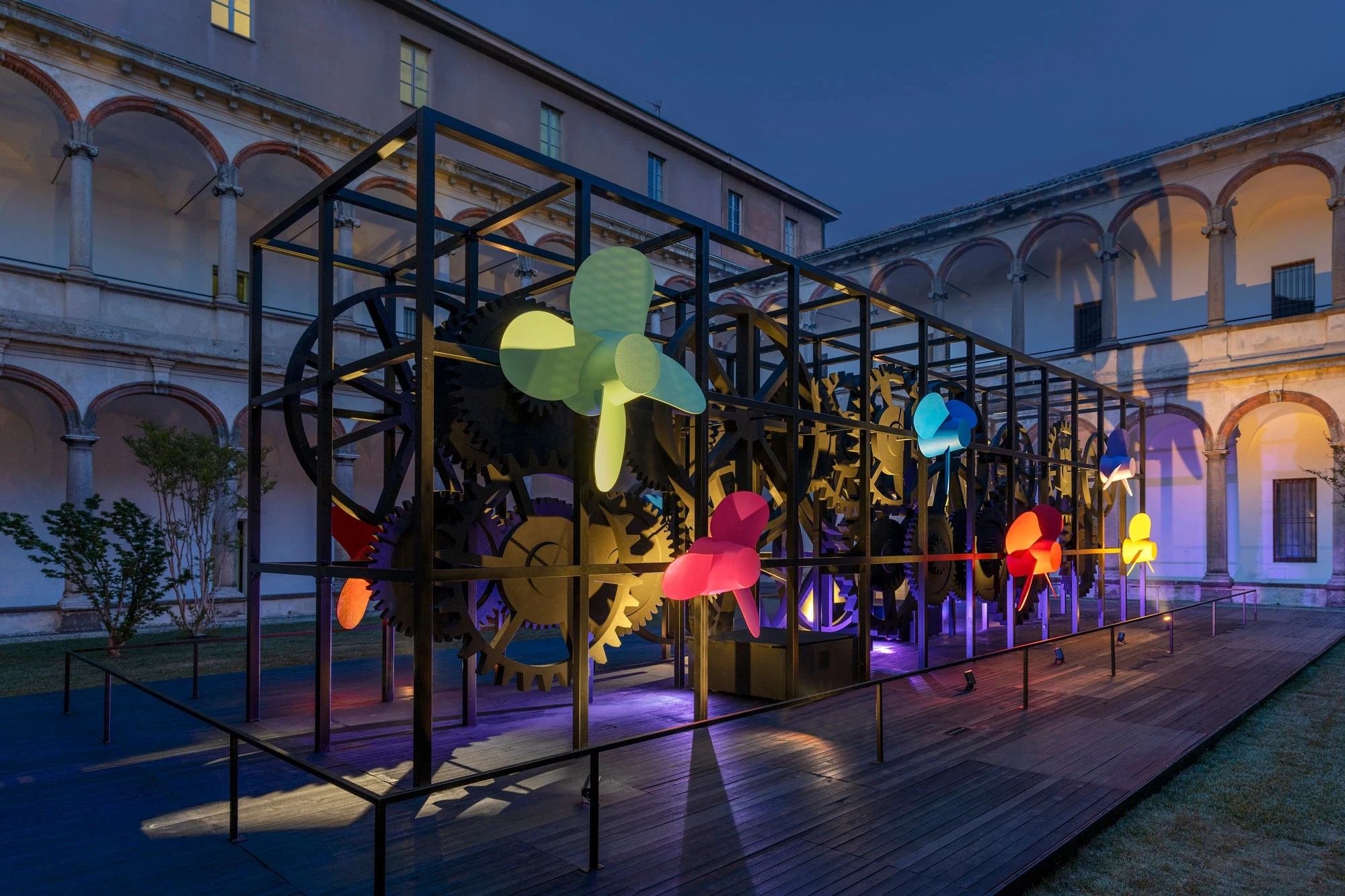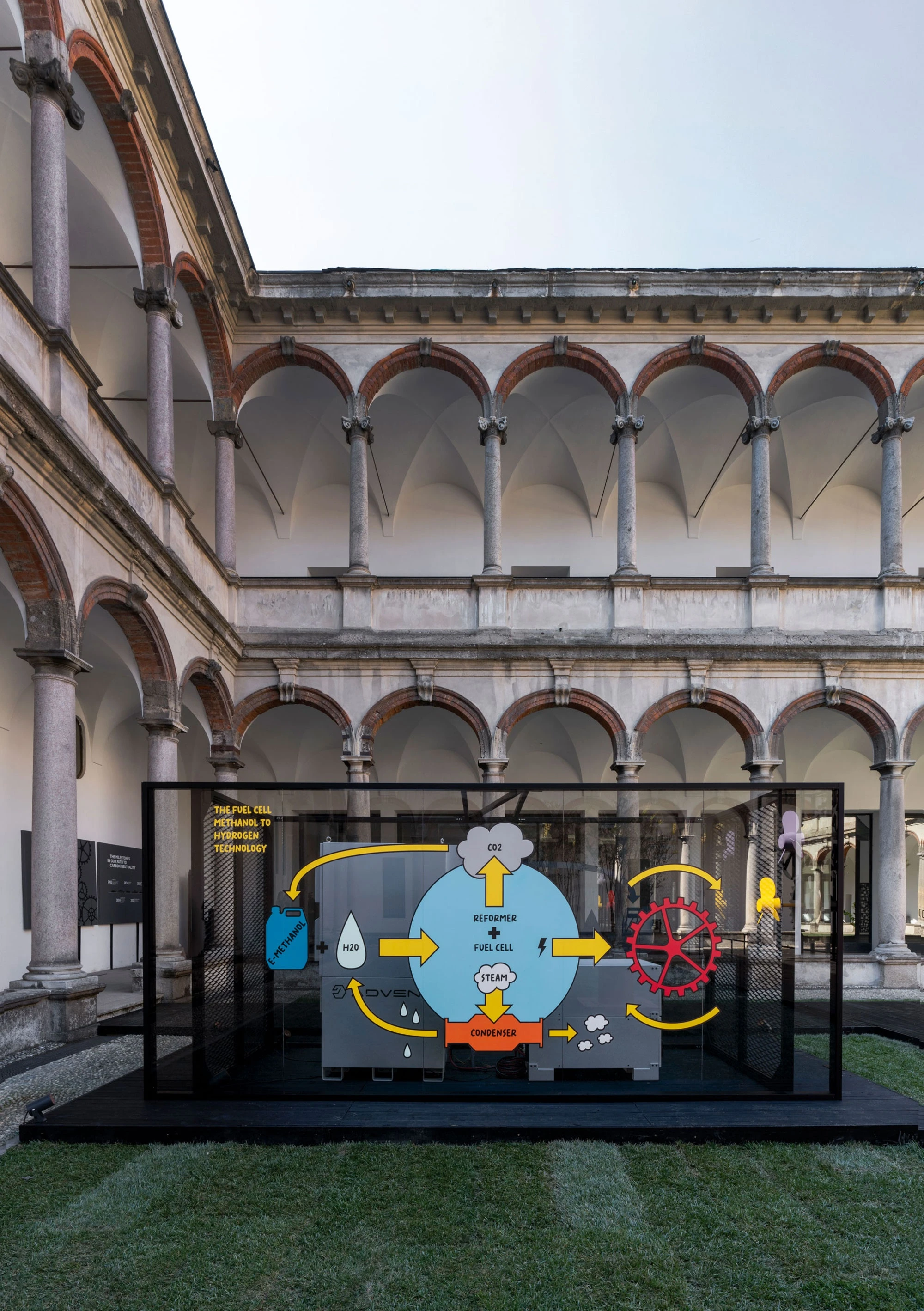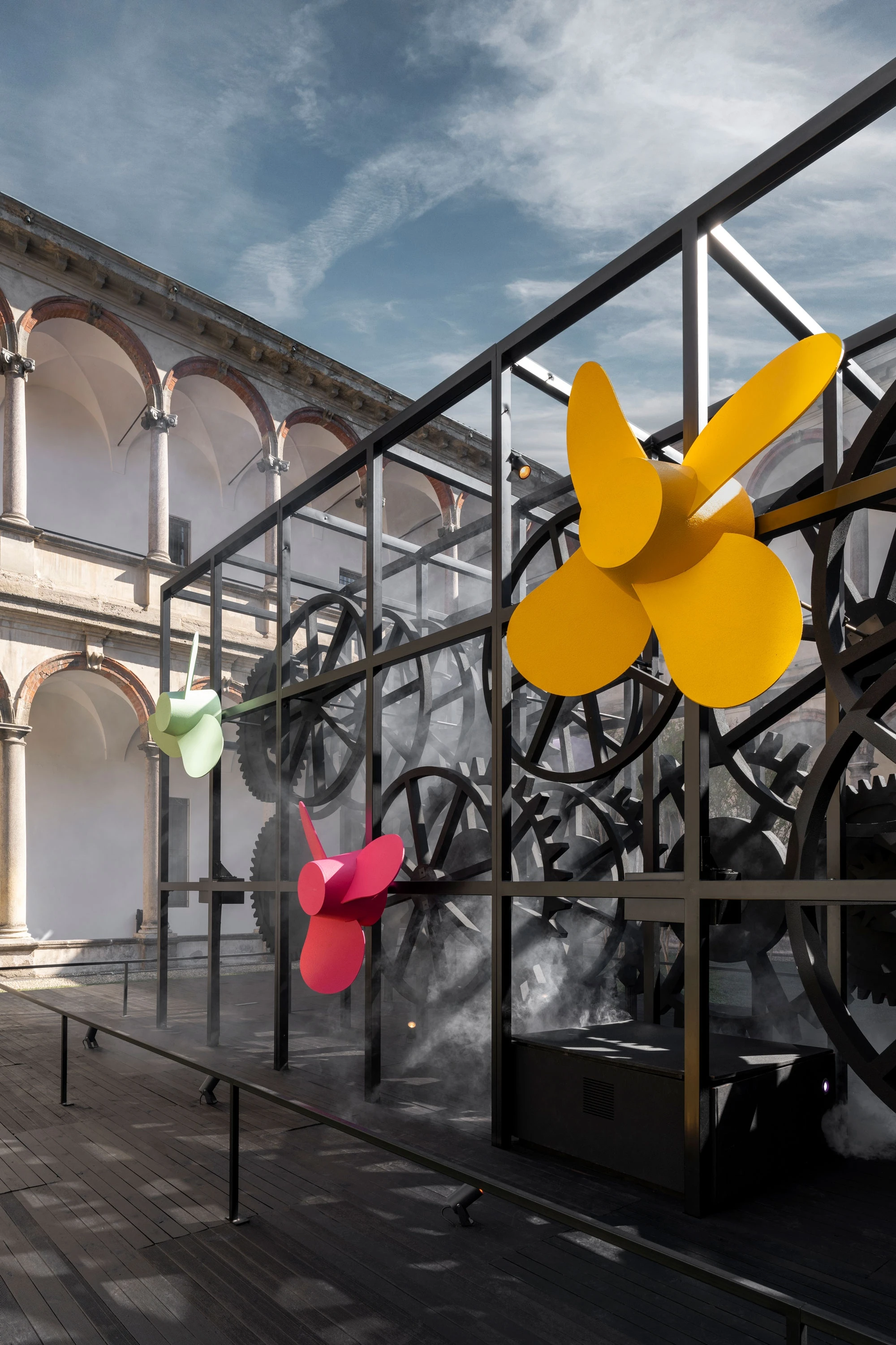 La Macchina Impossibile is an imposing metal sculpture: a complex machine that brings together sophisticated technology and highly skilled manual detailing, just as in yacht building. Positioned in the centre of the 18th-century Courtyard, the entire structure rests on a platform, so highlighting the mechanism of cogs and propellers. Powering their movement is hydrogen generated by a new green methanol system that Sanlorenzo is developing for the propulsion of its boats in collaboration with Siemens Energy.
