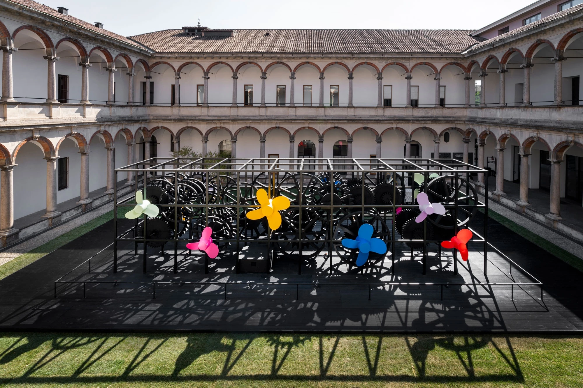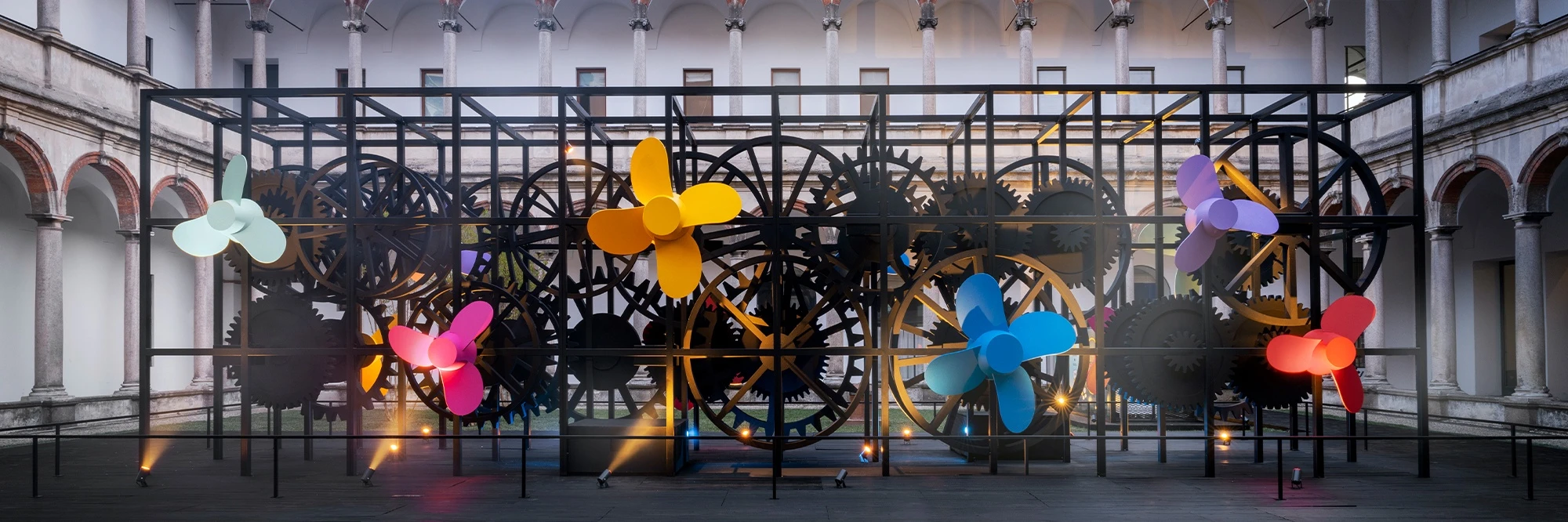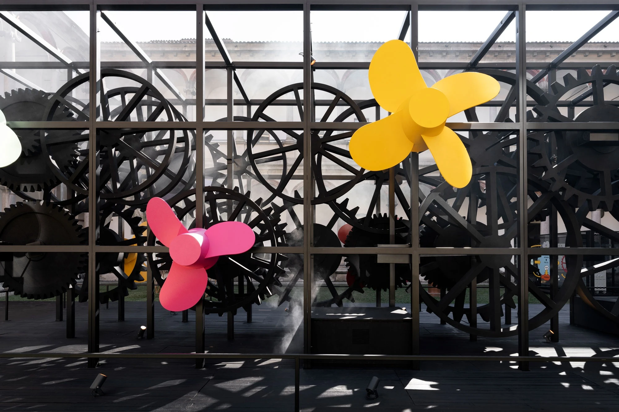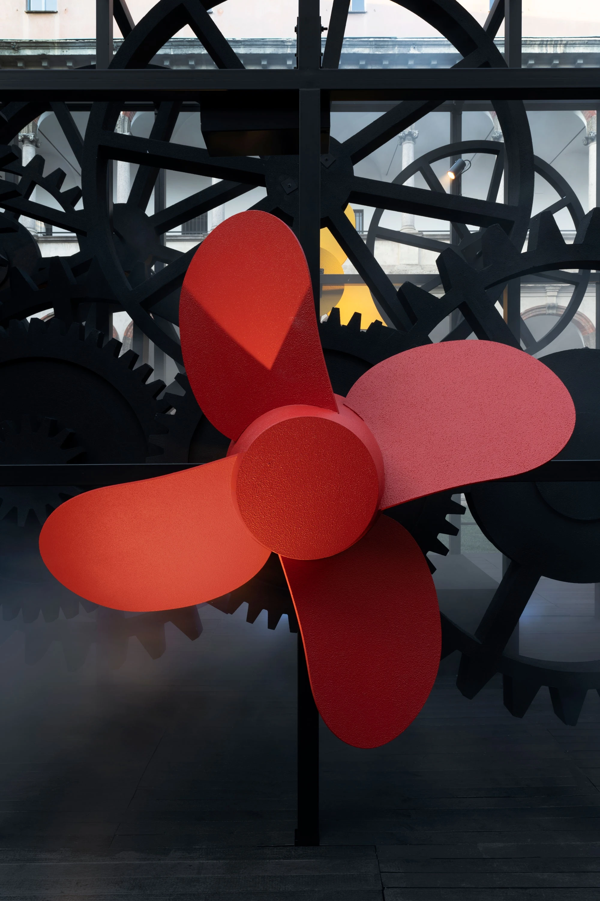 La Macchina Impossibile is an imposing metal sculpture: a complex machine that brings together sophisticated technology and highly skilled manual detailing, just as in yacht building. Positioned in the centre of the 18th-century Courtyard, the entire structure rests on a platform, so highlighting the mechanism of cogs and propellers. Powering their movement is hydrogen generated by a new green methanol system that Sanlorenzo is developing for the propulsion of its boats in collaboration with Siemens Energy.