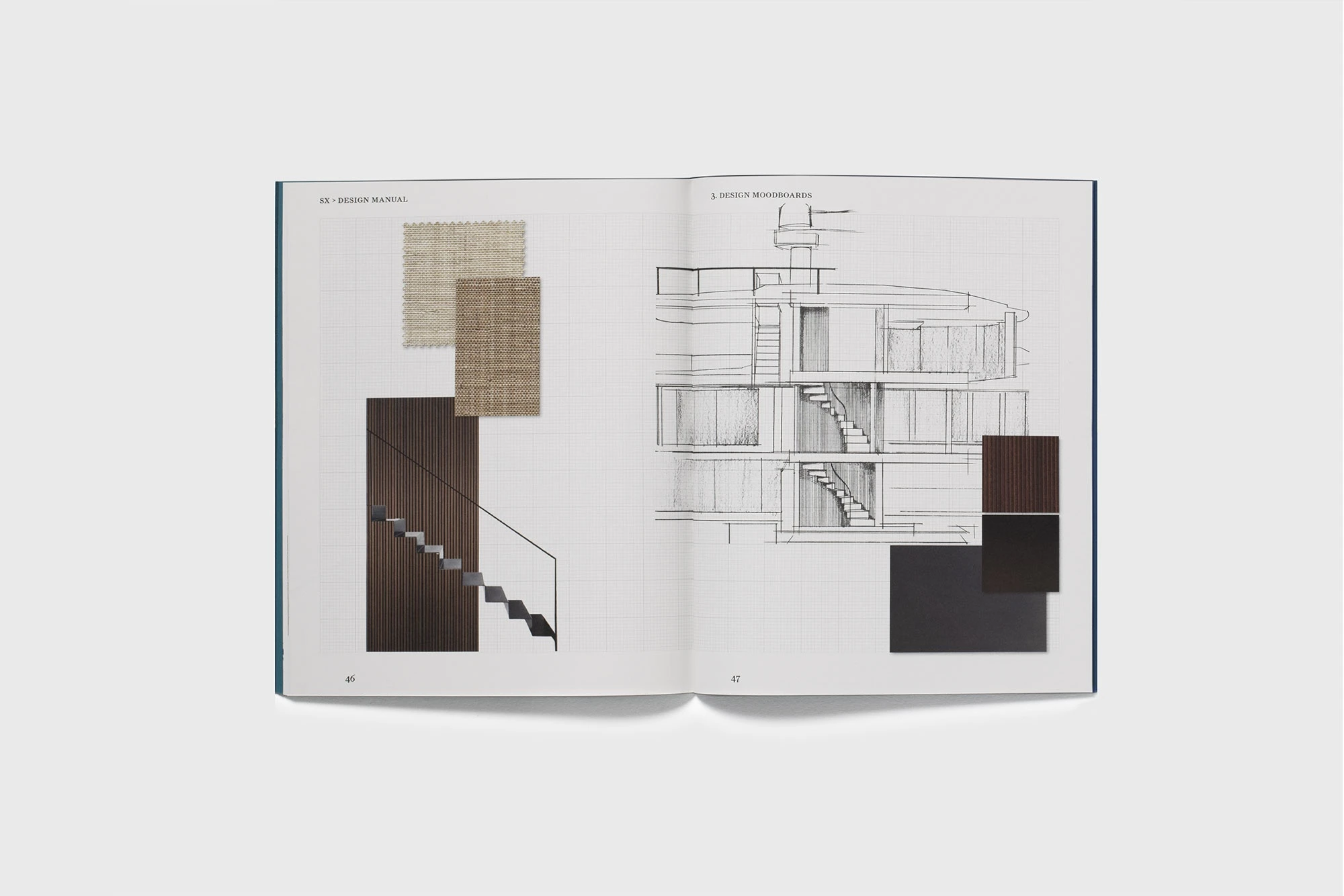 “Manual” on the other hand, explores the SX project through sketches, material moodboards and technical drawings.