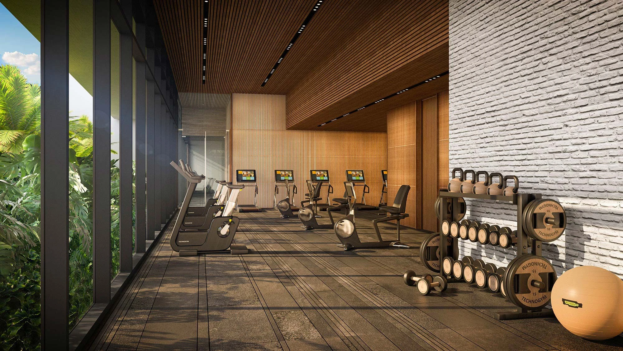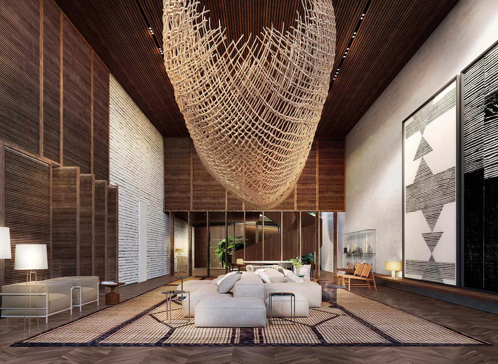 The public areas of the residential tower find inspiration in the forms and styles of Brazilian modernism reinterpreted in a contemporary key and related through the careful use of colours and materials, such as local woods and stones, which accentuate the sophisticated atmospheres. In a continuous interplay between European and local influences, objects and furnishings of contemporary design mix harmoniously with Brazilian vintage and form the backdrop to antiques, works of art by emerging artists and traditional pieces.