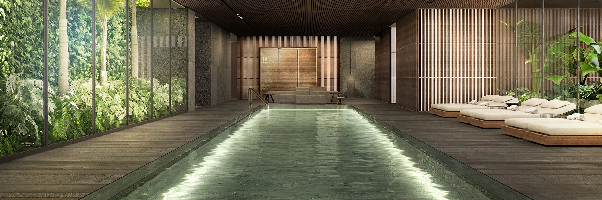 The constant presence of vegetation and the light modulated by wooden screens are distinctive elements of the rarefied and evocative atmospheres of the interiors. The project includes the entrance lobby, a large library and lounge overlooked by a sculpture made of woven wood, a gym with a Pilates area and indoor pool in dark stone, a Spa containing a sauna, steam room and ice pool, and a beauty salon for residents. The guest experience is completed outside with a secret garden for outdoor activities and tennis courts. The coordinated identity, from naming to graphics, was conceived by Lissoni Graphx to lend the project further coherence and uniformity.