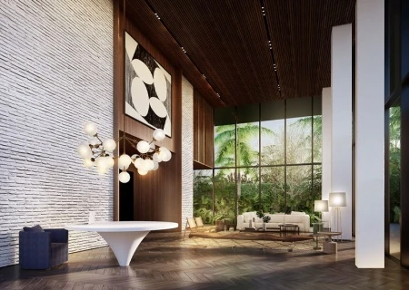 The public areas of the residential tower find inspiration in the forms and styles of Brazilian modernism reinterpreted in a contemporary key and related through the careful use of colours and materials, such as local woods and stones, which accentuate the sophisticated atmospheres. In a continuous interplay between European and local influences, objects and furnishings of contemporary design mix harmoniously with Brazilian vintage and form the backdrop to antiques, works of art by emerging artists and traditional pieces.