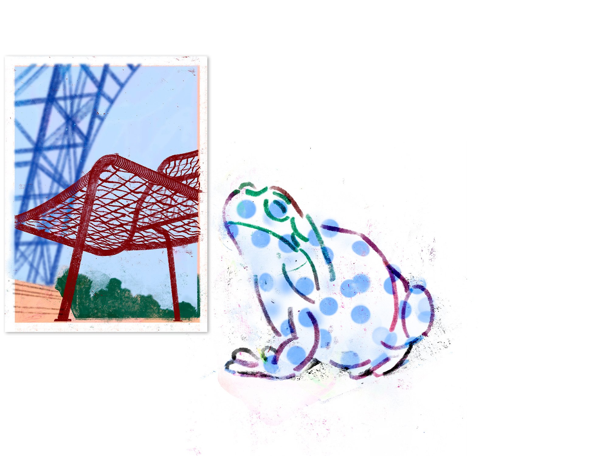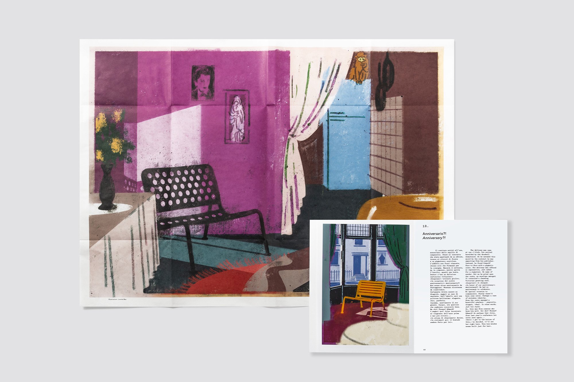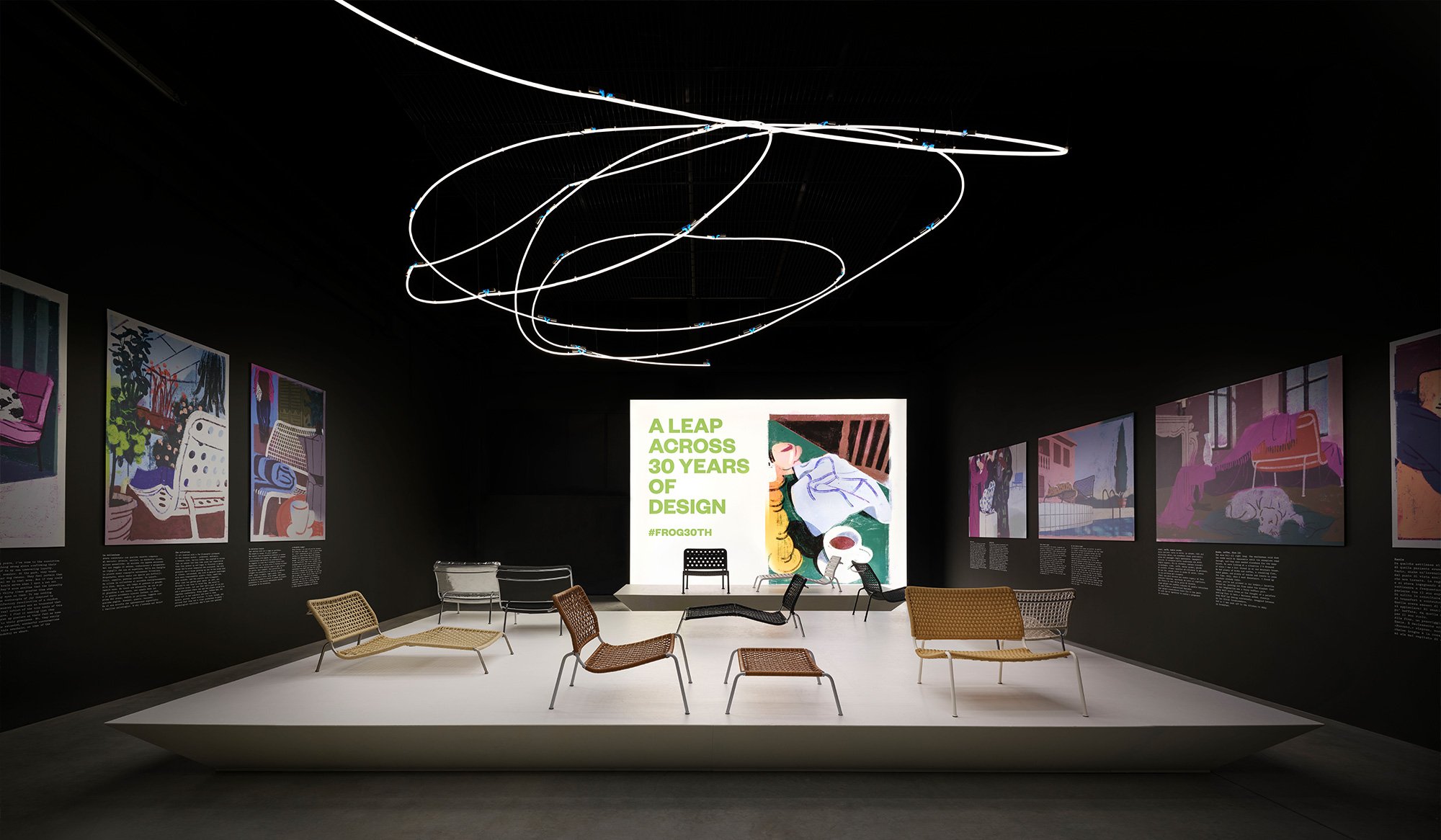 The same illustrations also became the inspiration for the exhibition at the Living Divani headquarters in Anzano del Parco. Printed in large format, the pictures accompanied the different variants of the Frog chair, from experimental prototypes to versions still in production, recounting its evolution over time.