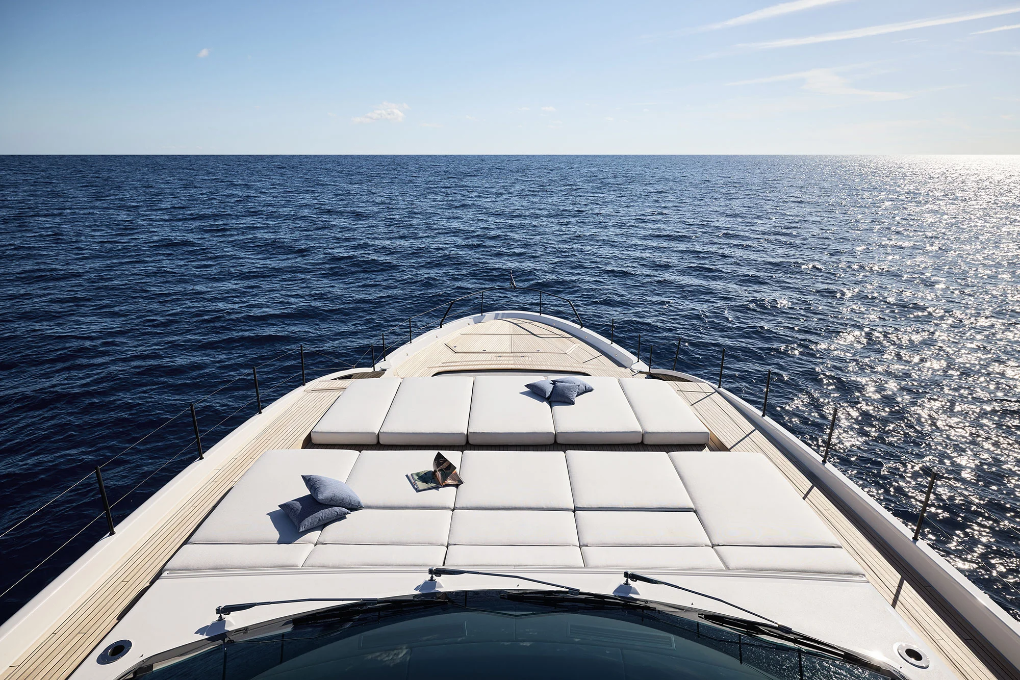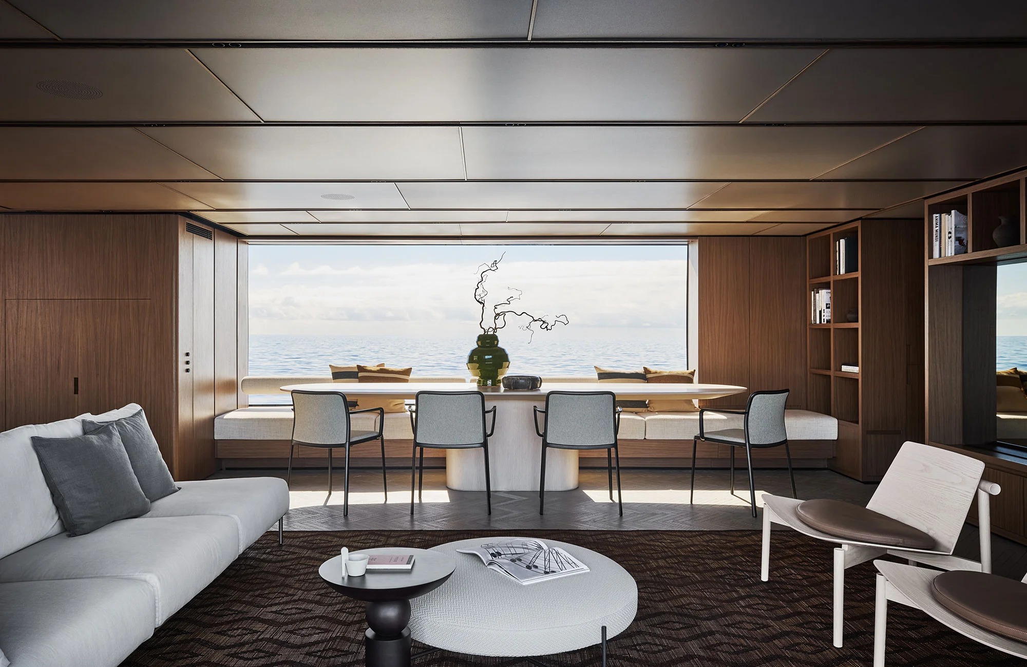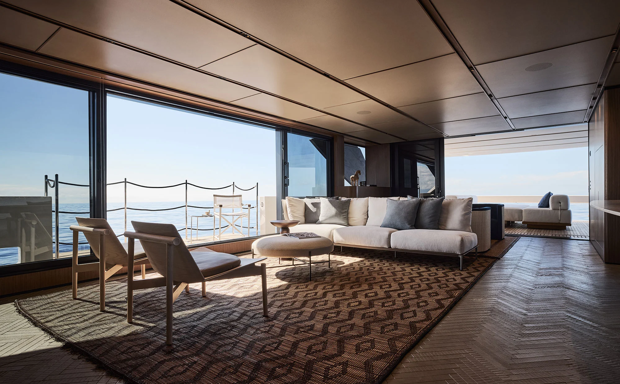 The SL110A is the new model with an asymmetric line, for which we designed the interiors and collaborated on the new prow. The architecture is conceived as a natural extension of the outside, thanks to the large openings that provide continuity between the spaces.