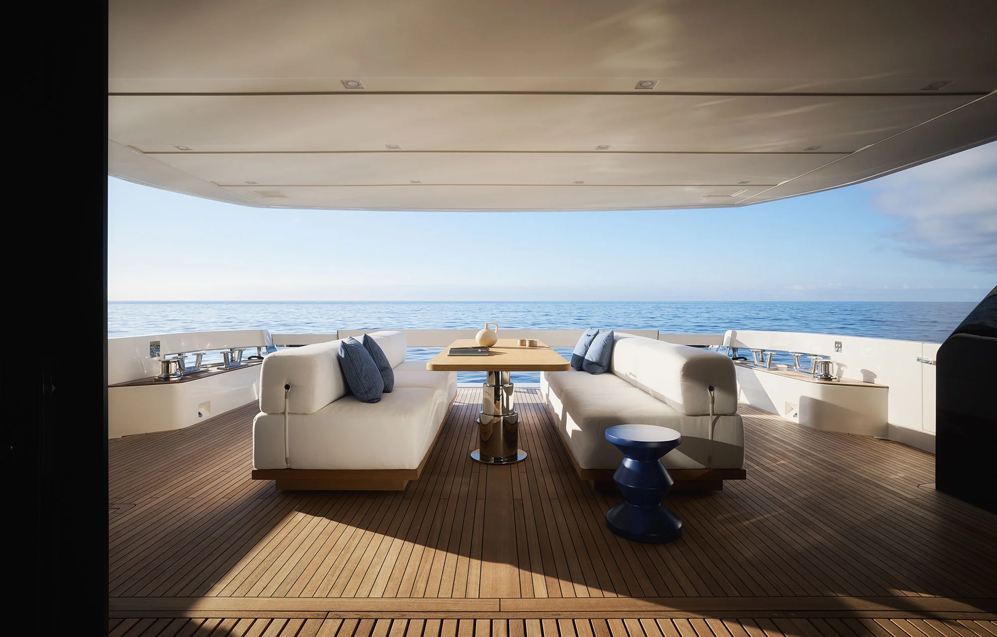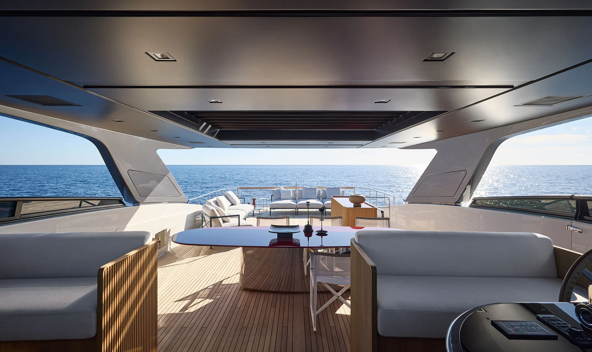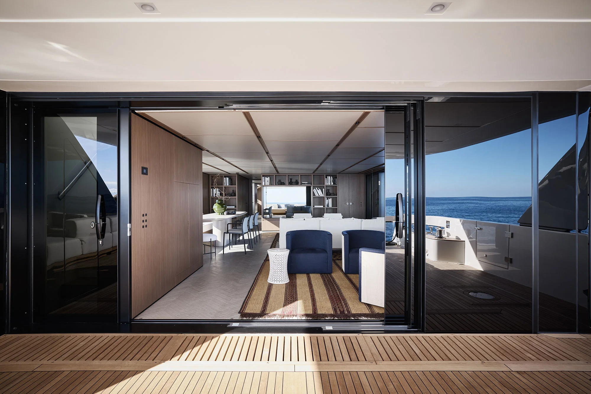 The salon with dining and bar area is placed at the stern and is directly connected to the outside lounge.