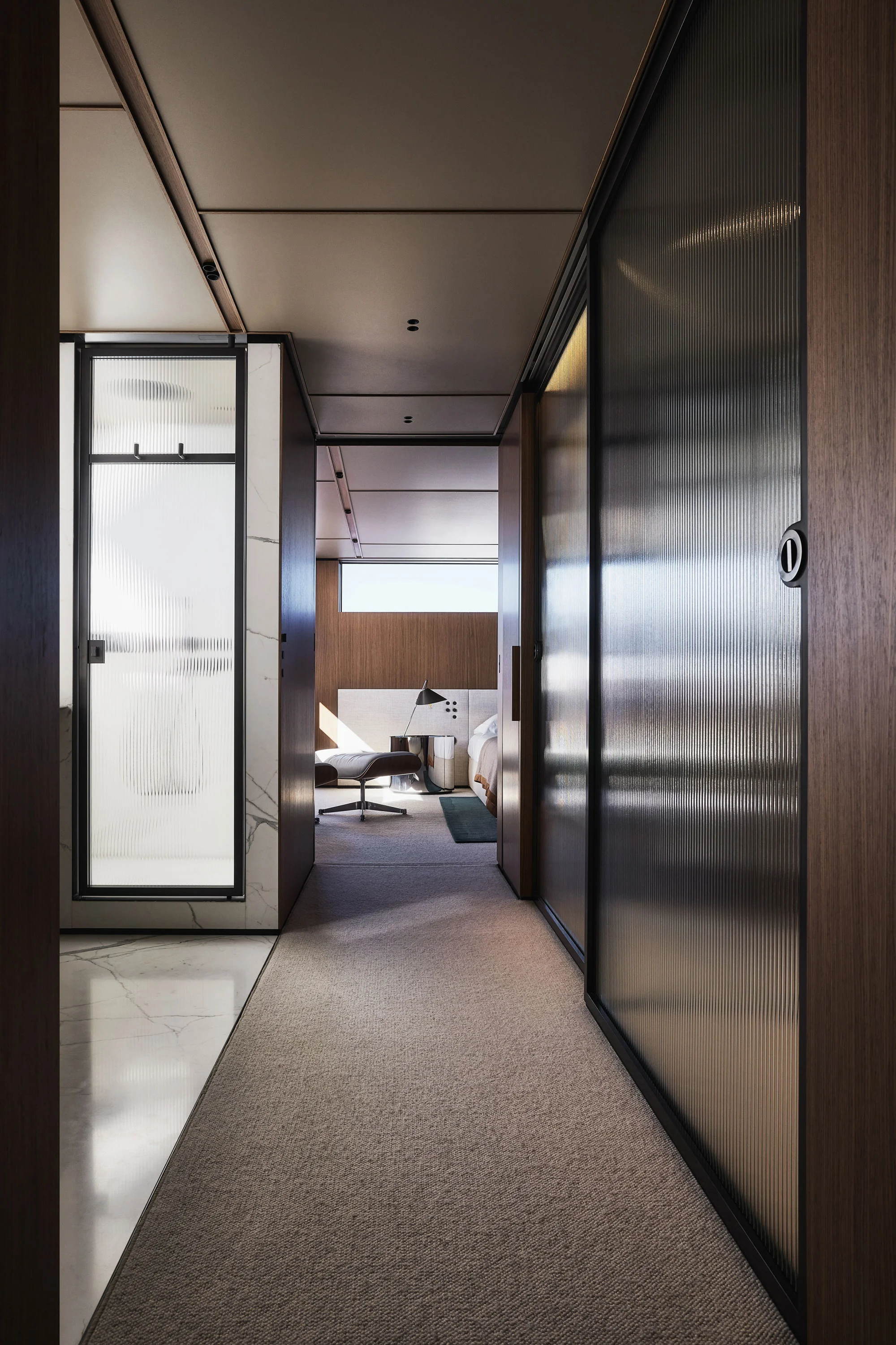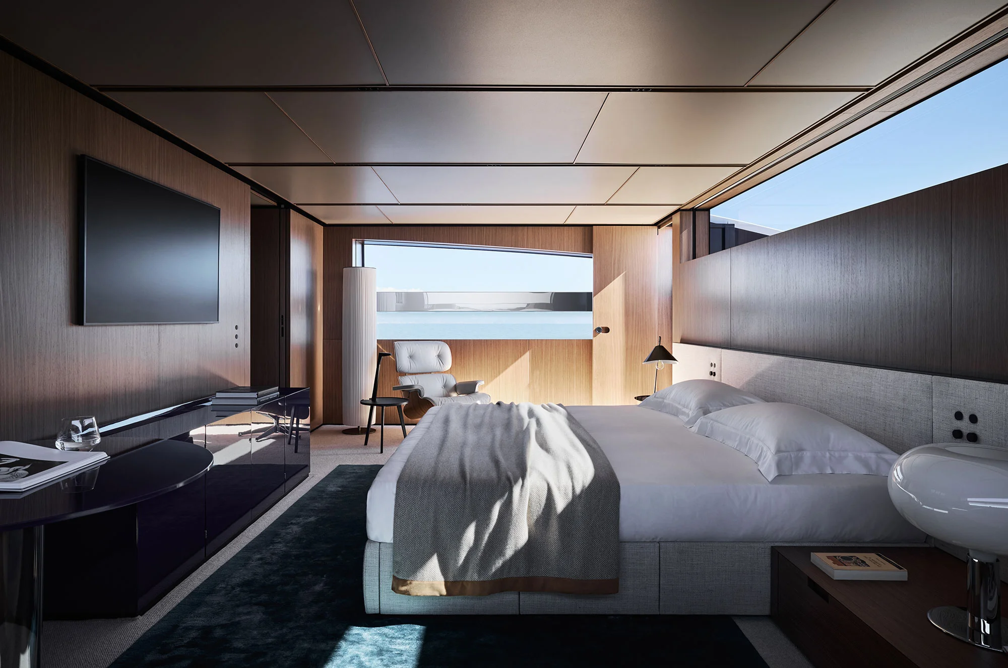 The owner’s suite, situated on the main deck, is marked out by its generous size and a panoramic view of the sea, in addition to having private access to the pool situated at the prow.