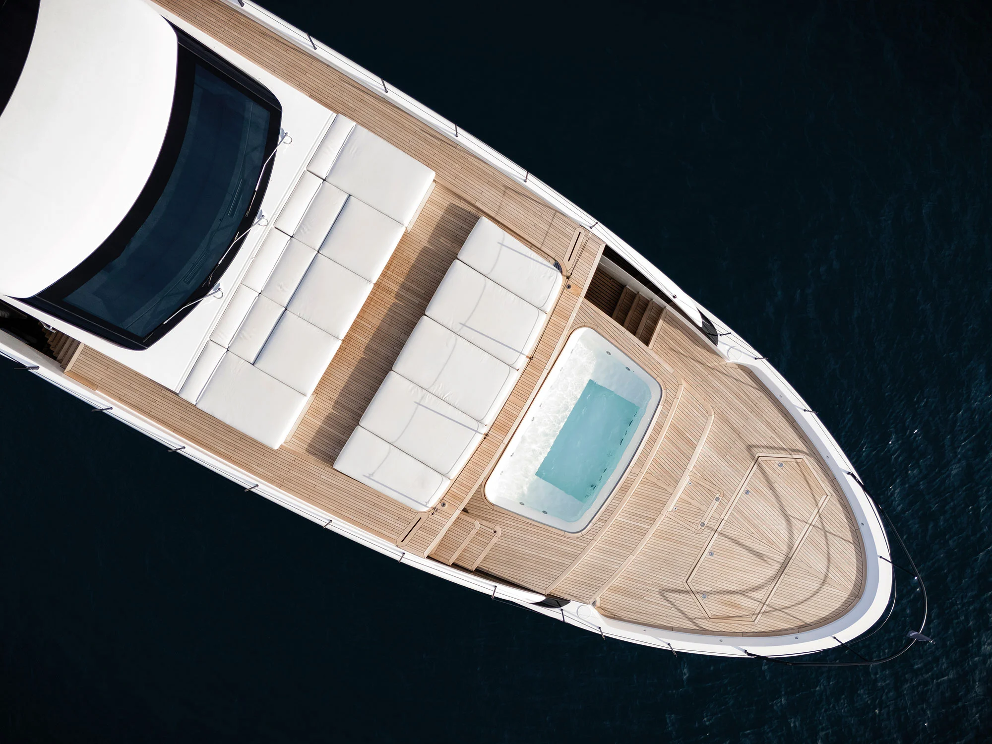 The mezzanine houses the wheelhouse, which leads to the flybridge that includes an outside dining area and a sunbathing lounge.