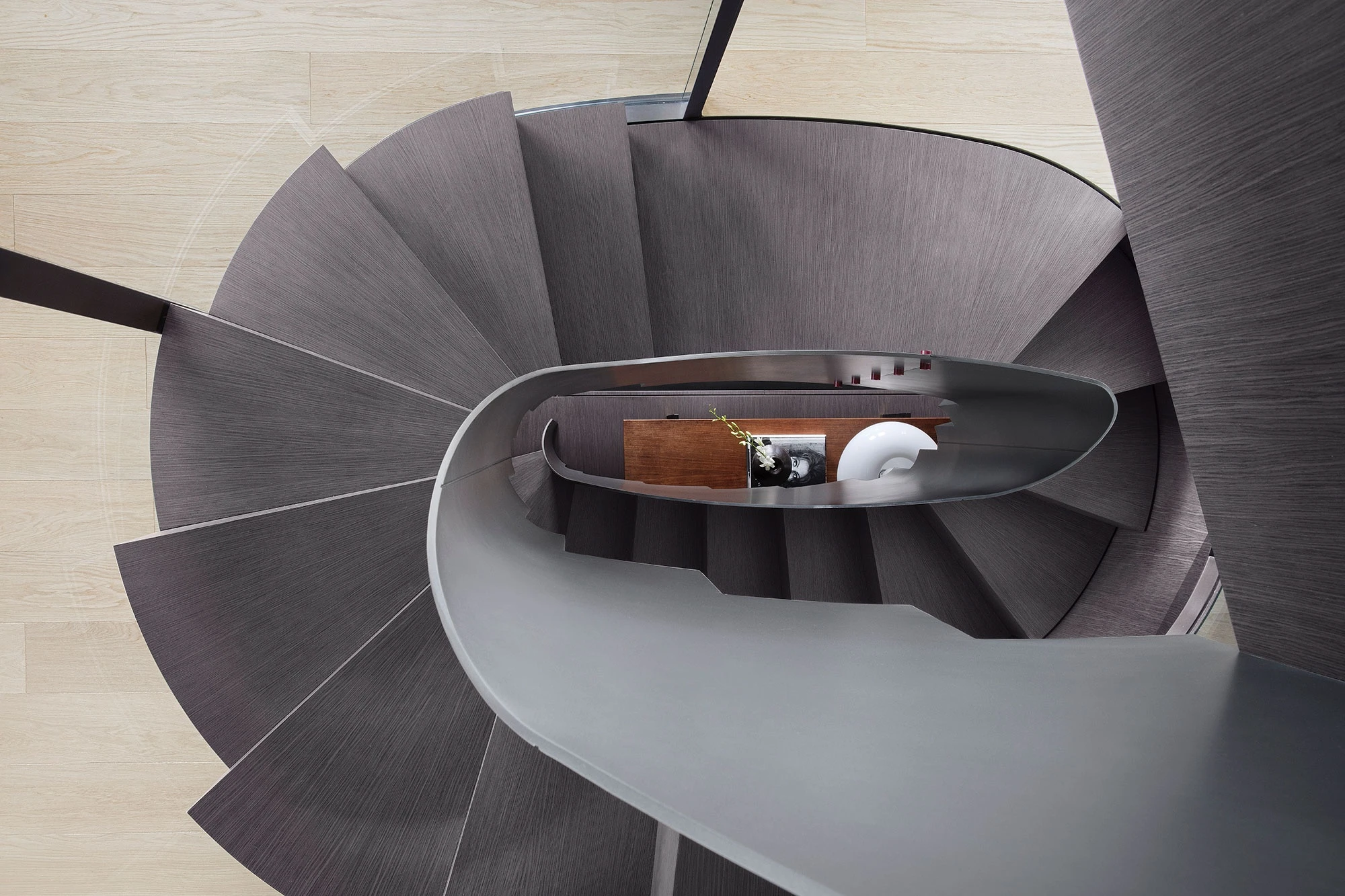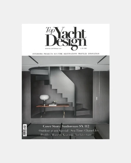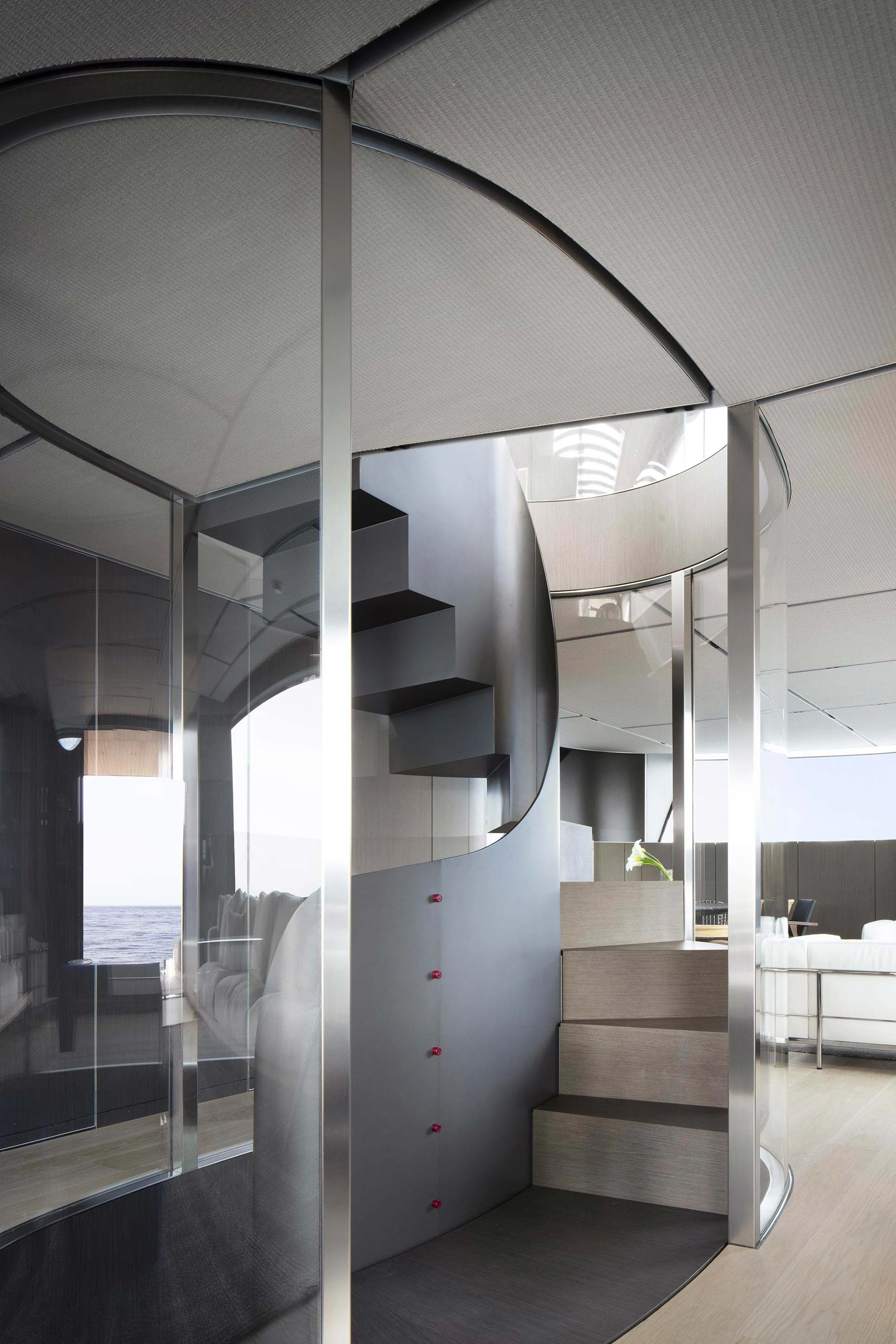 The staircases are once again a fundamental and characteristic feature of Lissoni’s design. The helical internal staircase extends for three levels to connect the decks, and on the main deck is enclosed in a transparent oval volume, like a precious treasure chest, that further enhances its presence and makes it appear suspended in mid-air. The external staircases have a clean and essential design in keeping with the principles of racing yachts.