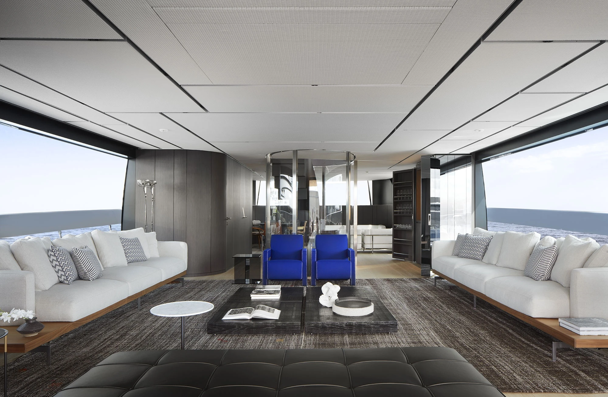 In tune with the concept developed for the other models, the main deck has been organized as an open plan space that reinterprets the concept of a yacht interior, extending as one single and continuous context from stern to bow, with a living area adjacent to a bar zone and followed by one of the dining areas, in a seamless indoor-outdoor arrangement that is further accentuated by the large windows looking over the sea.